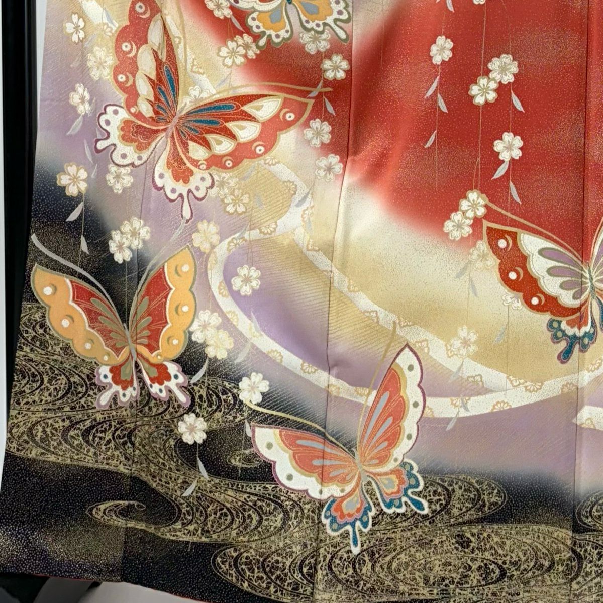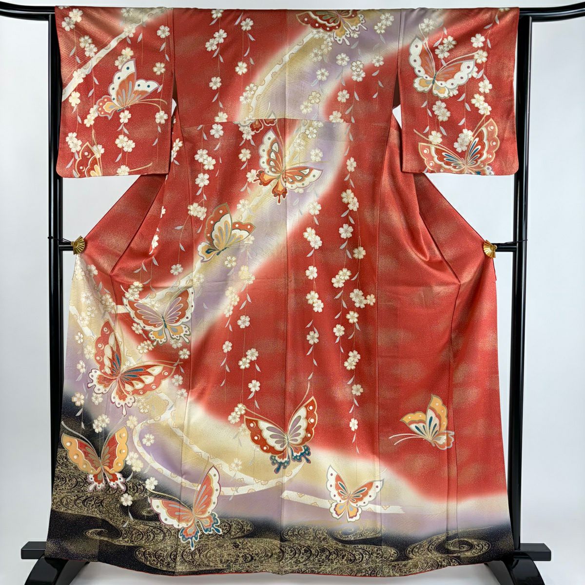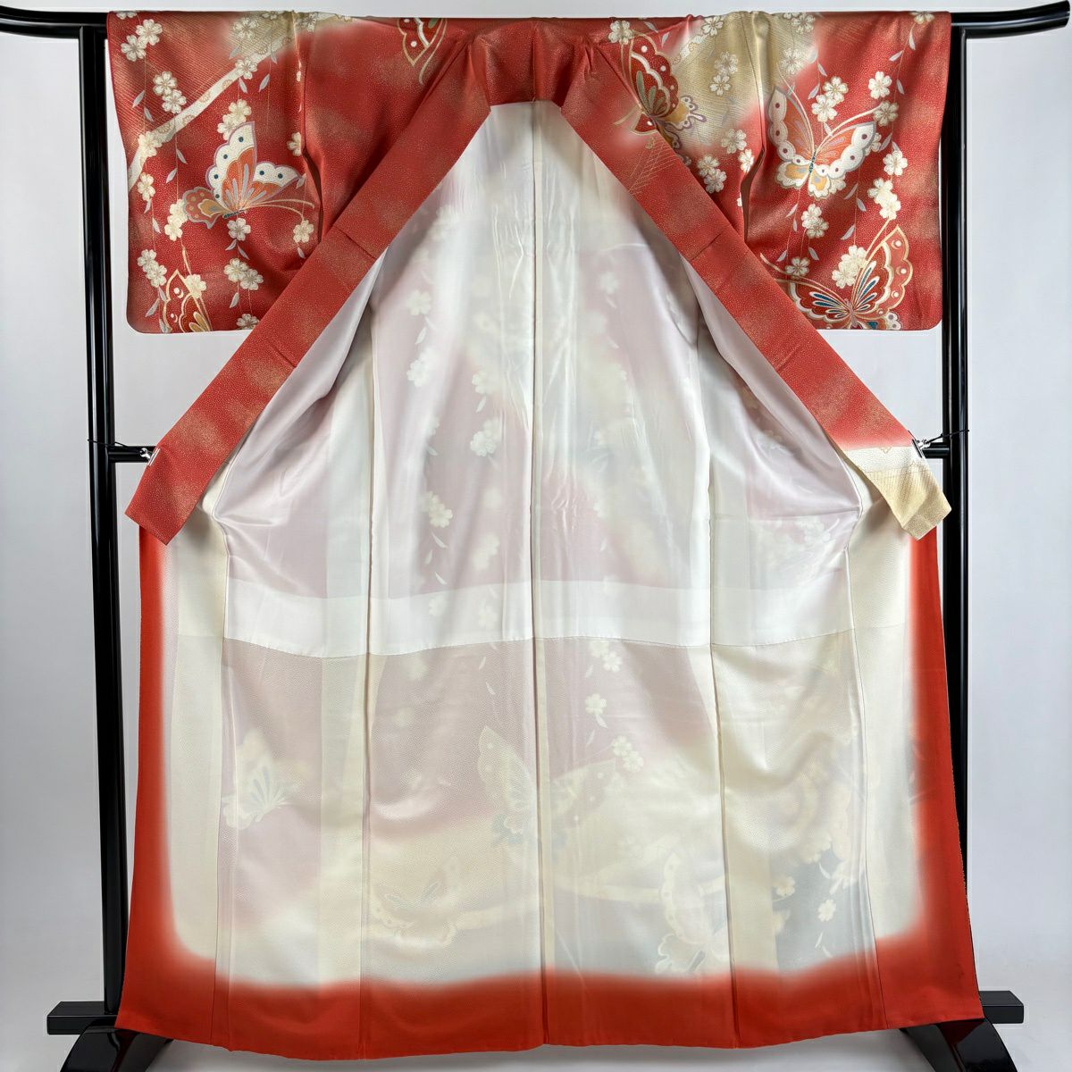 訪問着 身丈163.5cm 裄丈64cm M 袷 蝶 桜 金彩 赤 正絹 秀品