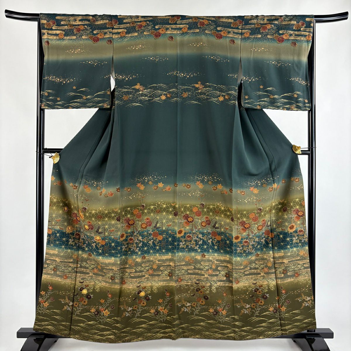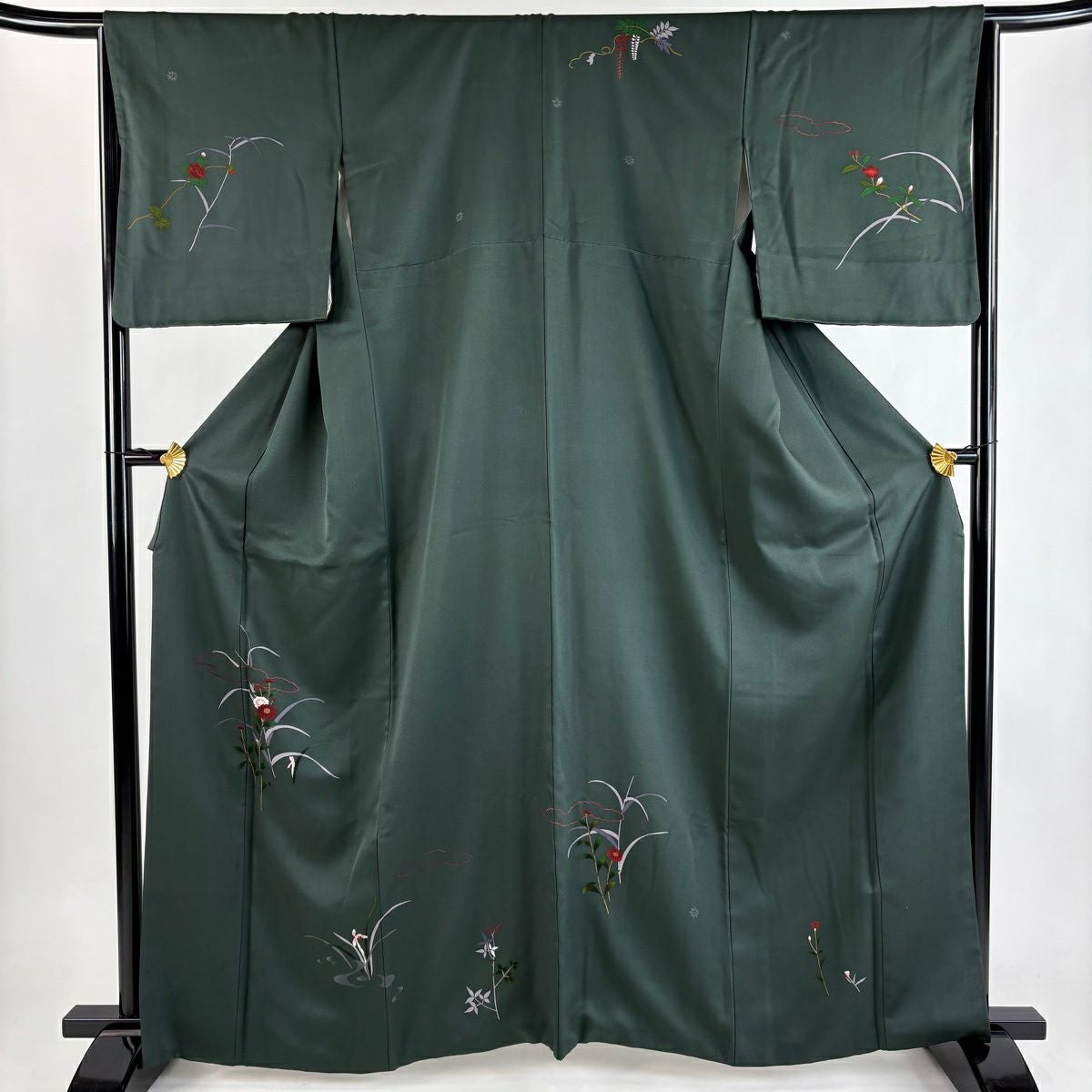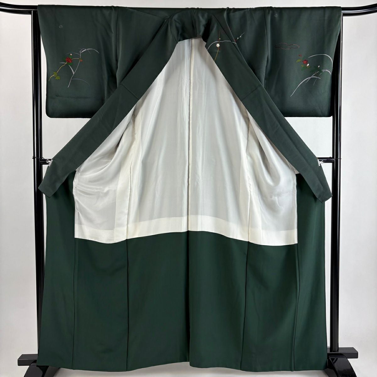 付下げ 身丈163cm 裄丈65.5cm M 袷 草花 雲文 深緑 正絹 秀品