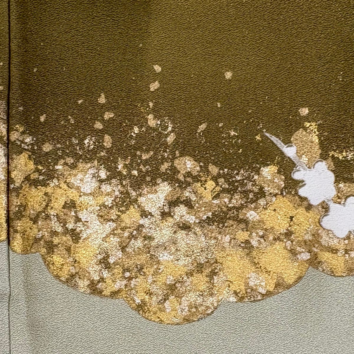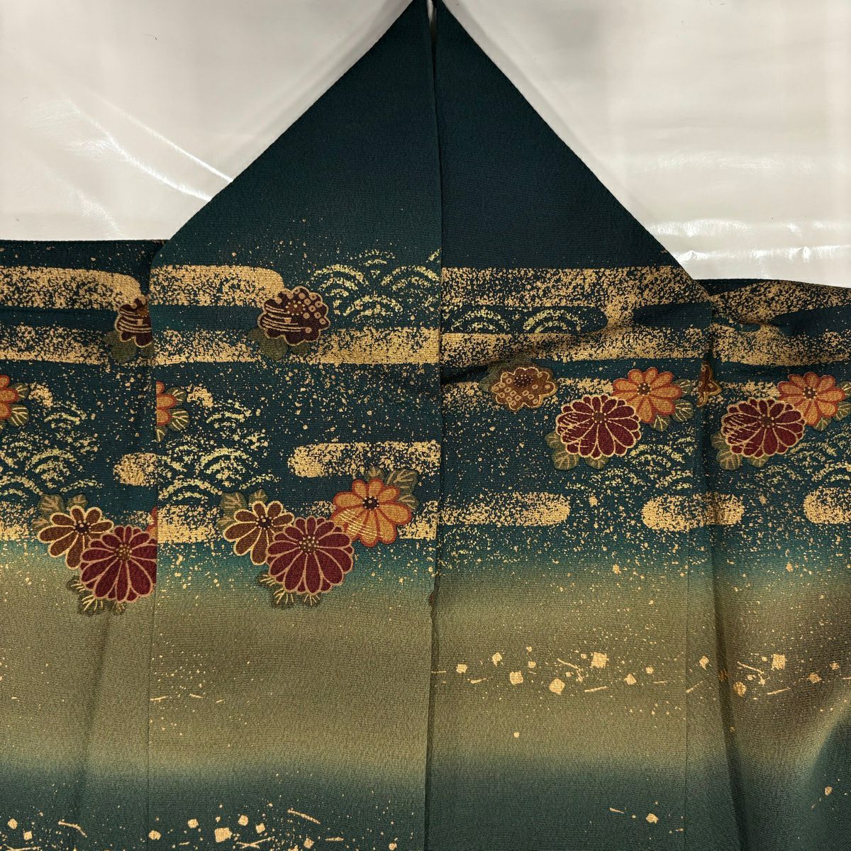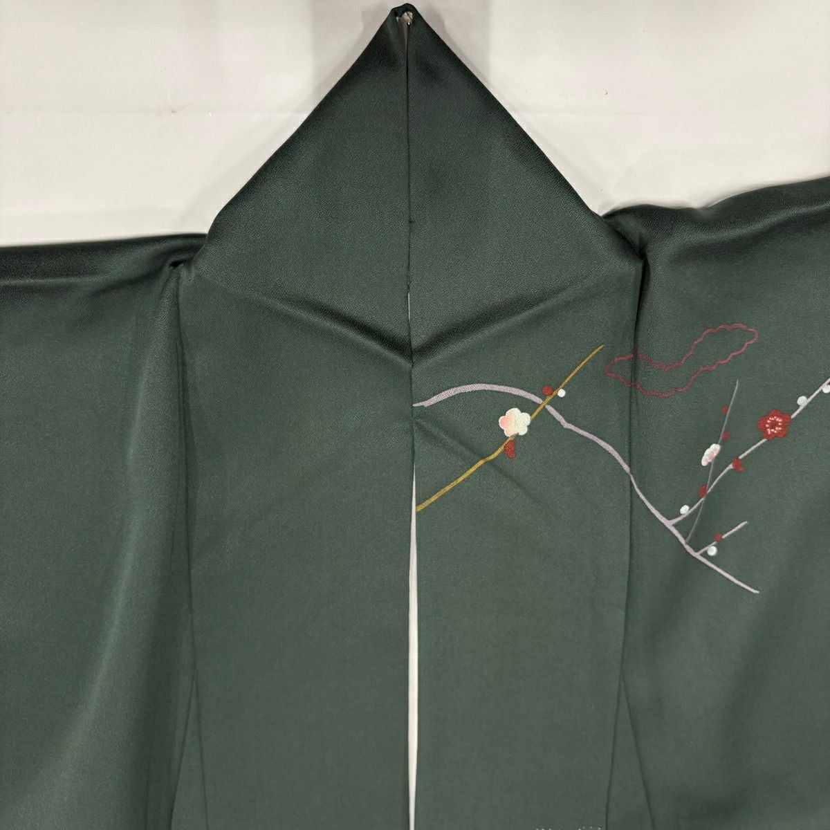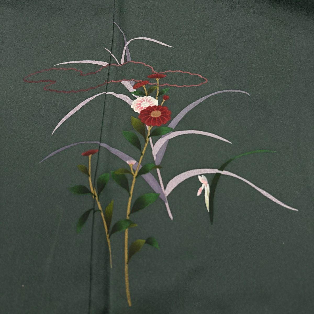 付下げ 身丈163cm 裄丈65.5cm M 袷 草花 雲文 深緑 正絹 秀品
