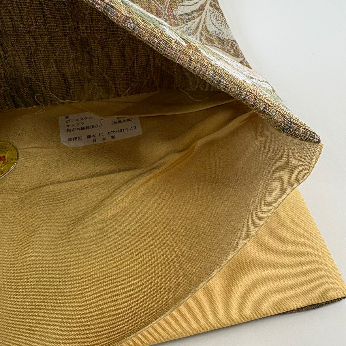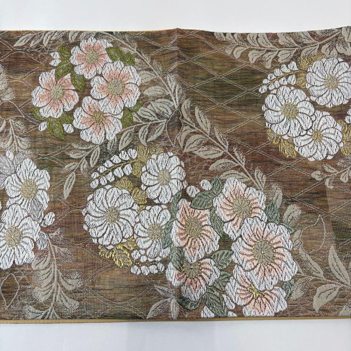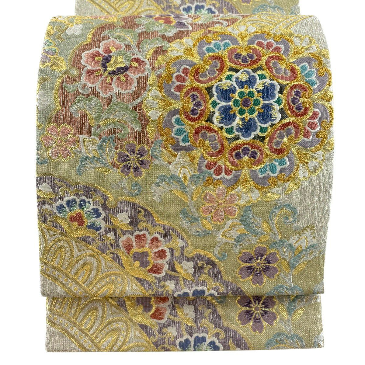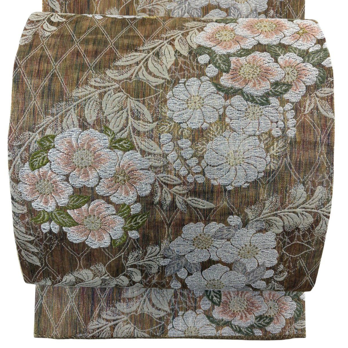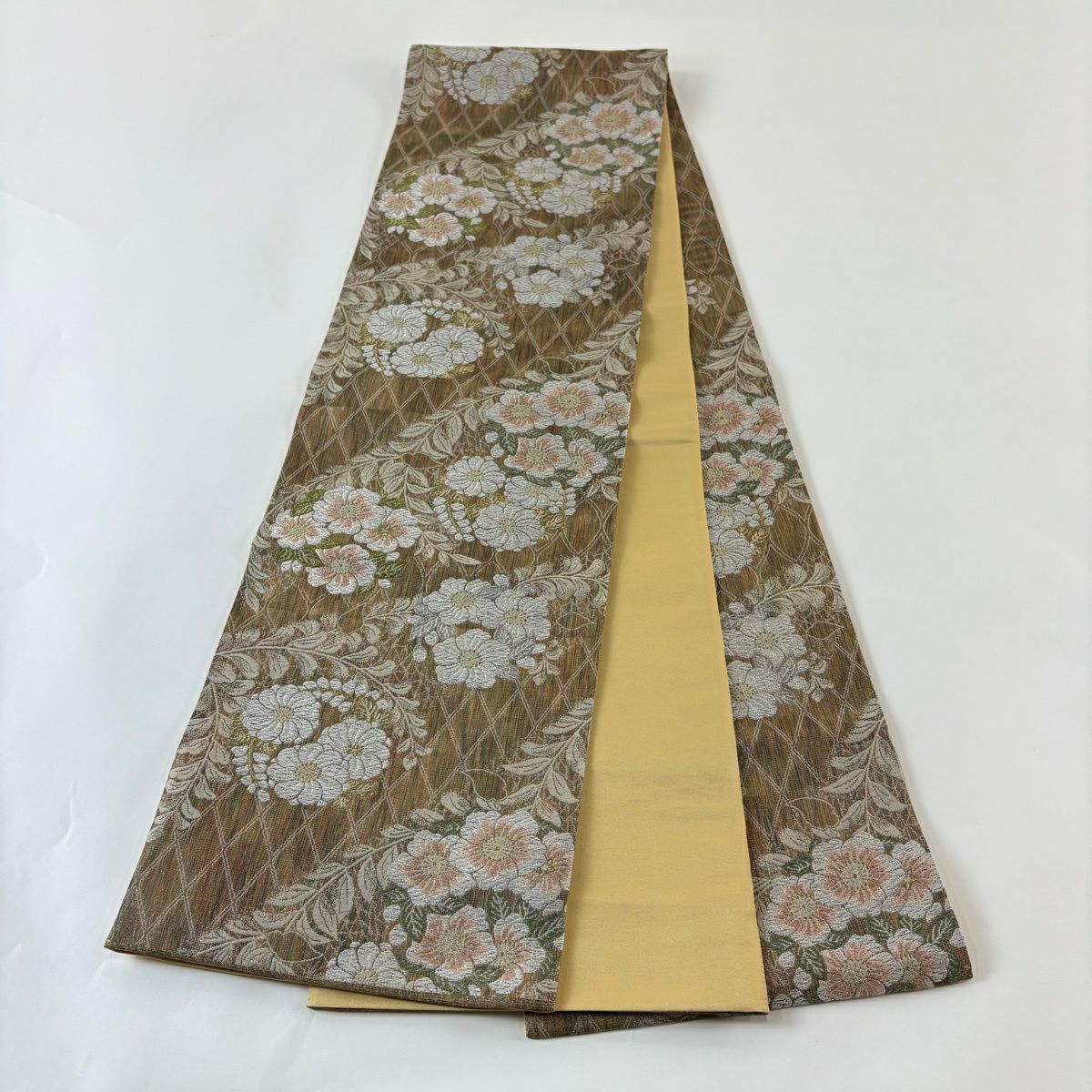 【美品】 袋帯 秀品 証紙あり 花丸文 菱 金銀糸 唐織 茶緑色 六通 正絹