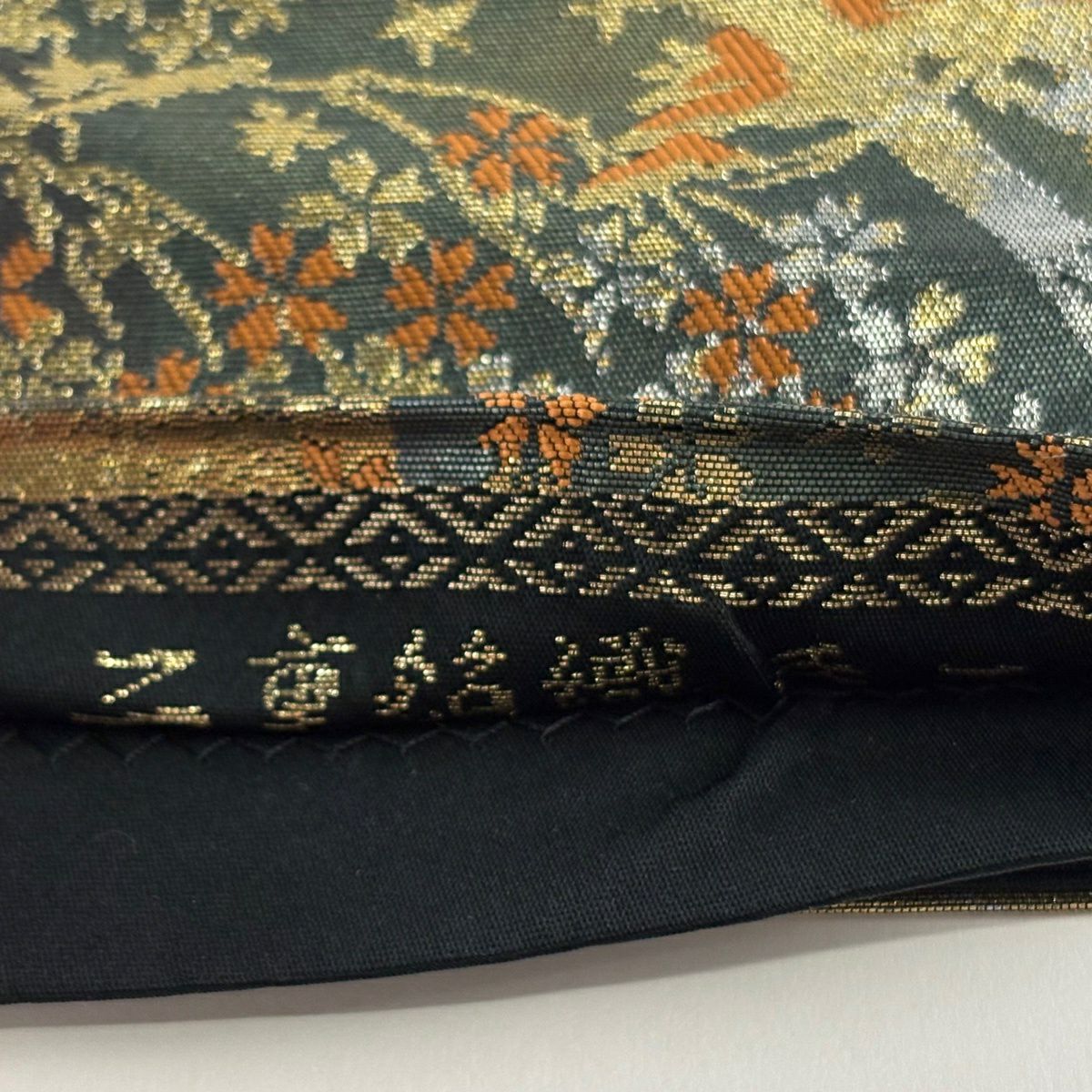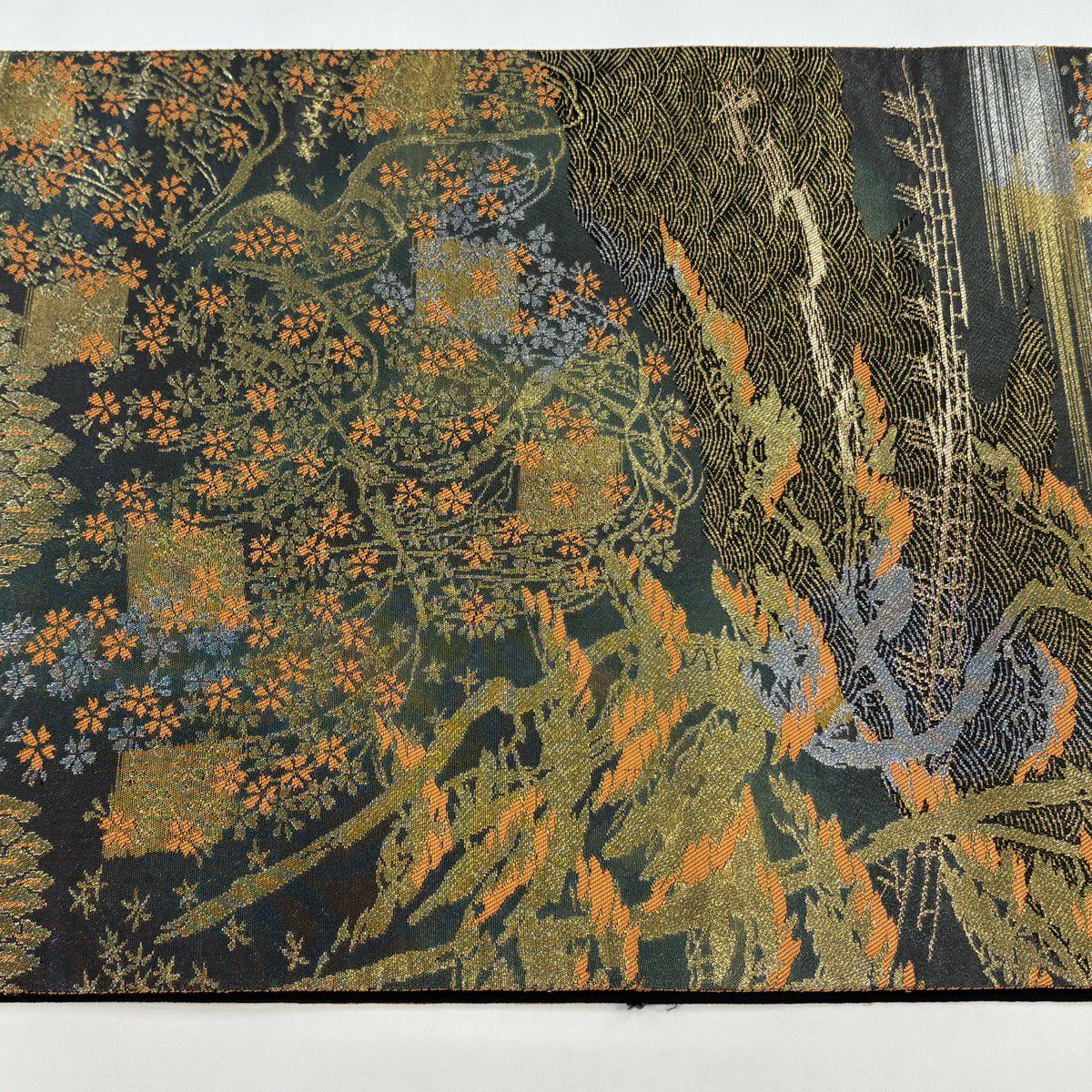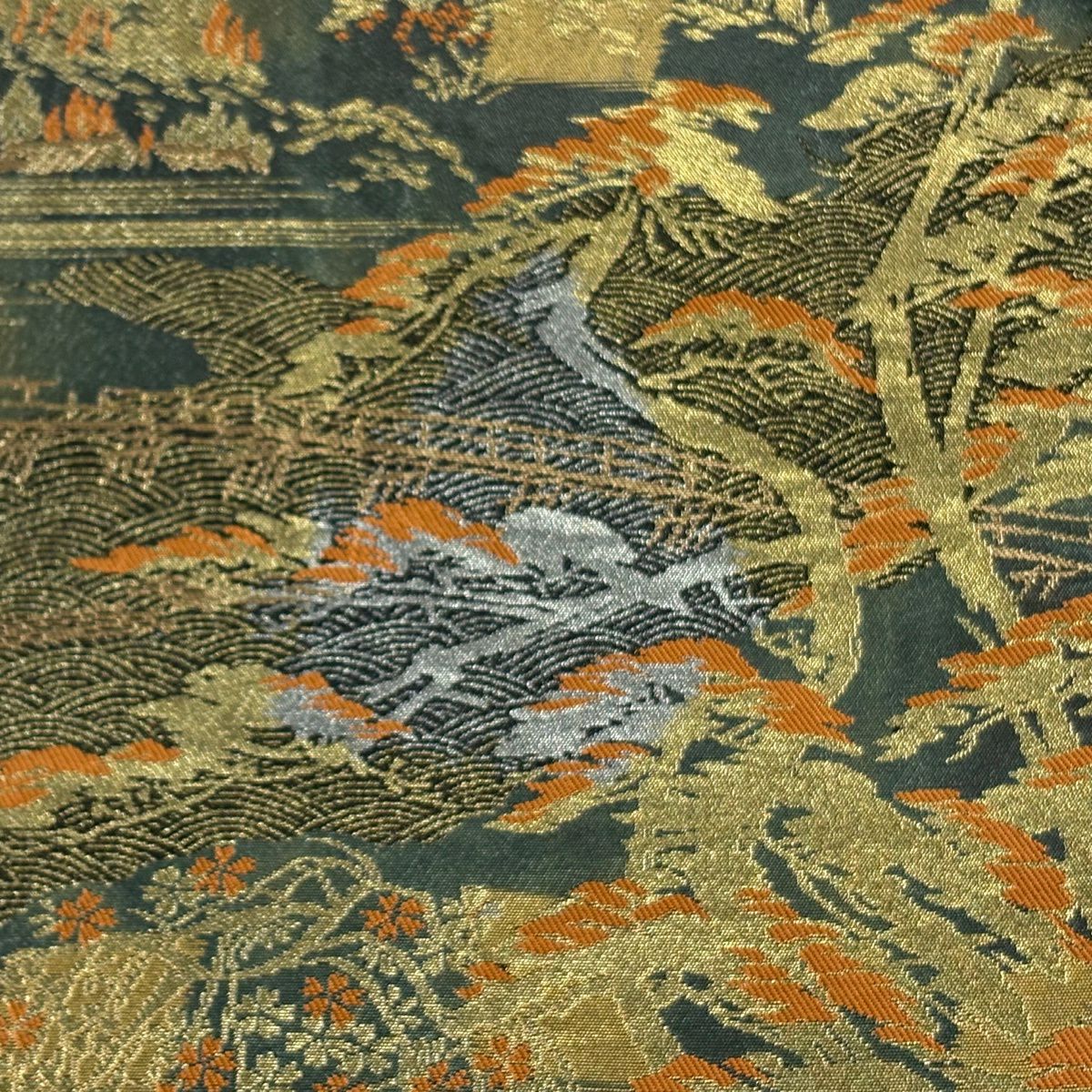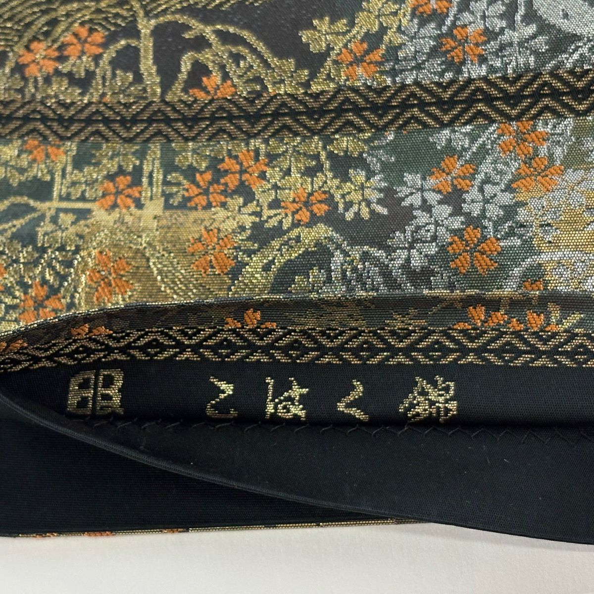 【美品】 袋帯 秀品 服部織物 落款あり 山並み 樹木 箔 金色 六通 正絹