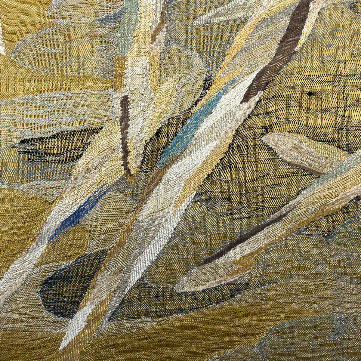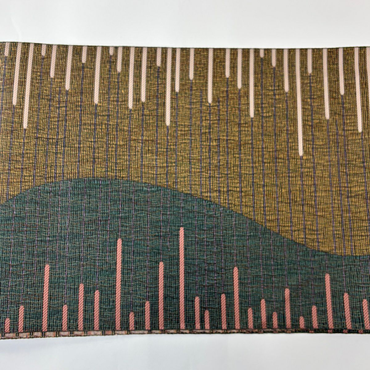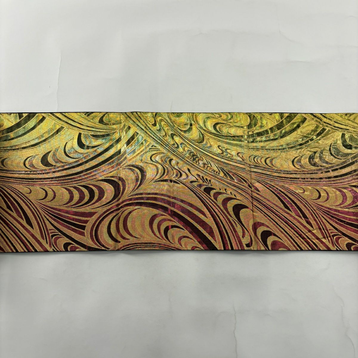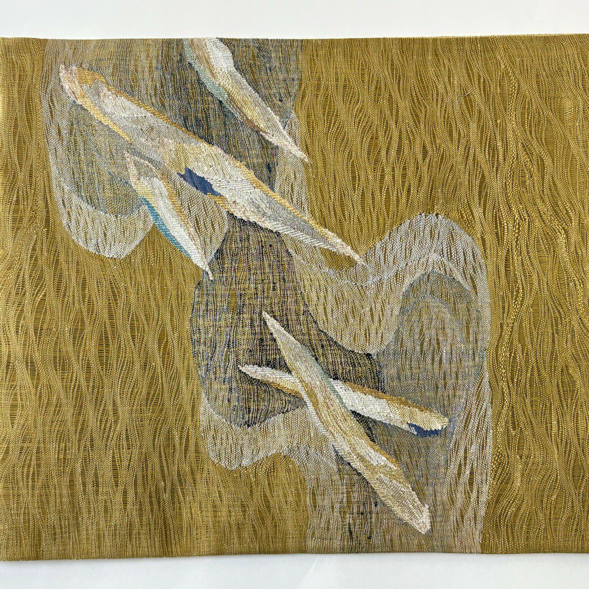 【美品】 袋帯 秀品 服部織物 落款あり 山並み 樹木 箔 金色 六通 正絹
