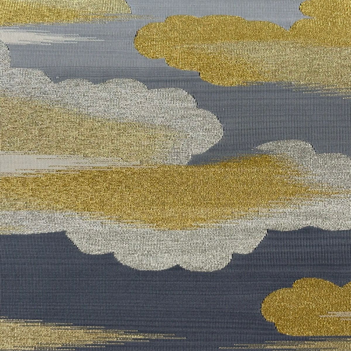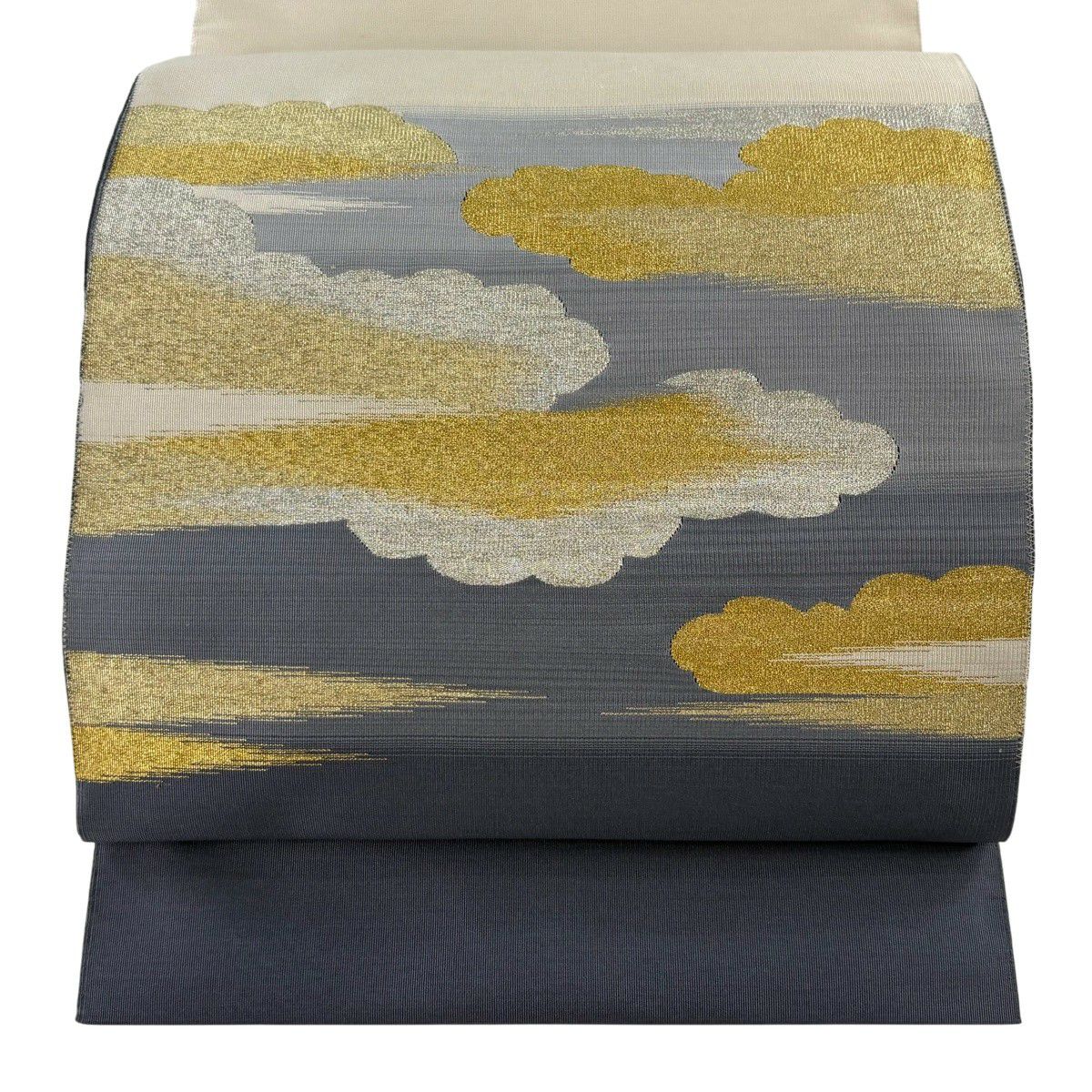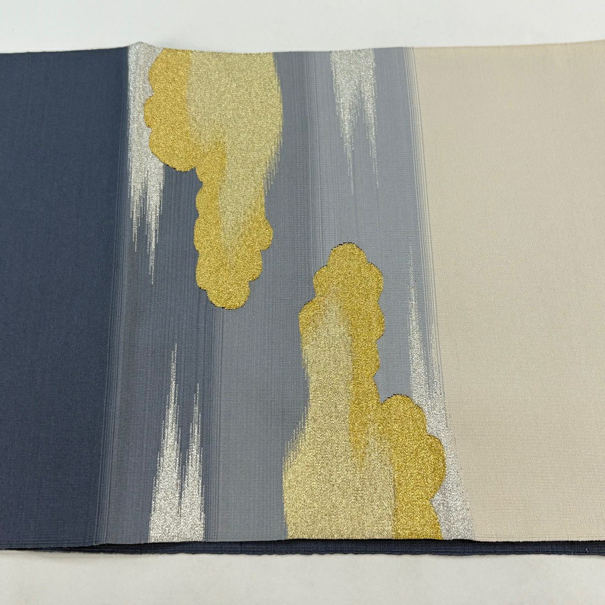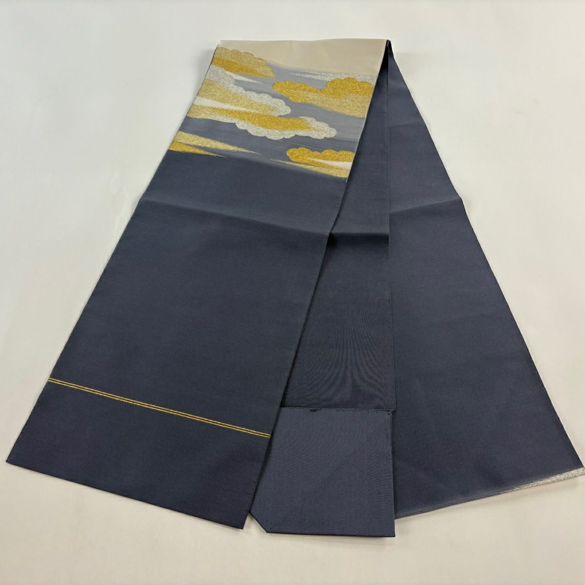 【美品】 名古屋帯 秀品 八寸名古屋帯 松葉仕立て 雲文 霞 金銀糸 青灰色 正絹