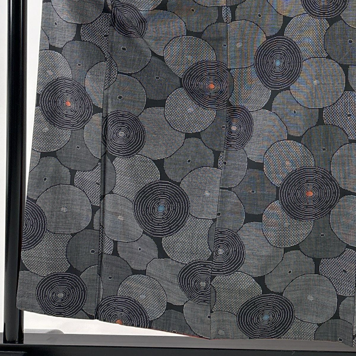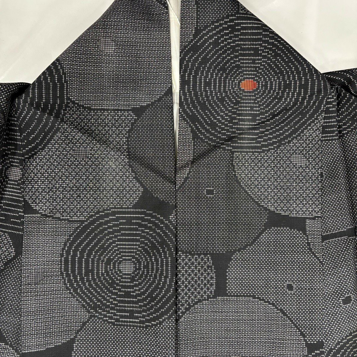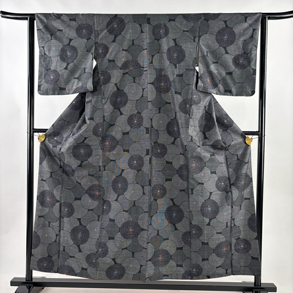 紬 身丈156.5cm 裄丈62cm S 袷 丸文 斜め格子 黒灰 正絹 秀品