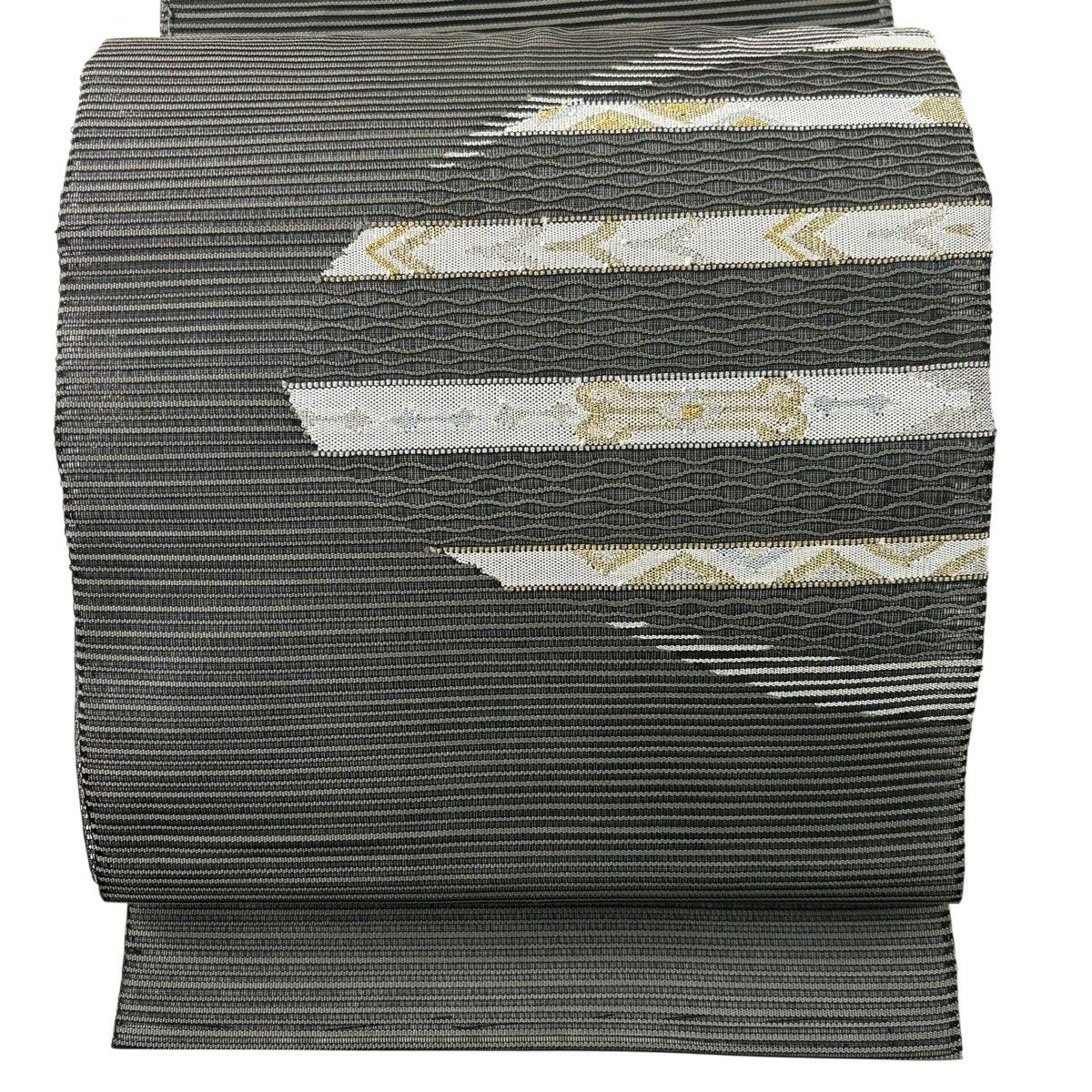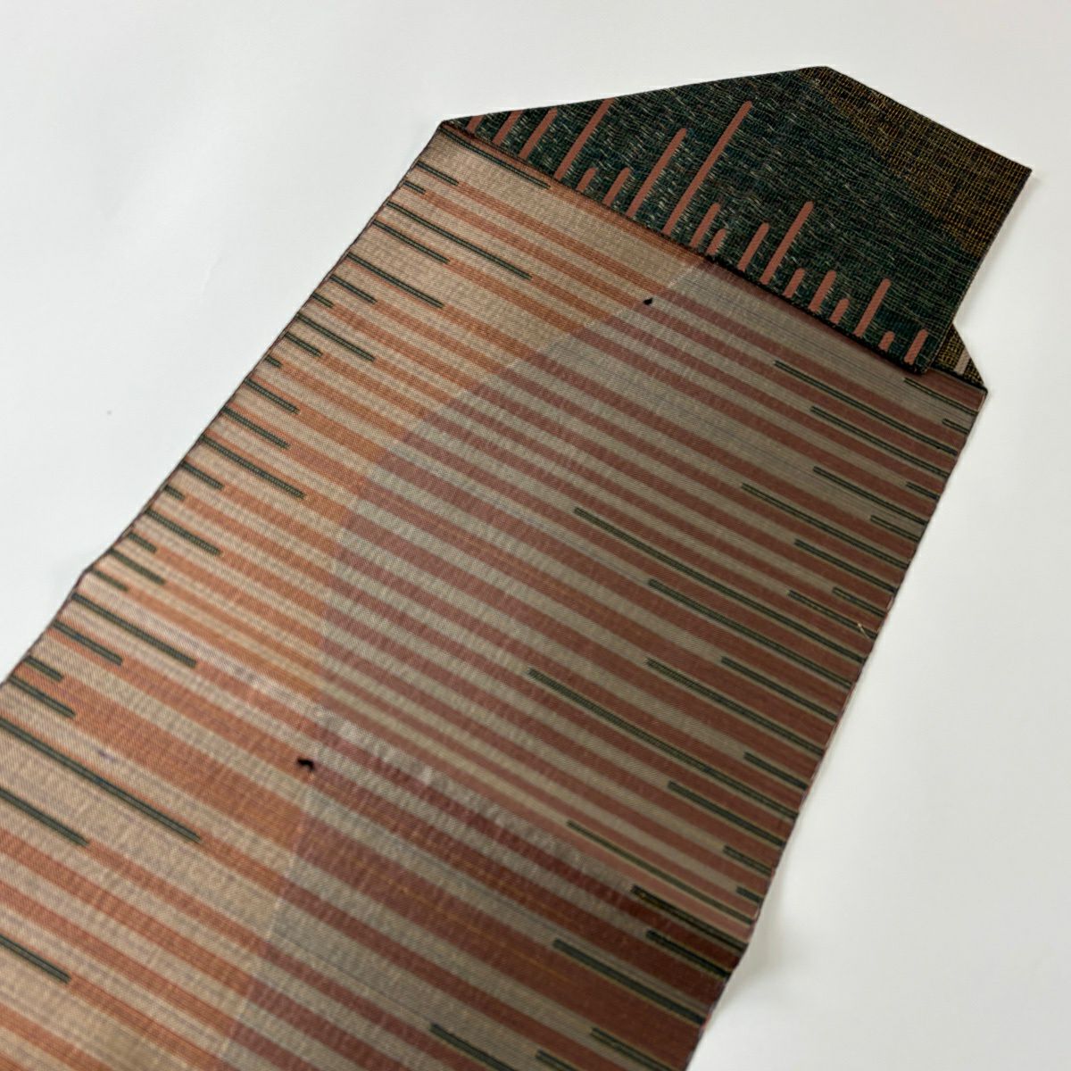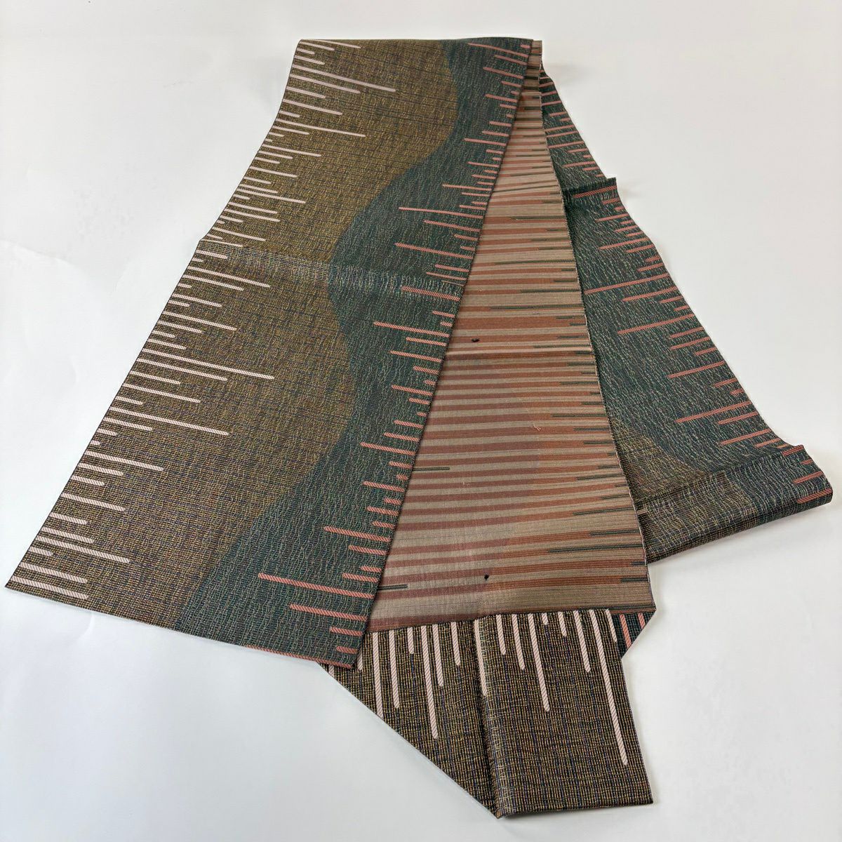 【美品】 名古屋帯 秀品 八寸名古屋帯 松葉仕立て 霞 よろけ縞 金糸 深緑 正絹