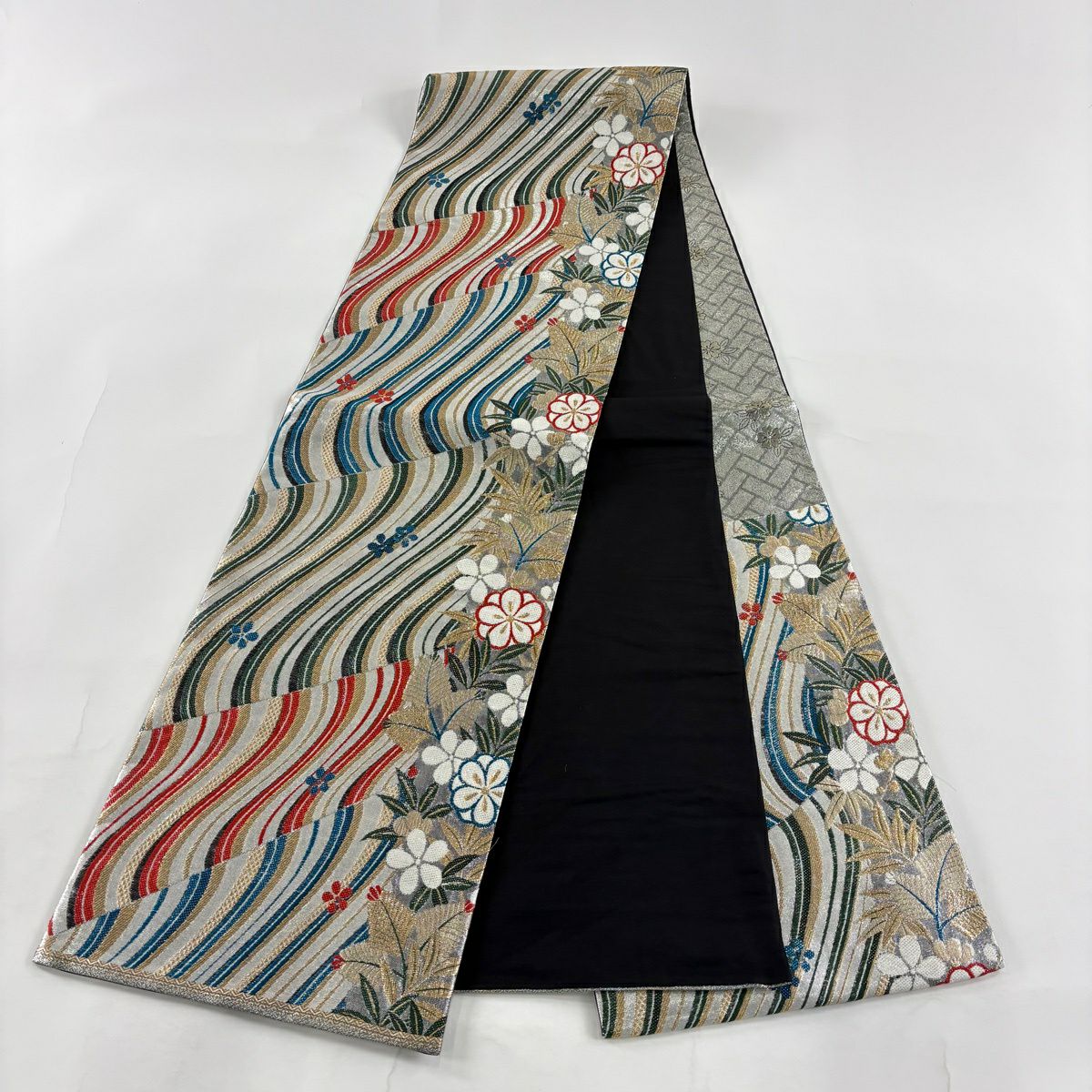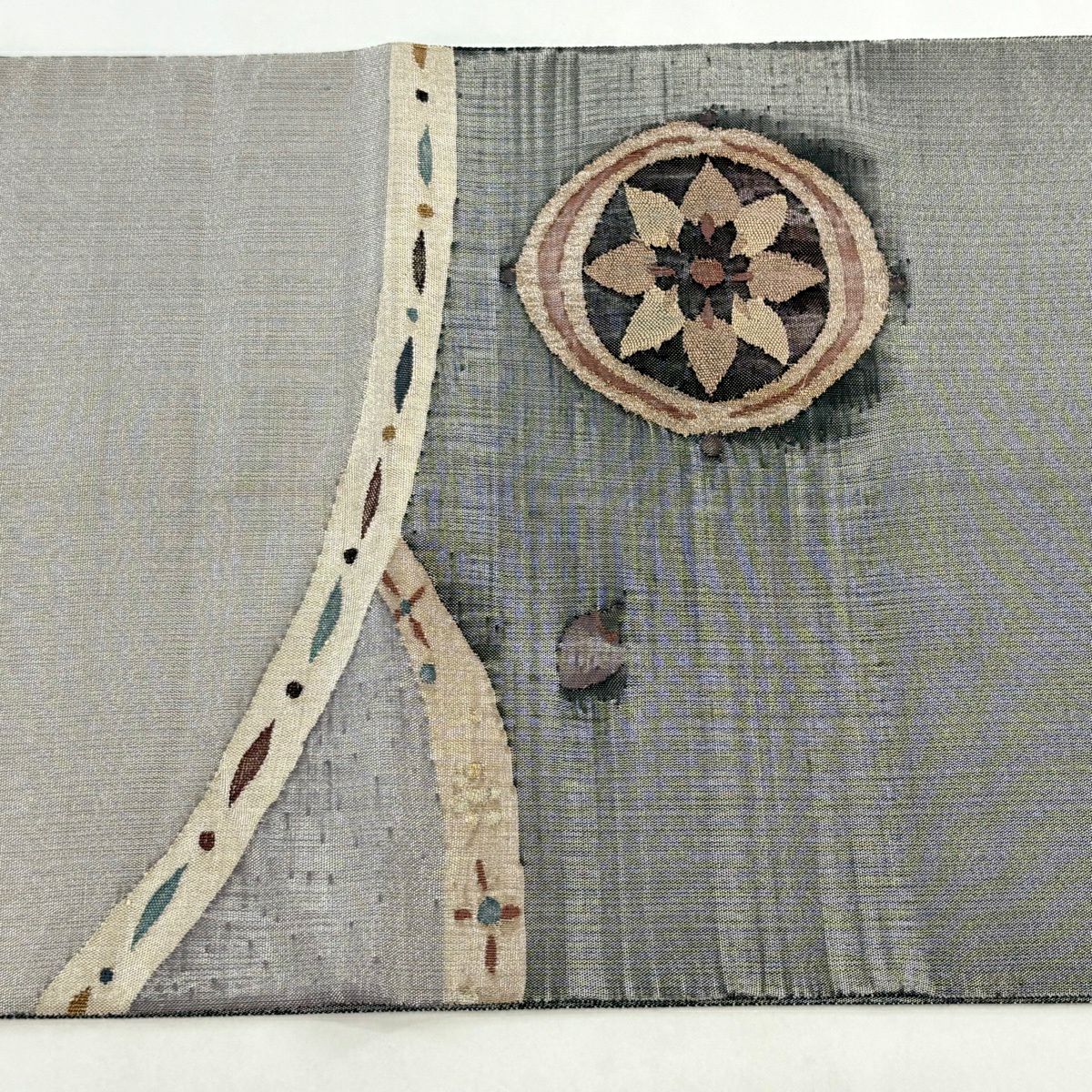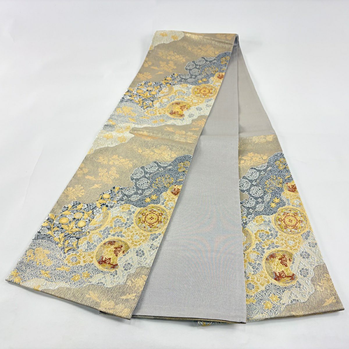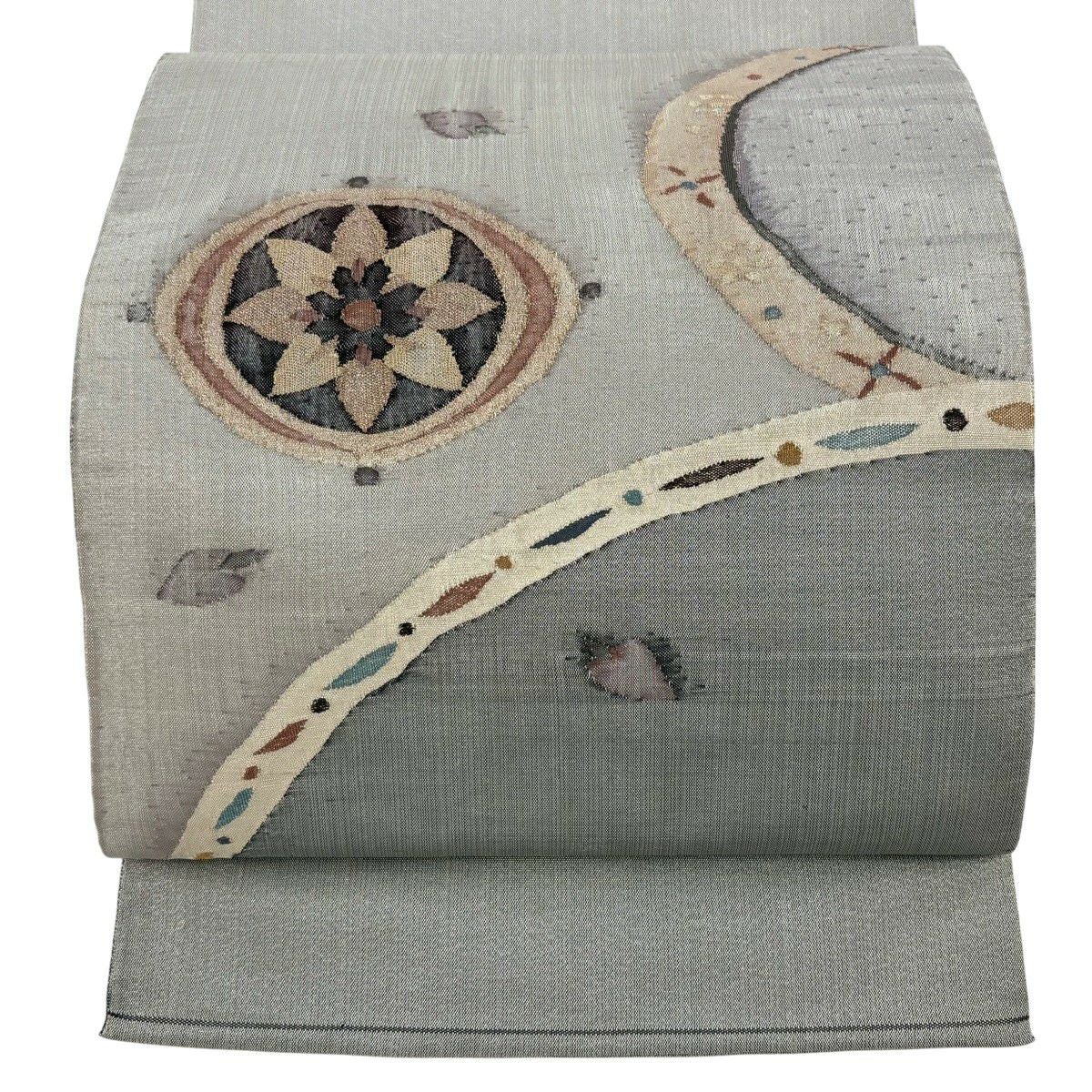 【美品】 袋帯 秀品 関西仕立て 花 幾何学模様 銀糸 灰茶 お太鼓柄 正絹