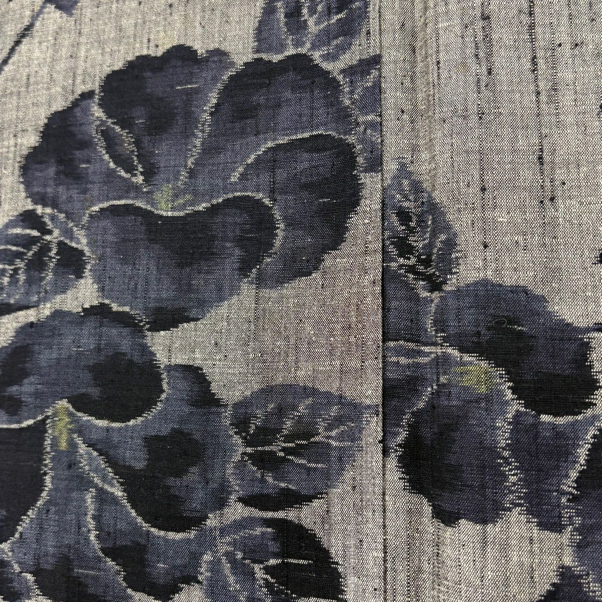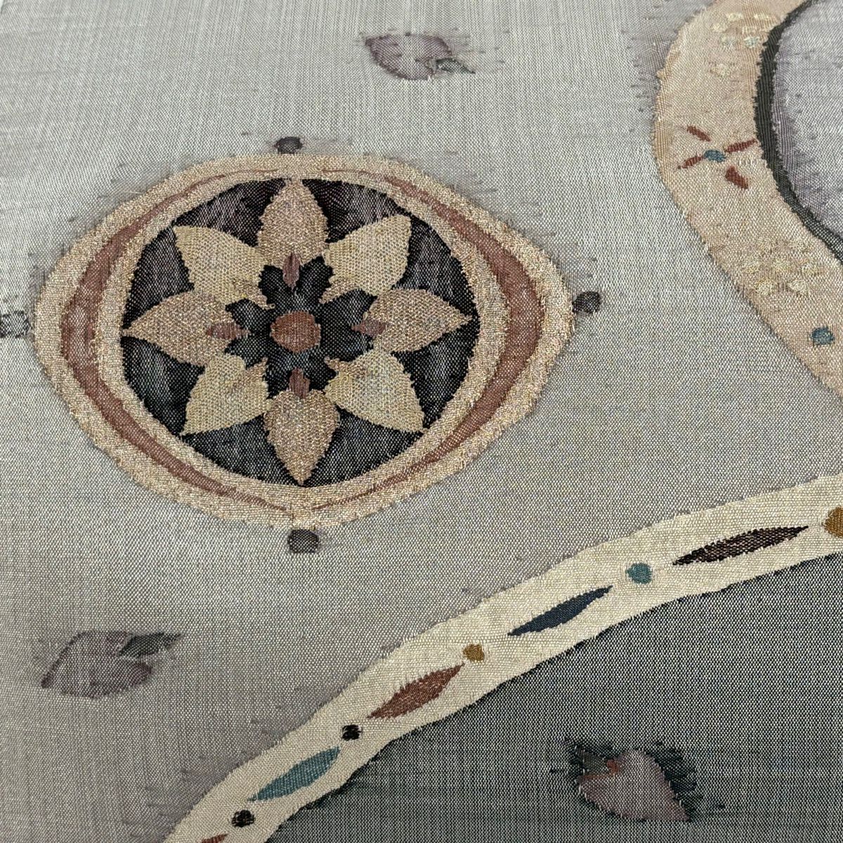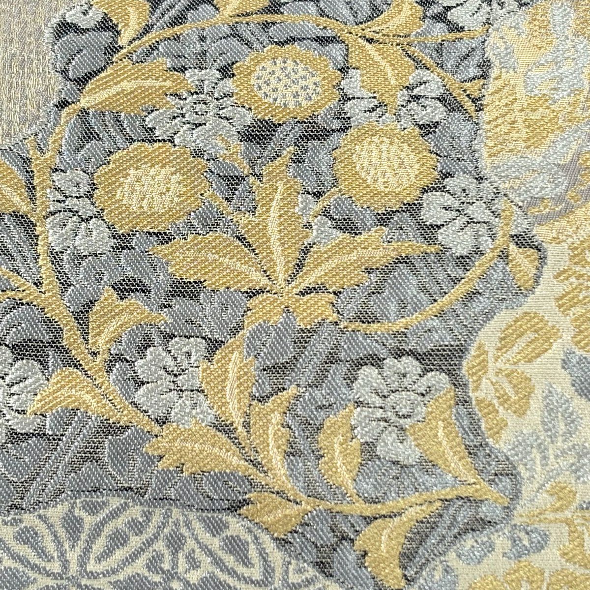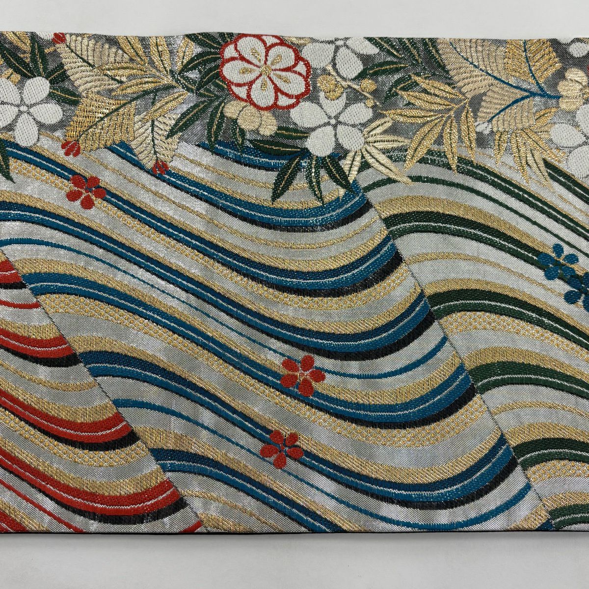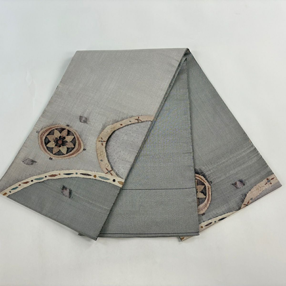 【美品】 袋帯 秀品 関西仕立て 花 幾何学模様 銀糸 灰茶 お太鼓柄 正絹