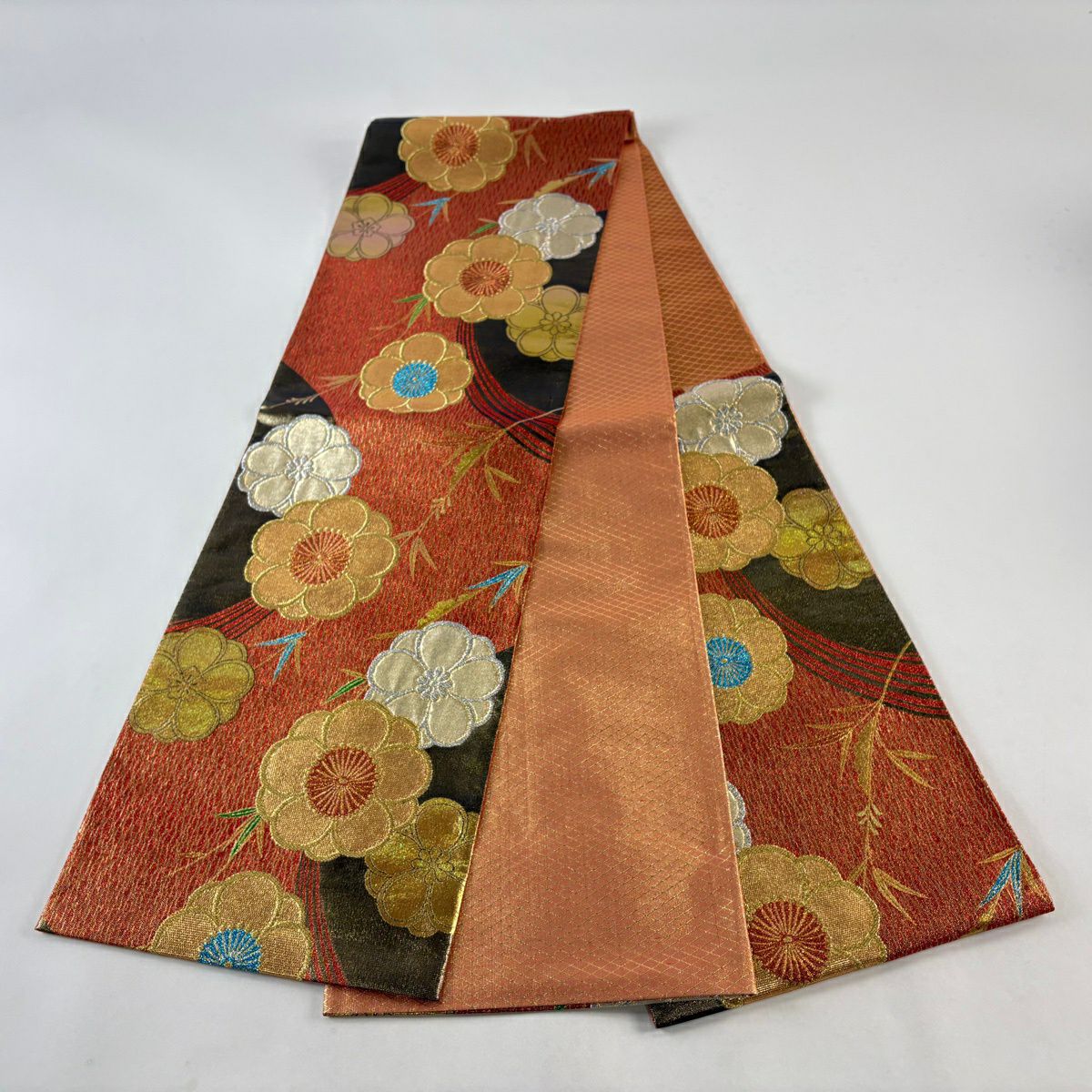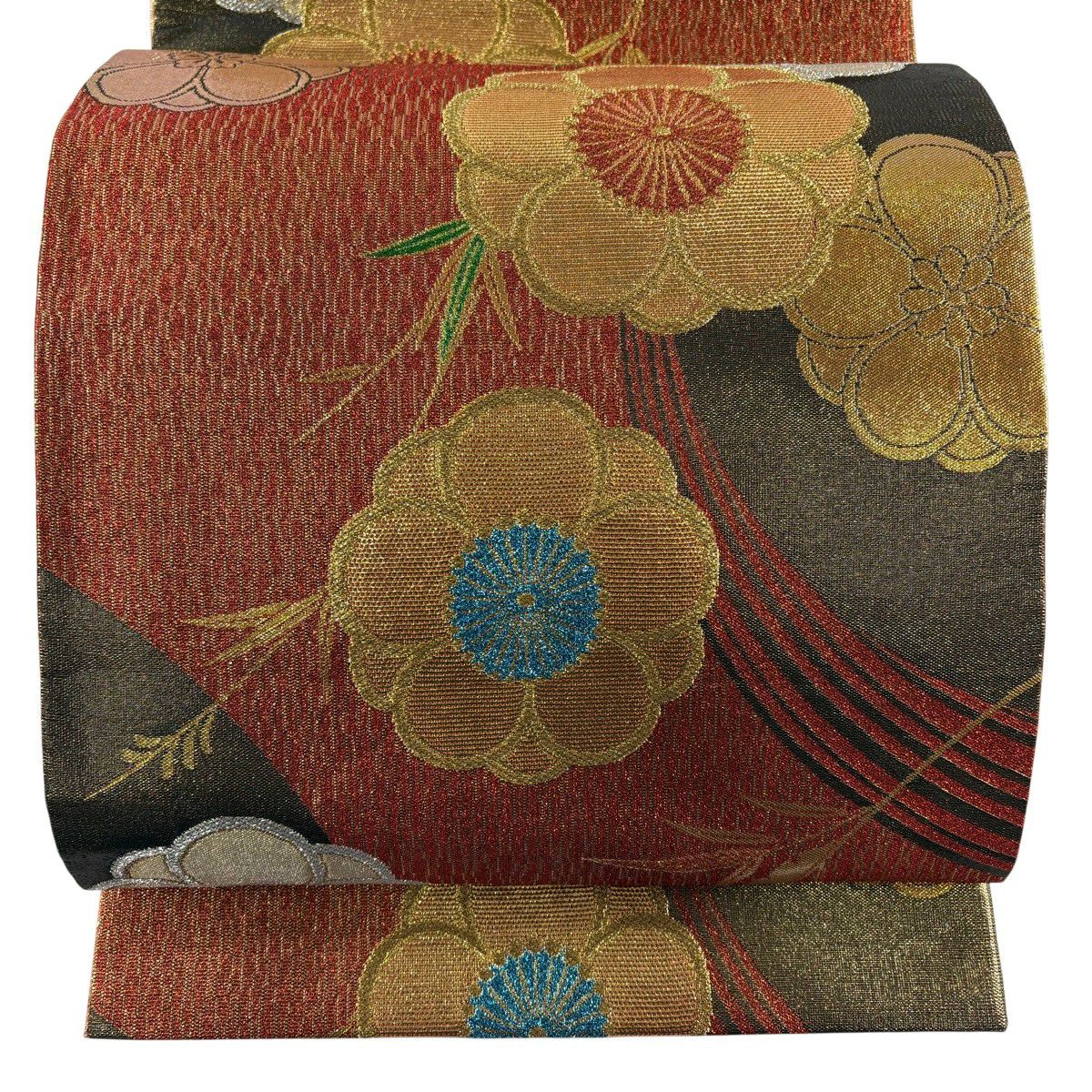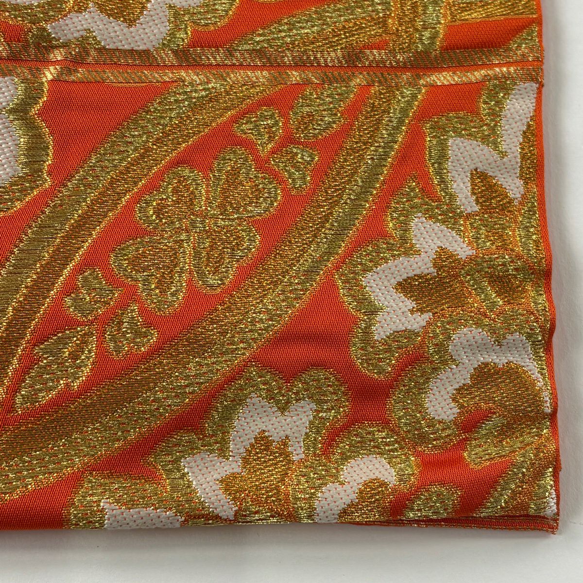 【美品】 袋帯 秀品 落款あり 振袖向き 草花 金銀糸 箔 朱色 六通 正絹