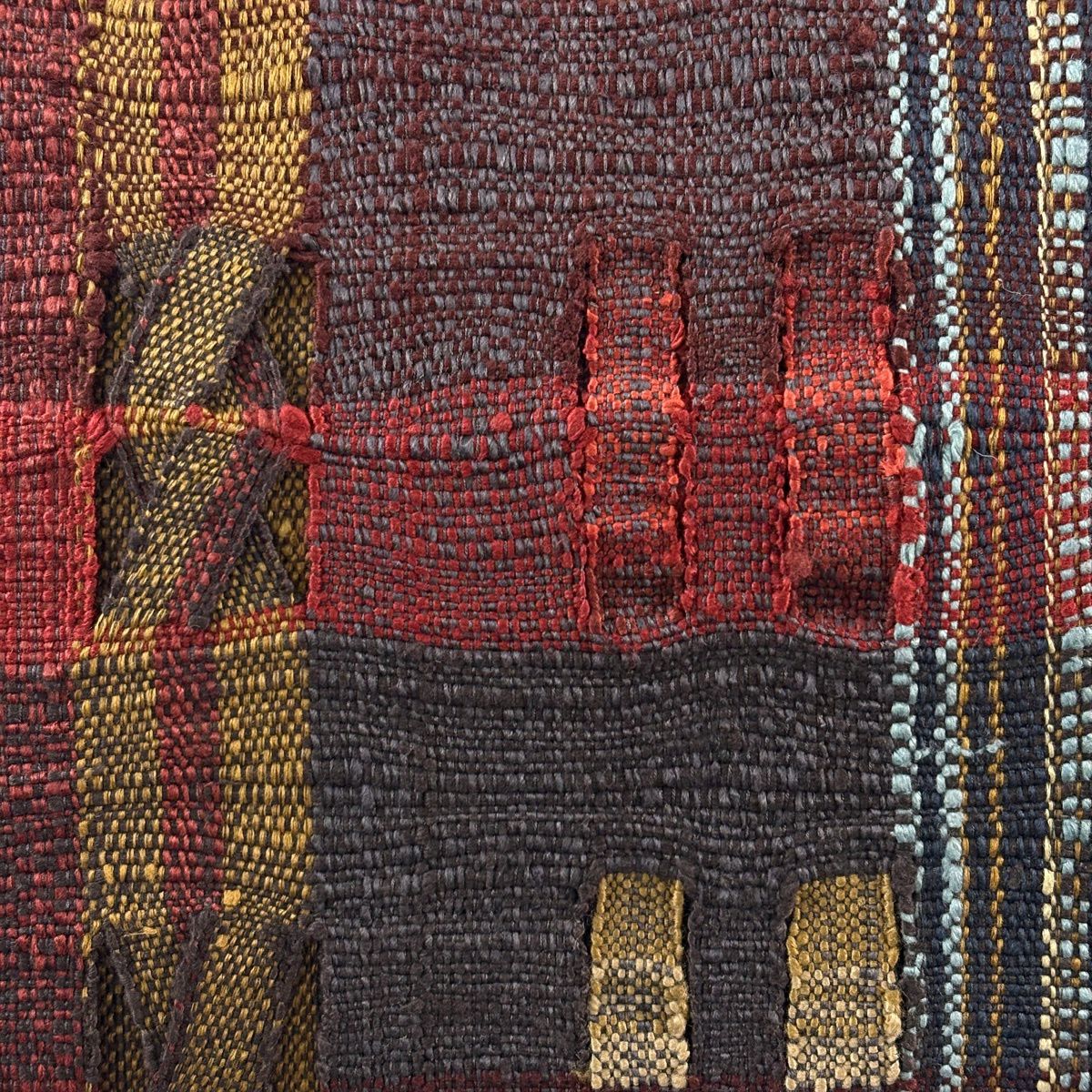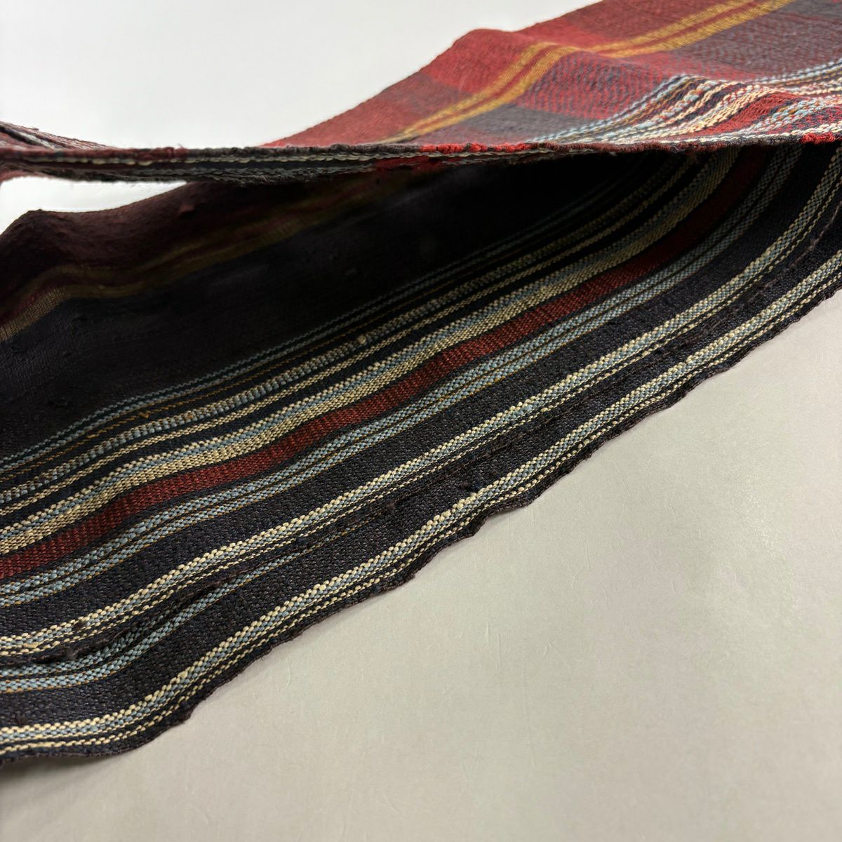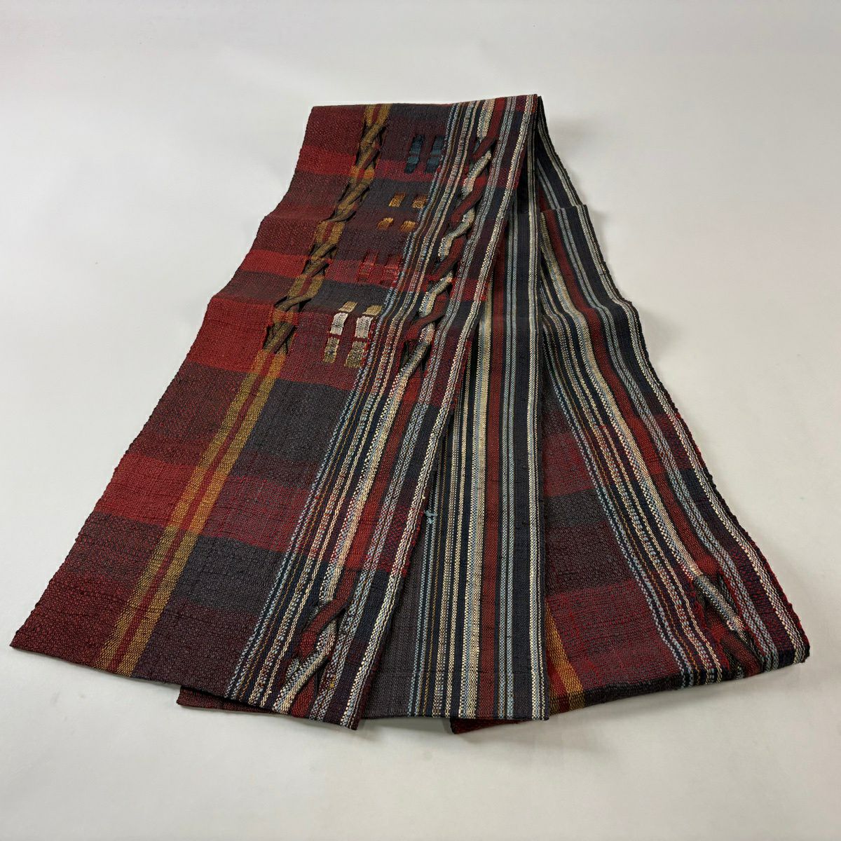 【美品】 名古屋帯 秀品 八寸名古屋帯 トンネル仕立て 幾何学模様 えんじ色 正絹