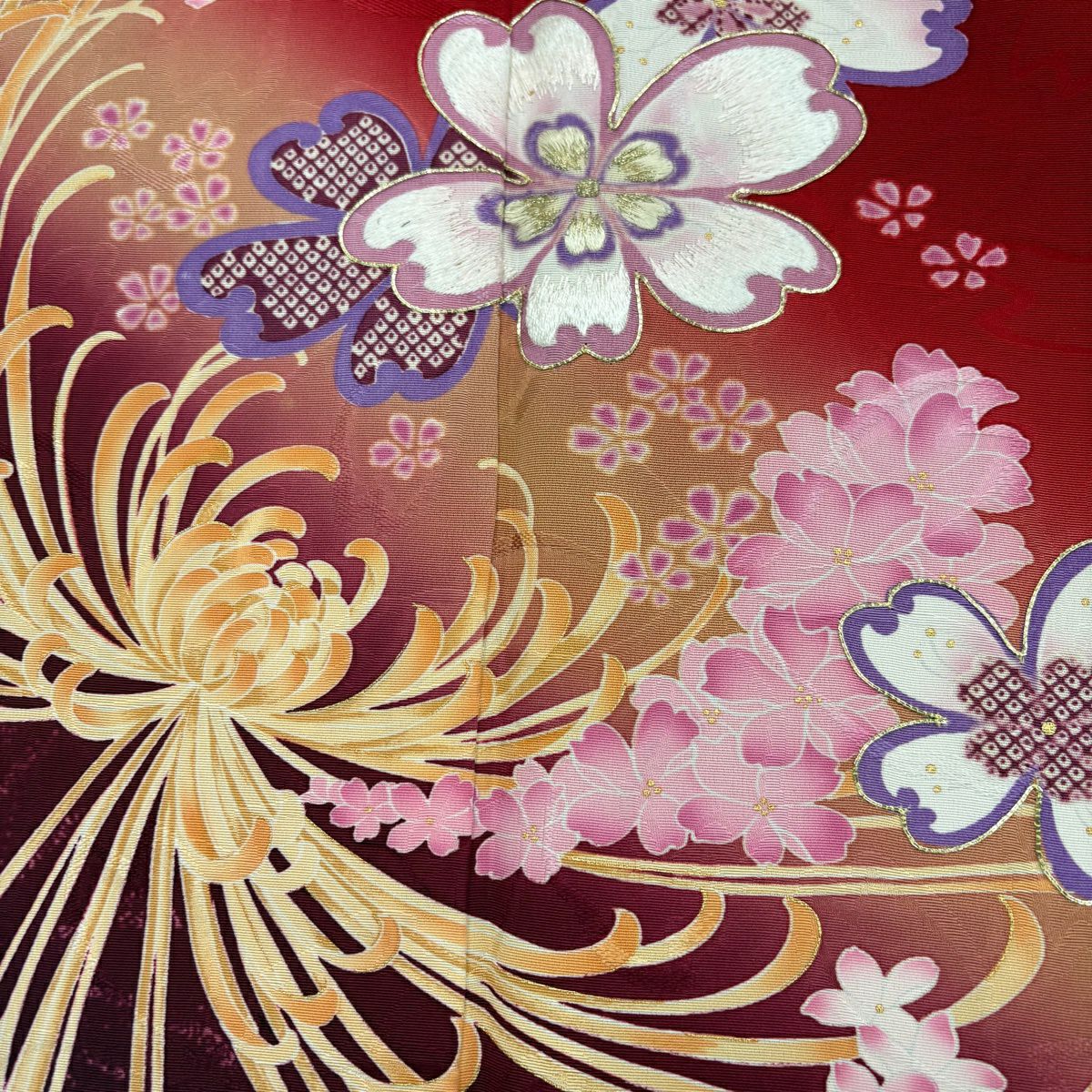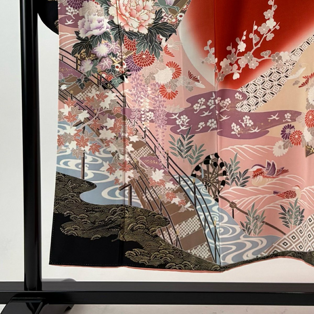 振袖 身丈153cm 裄丈60cm S 袷 橋 牡丹 金糸 金彩 赤 正絹 秀品