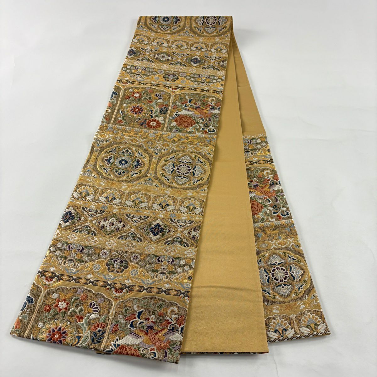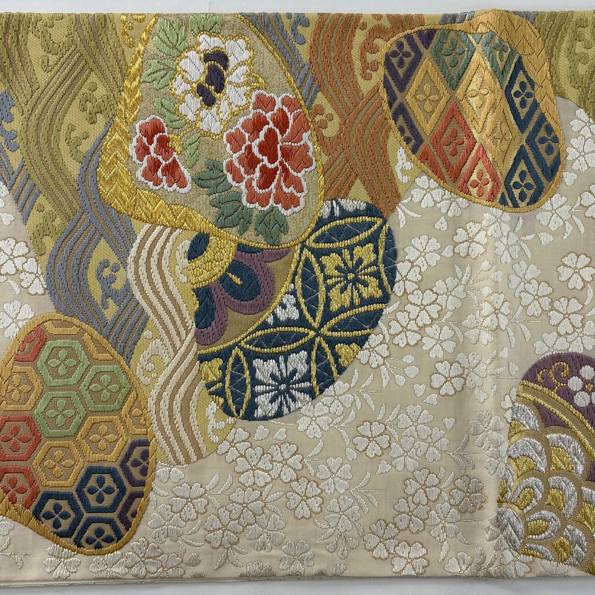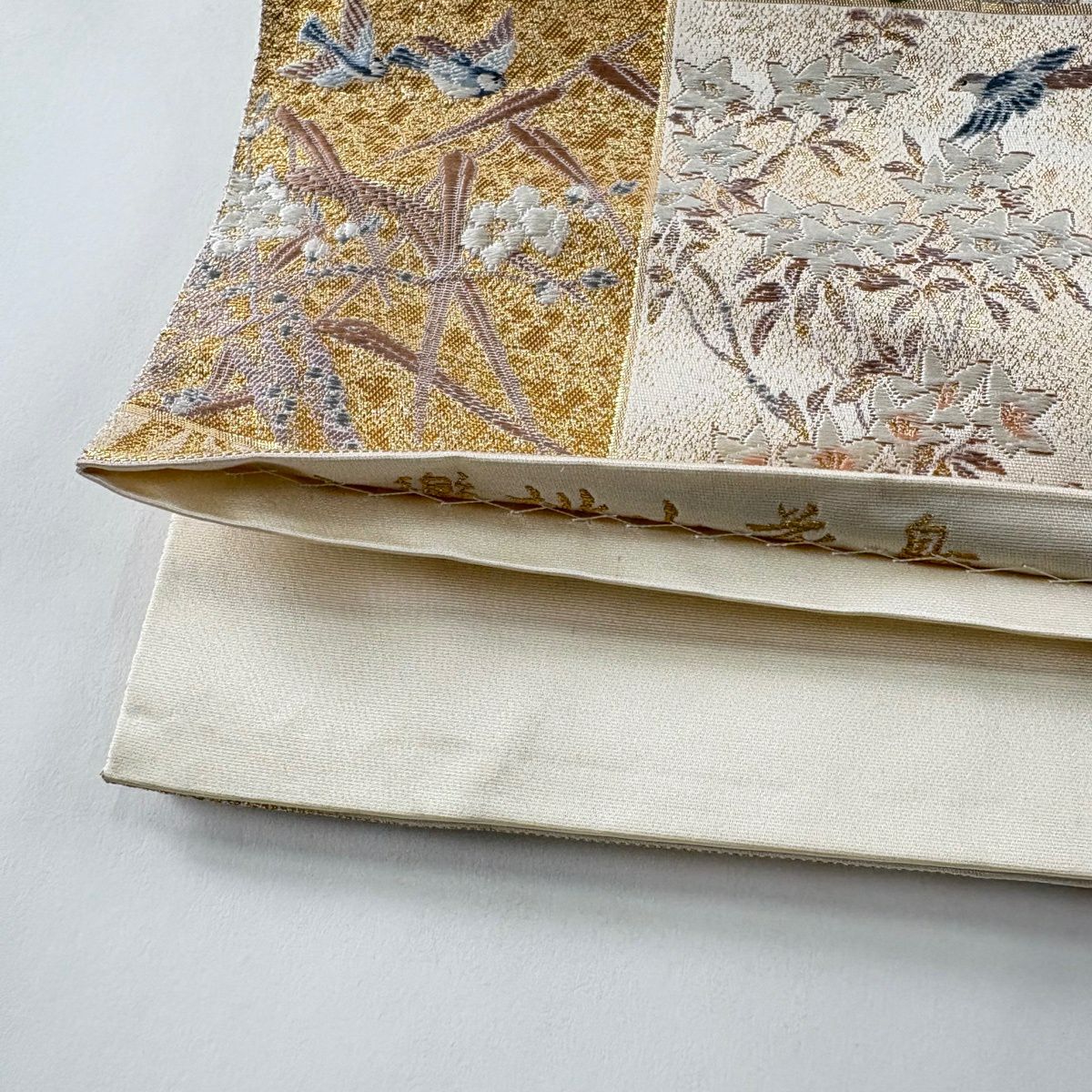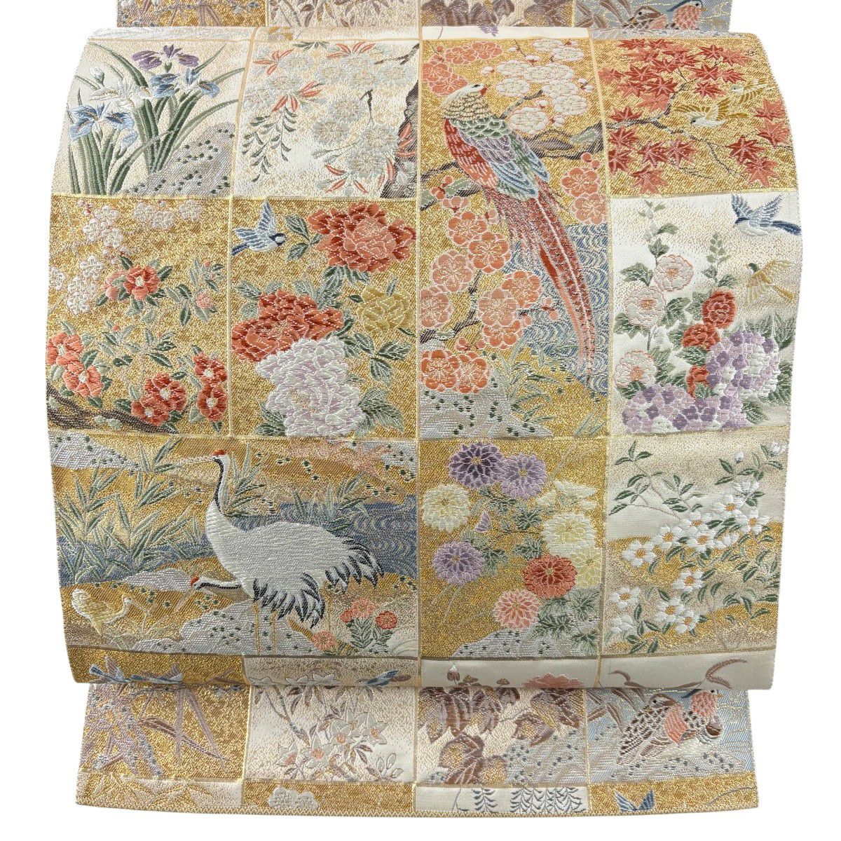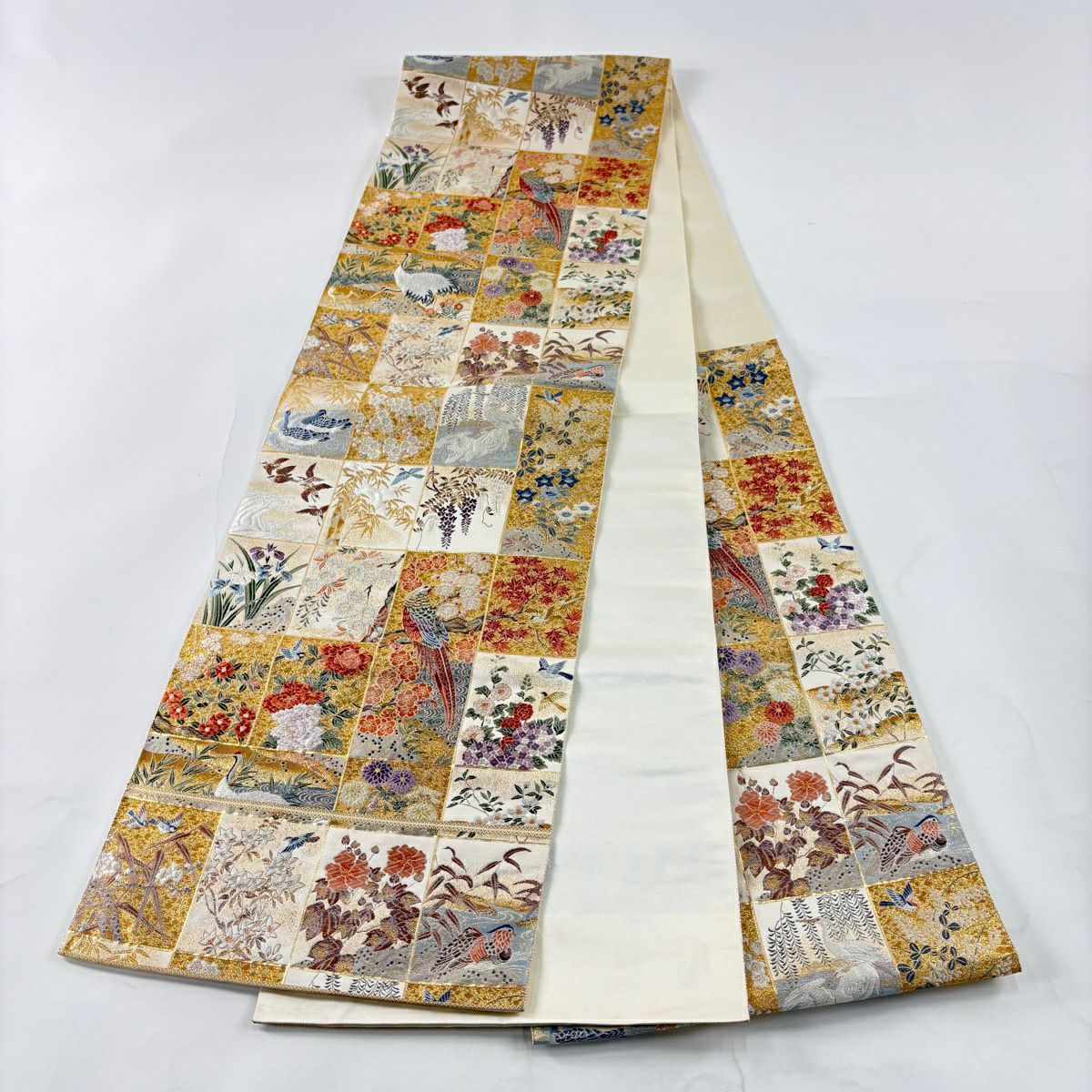 【美品】 袋帯 秀品 関西仕立て 花鳥 格子 箔 金糸 クリーム 六通 正絹