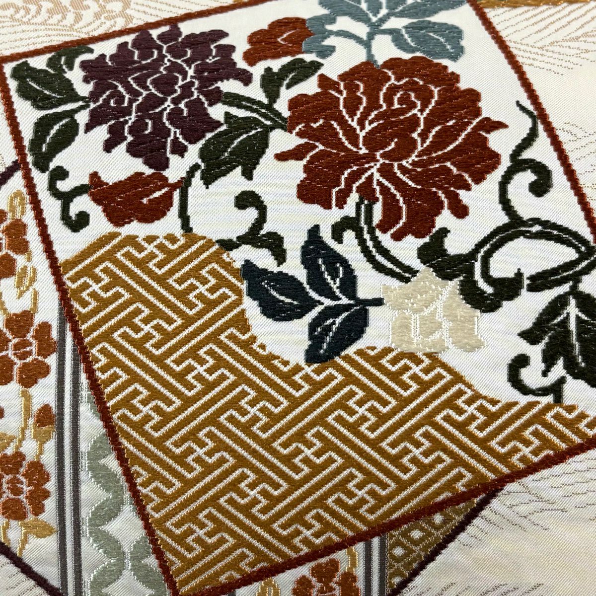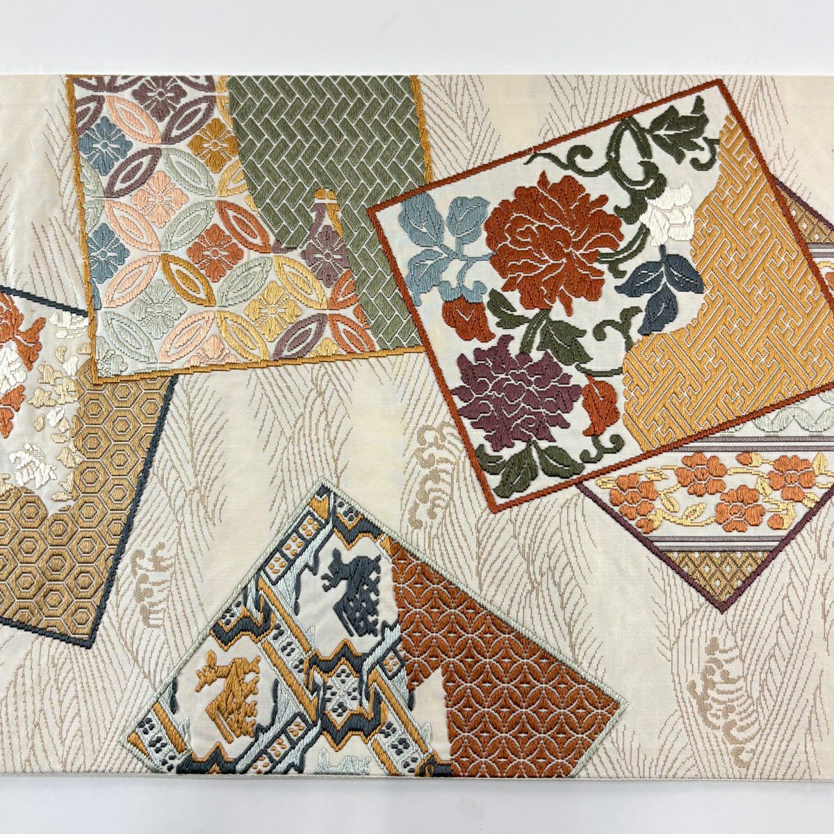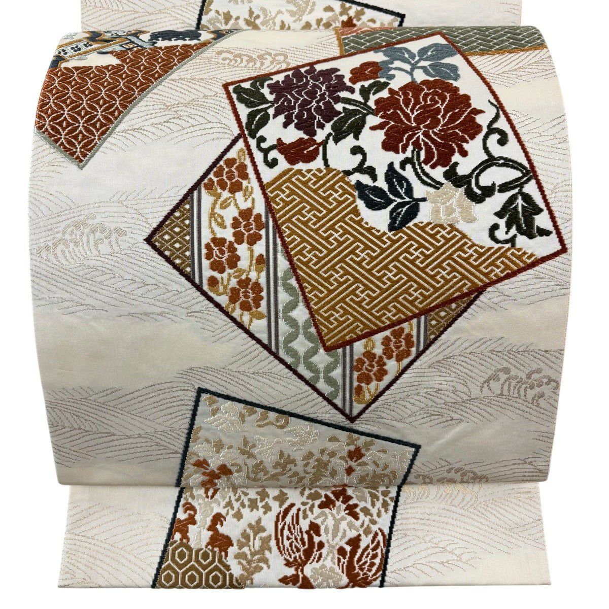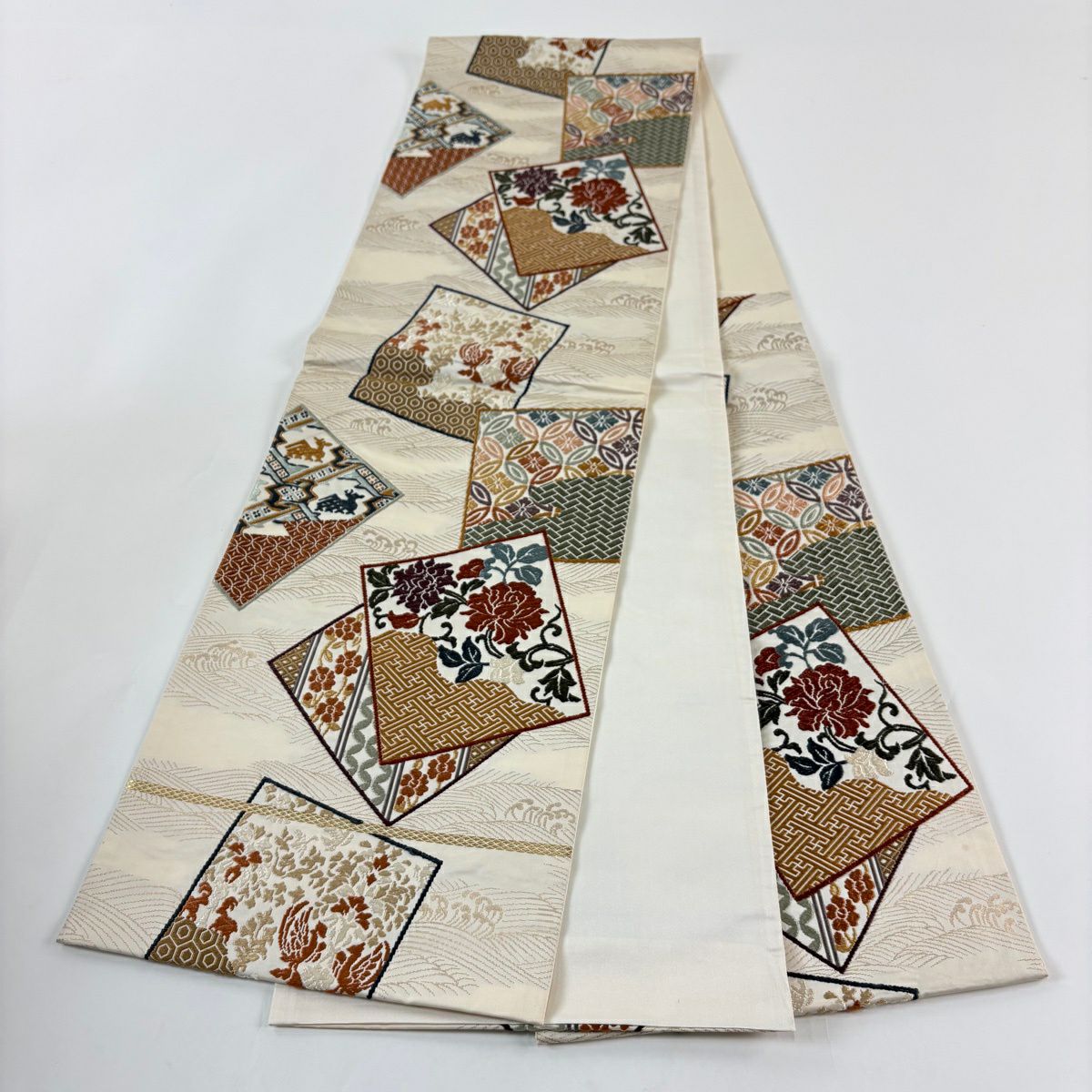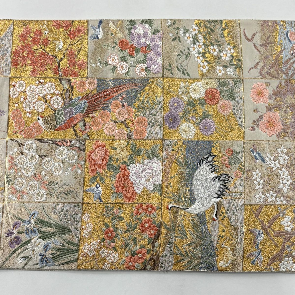 【美品】 袋帯 秀品 関西仕立て 花鳥 格子 箔 金糸 クリーム 六通 正絹
