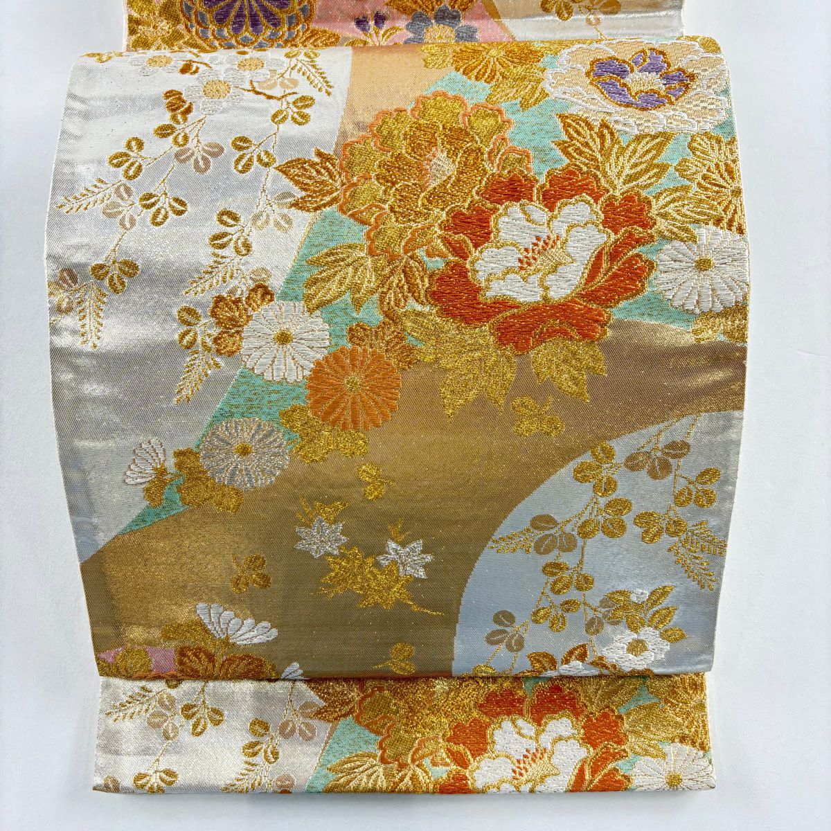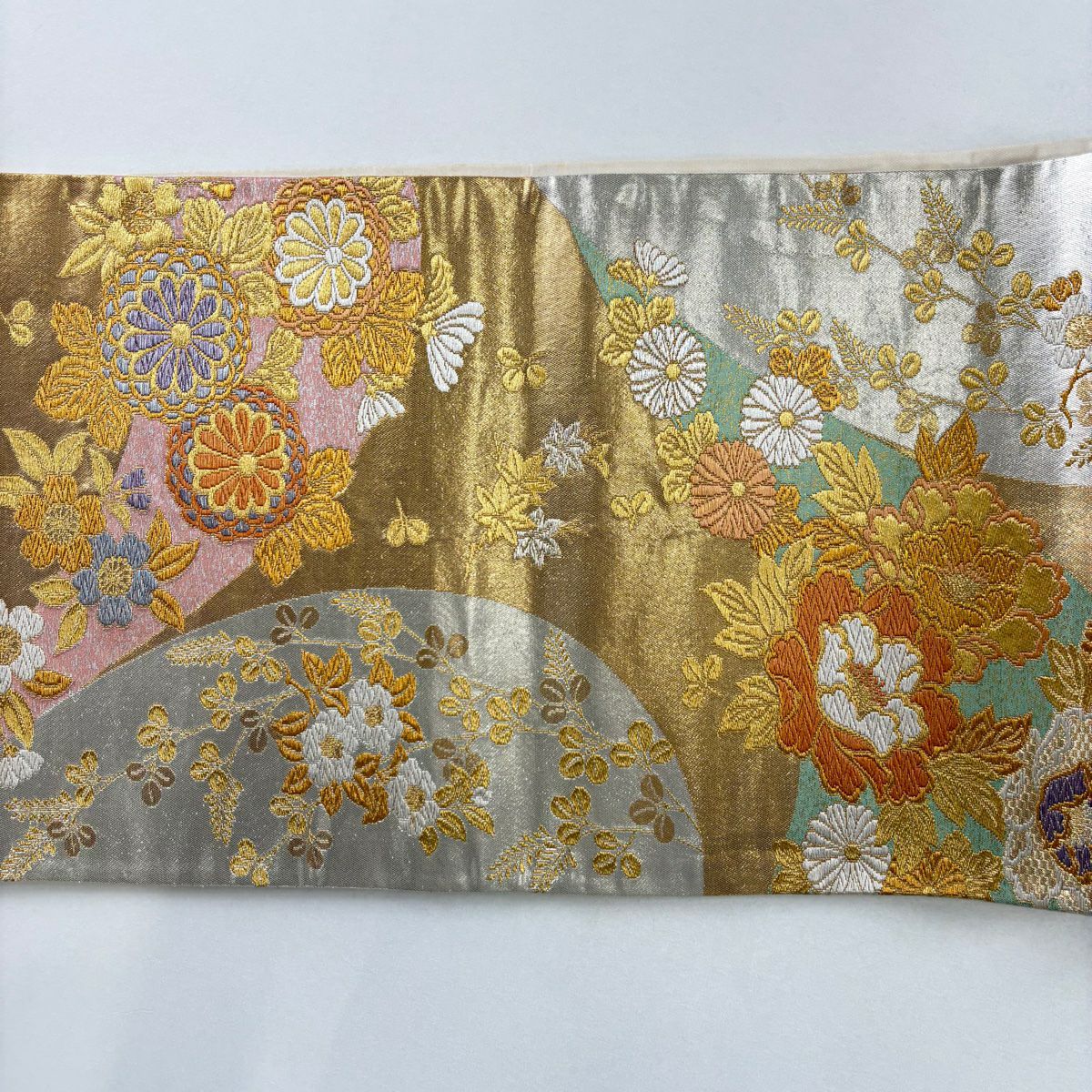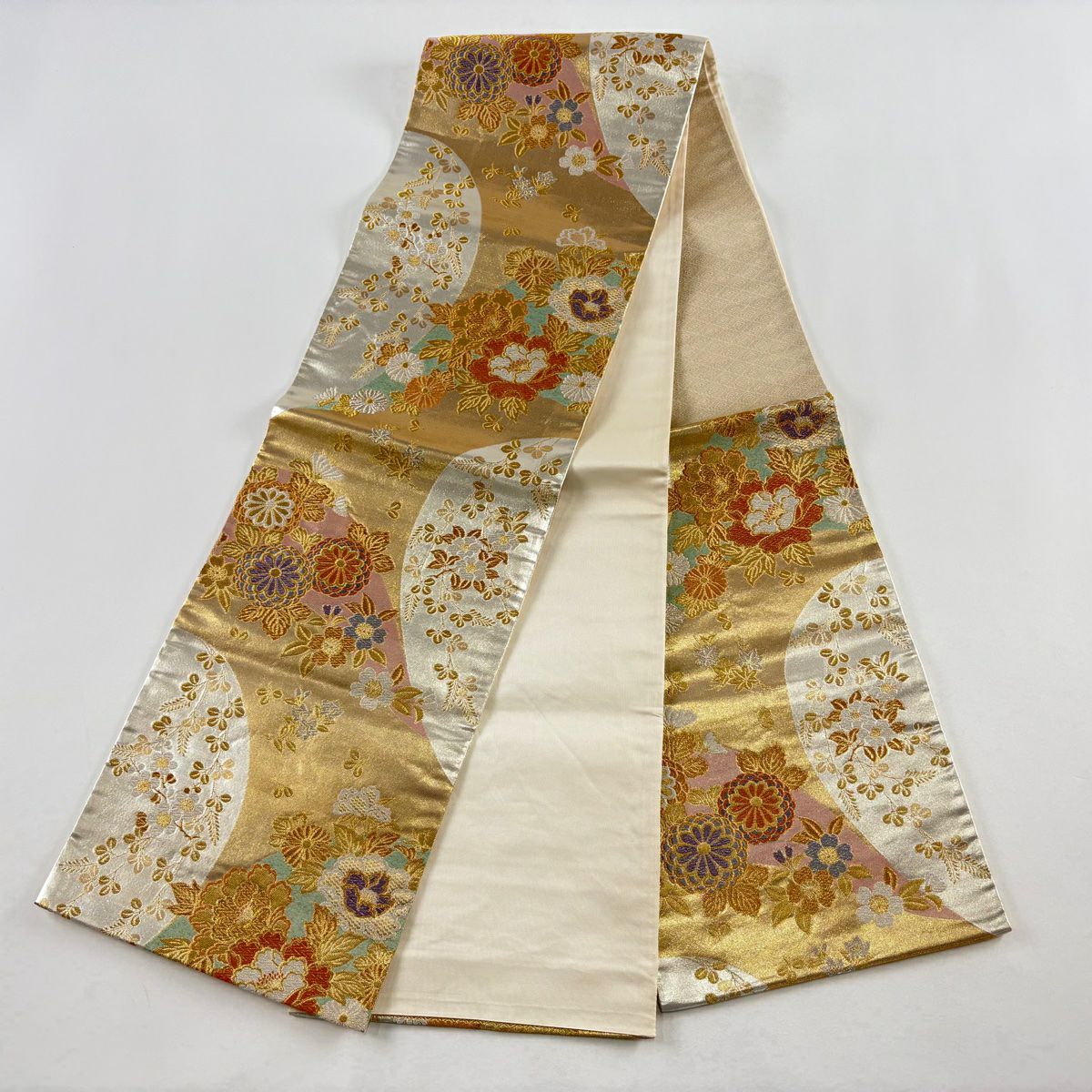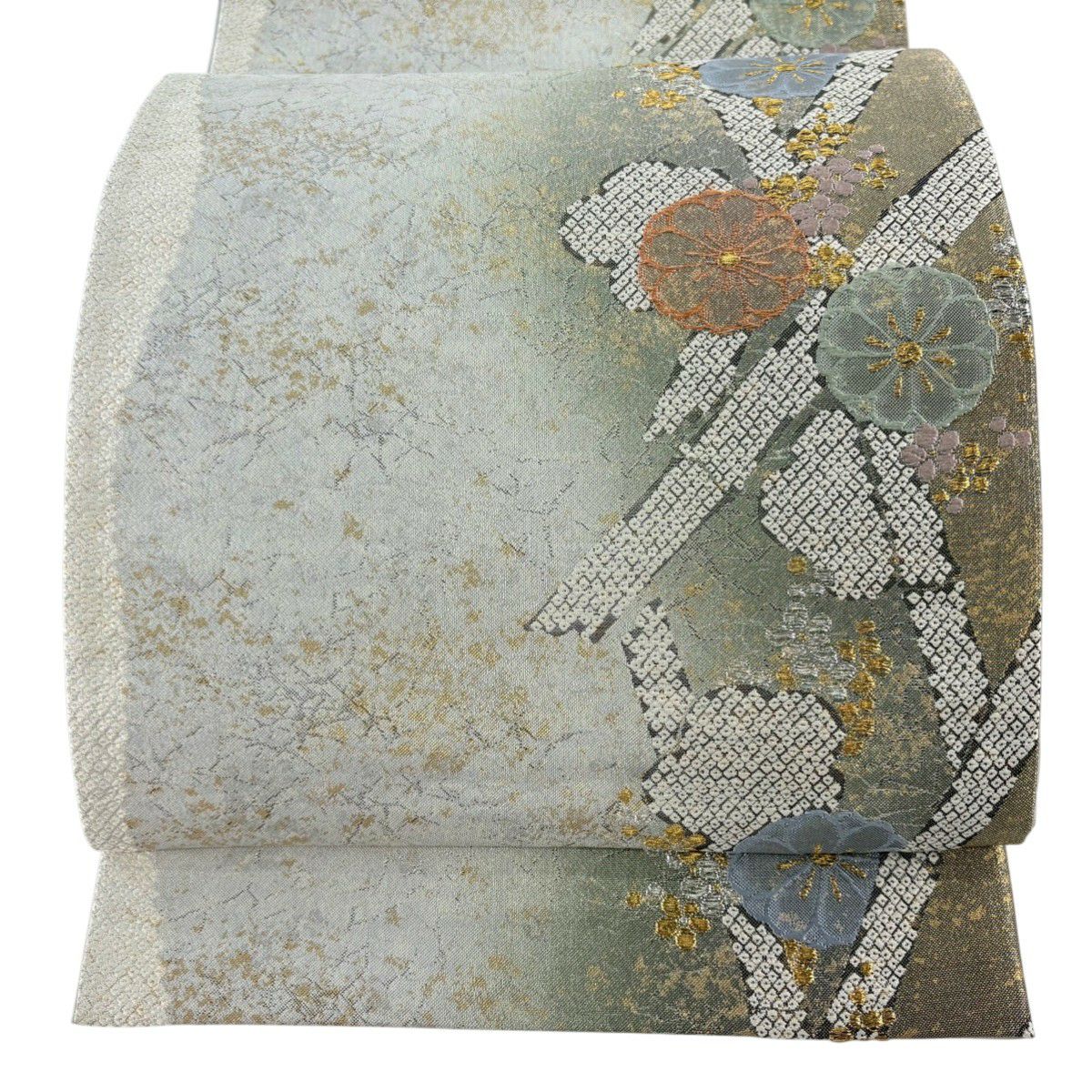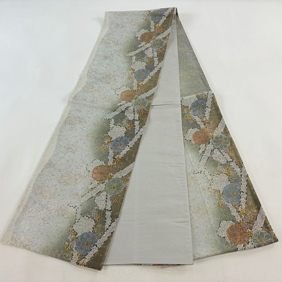 袋帯 秀品 菊 梅 金銀糸 箔 銀色 六通 正絹