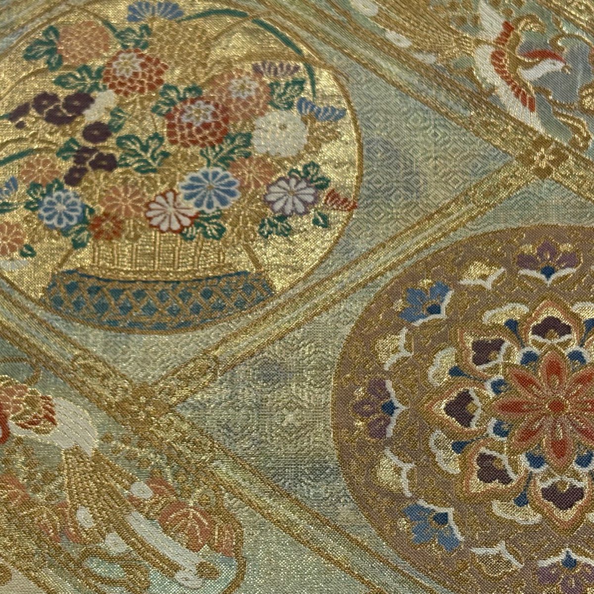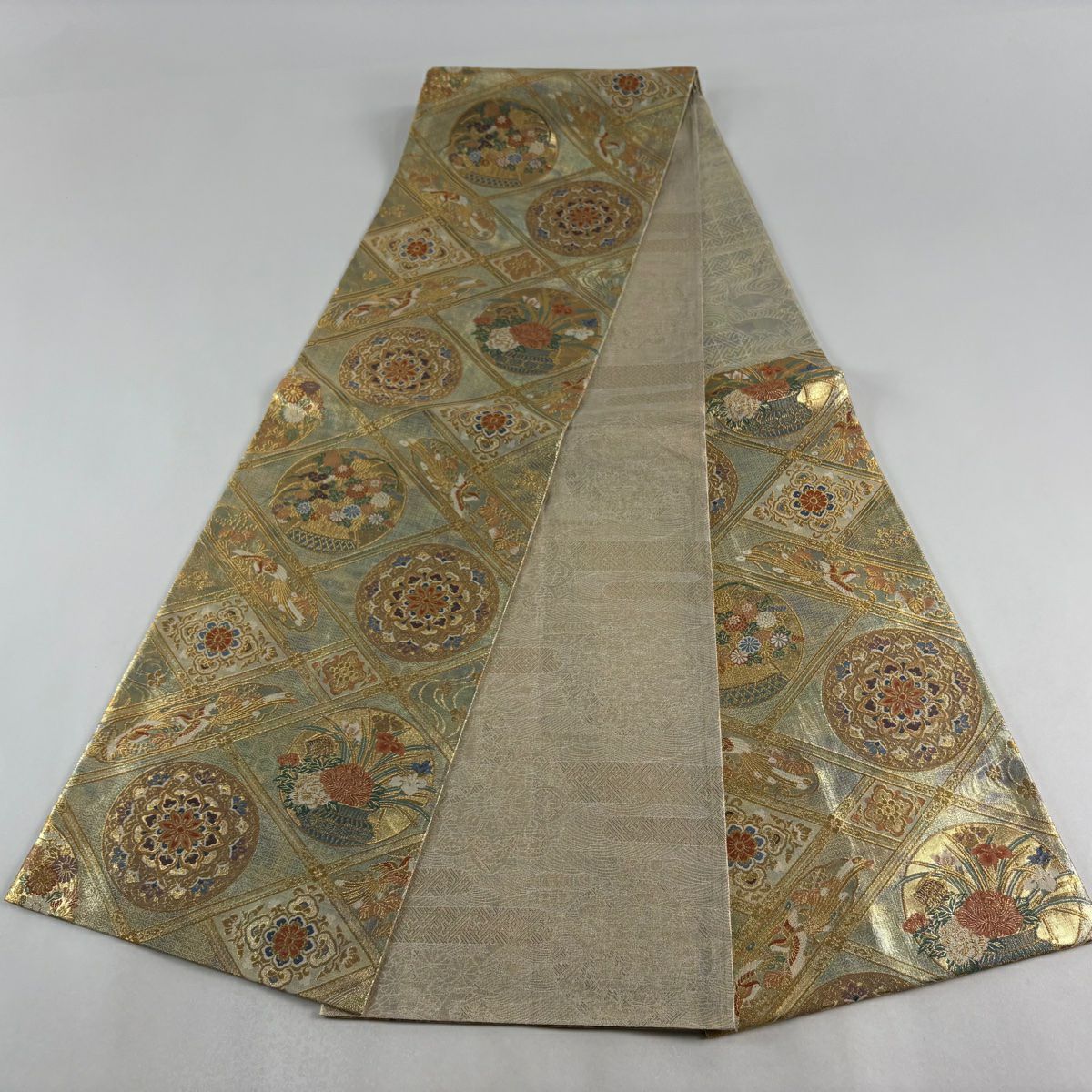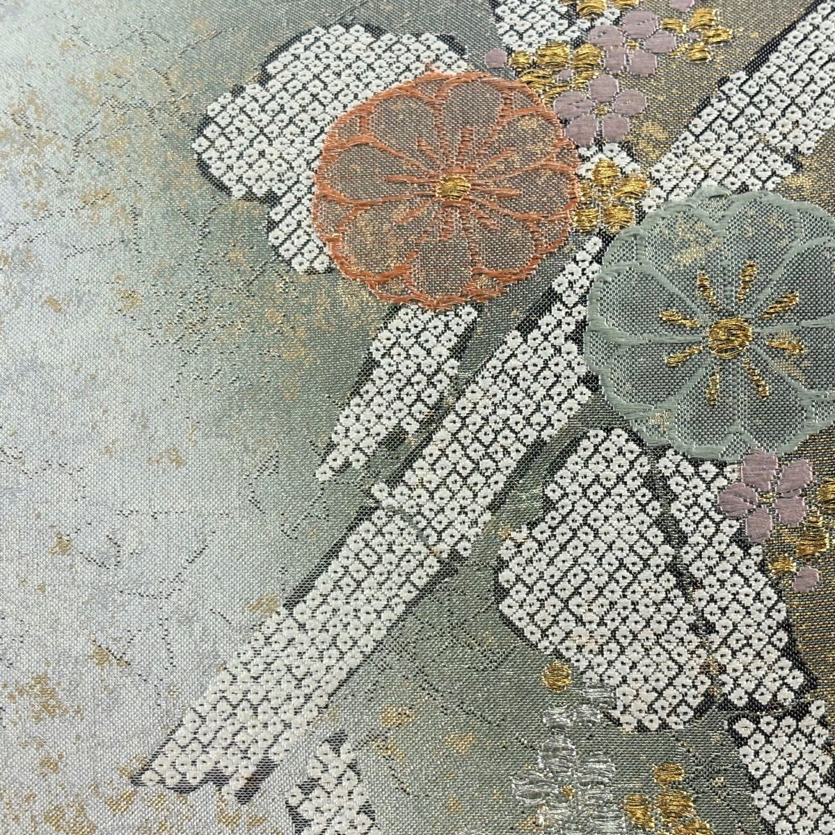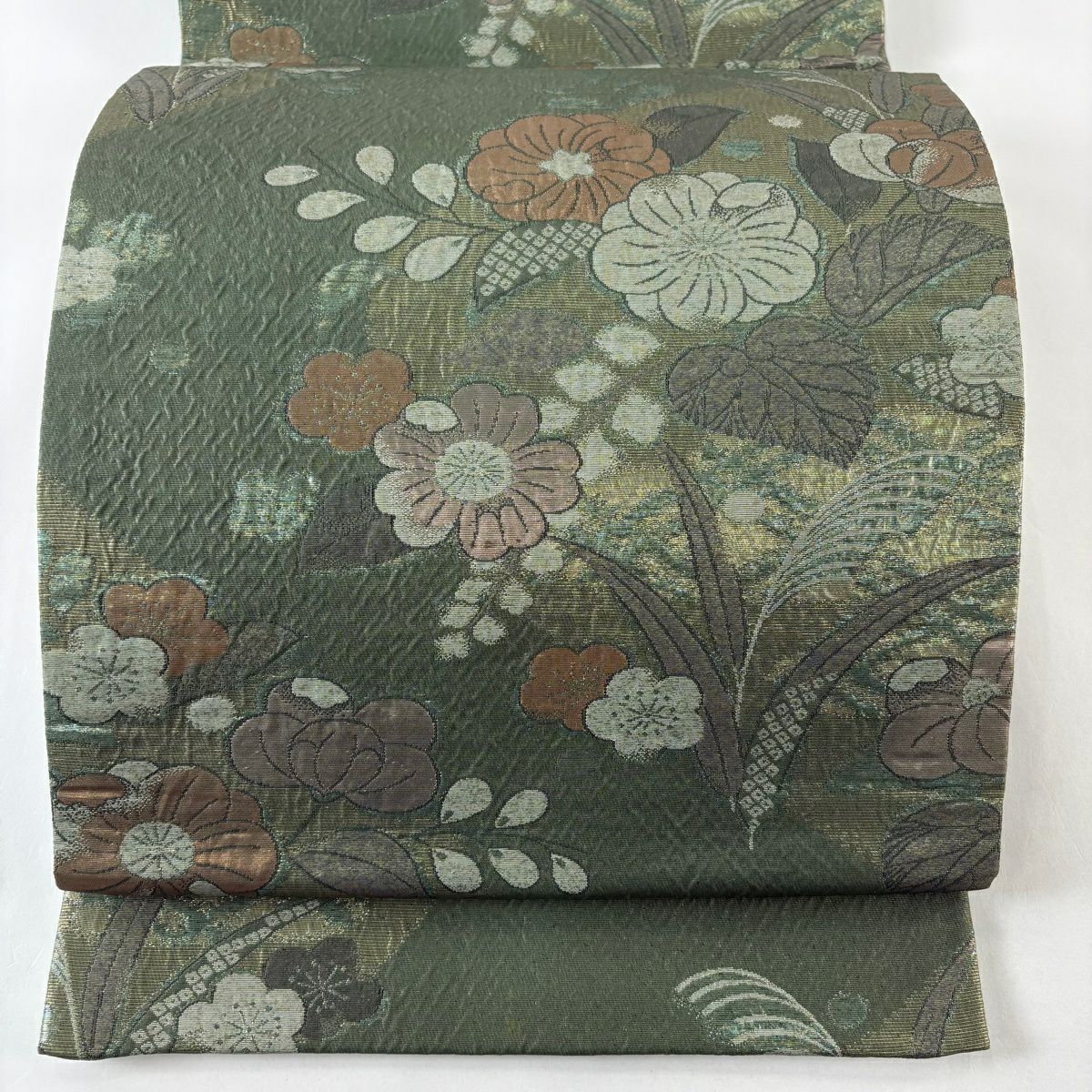 袋帯 秀品 菊 梅 金銀糸 箔 銀色 六通 正絹