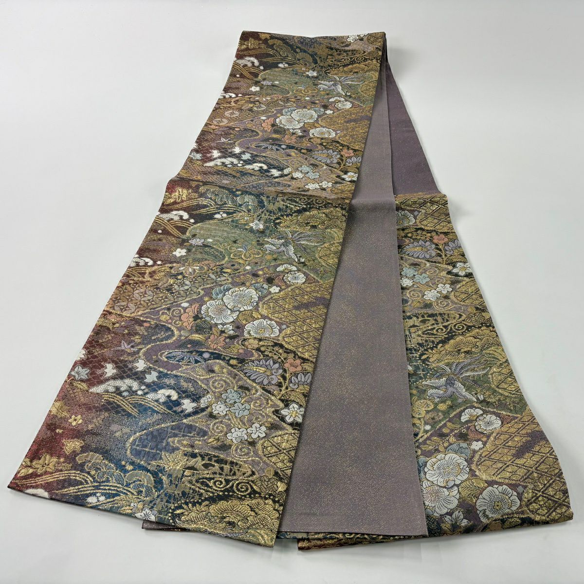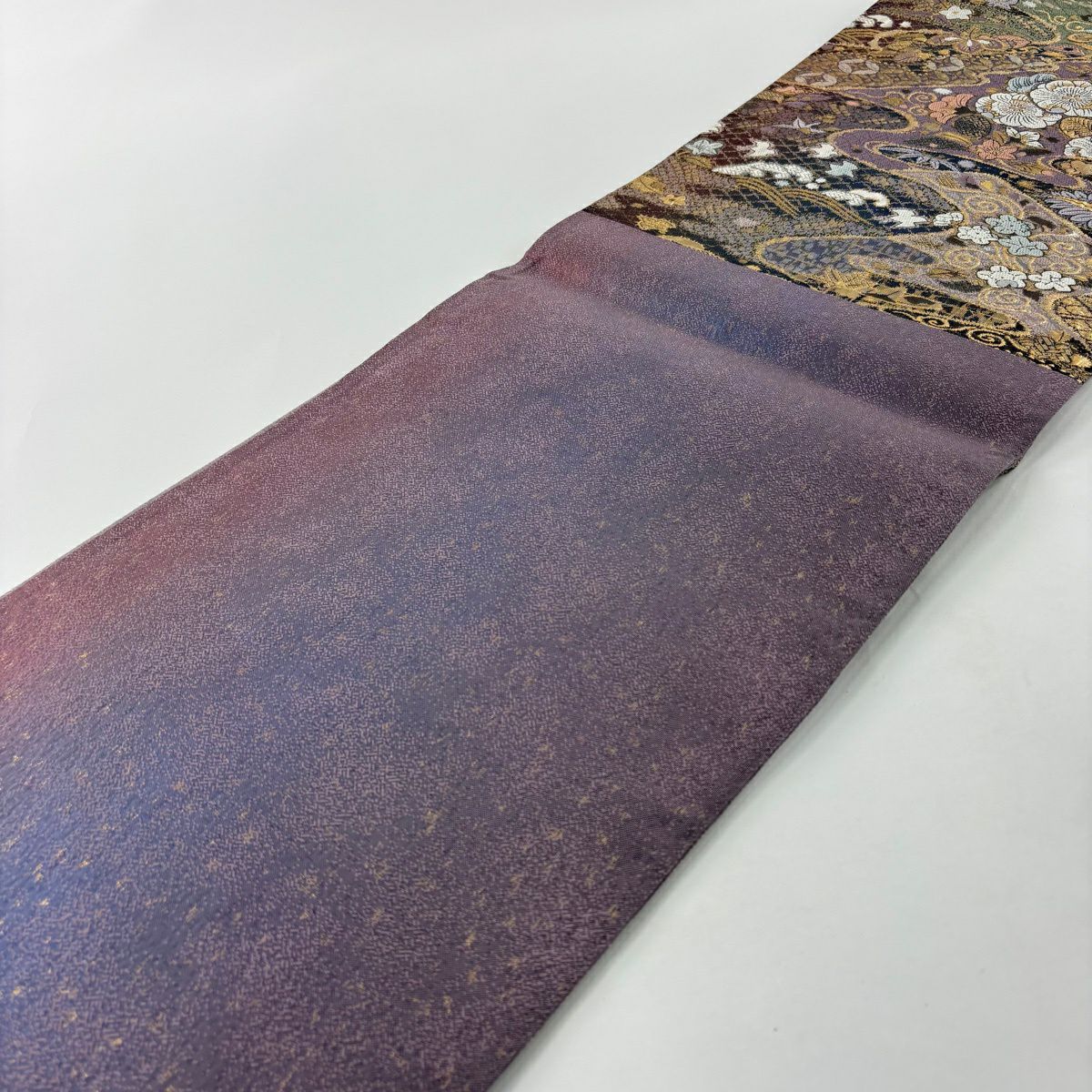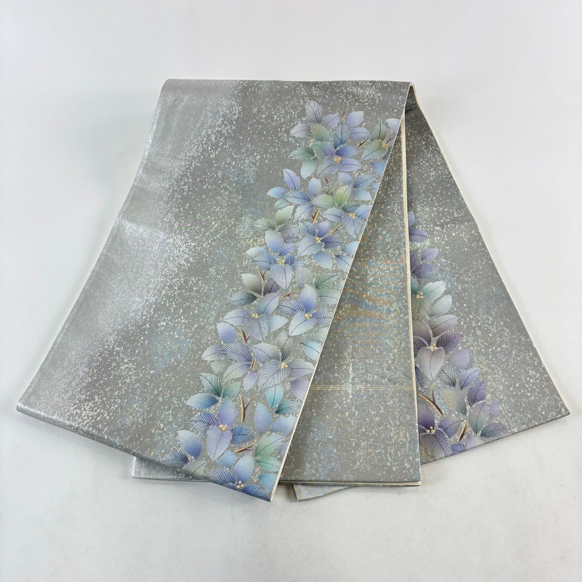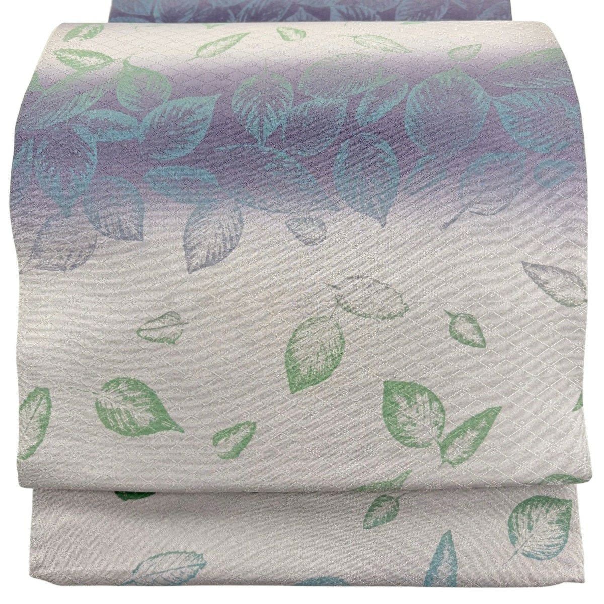 袋帯 秀品 葉柄 地紋 ぼかし 灰紫 全通 正絹