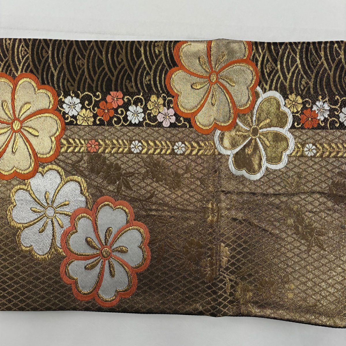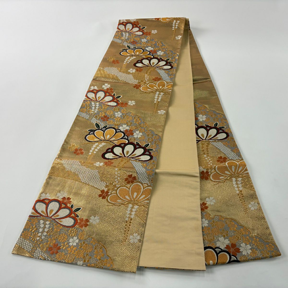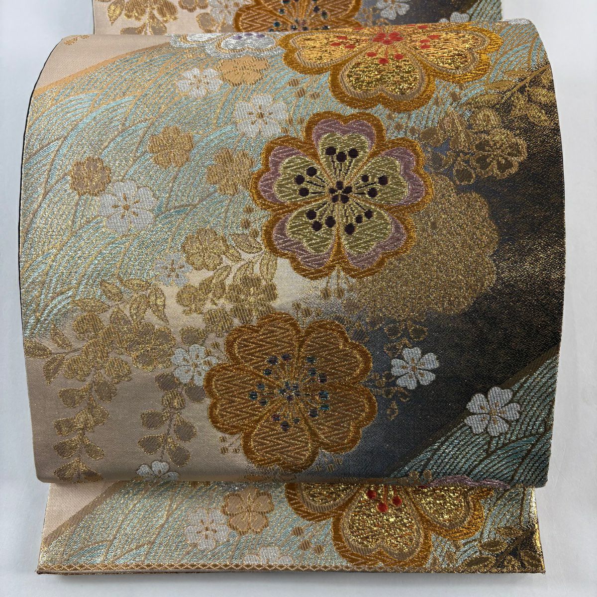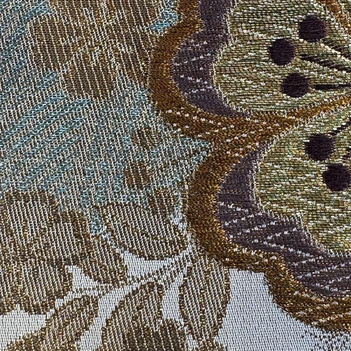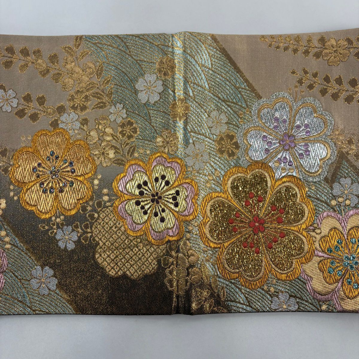 袋帯 秀品 桜 波 箔 唐織 金色 六通 正絹