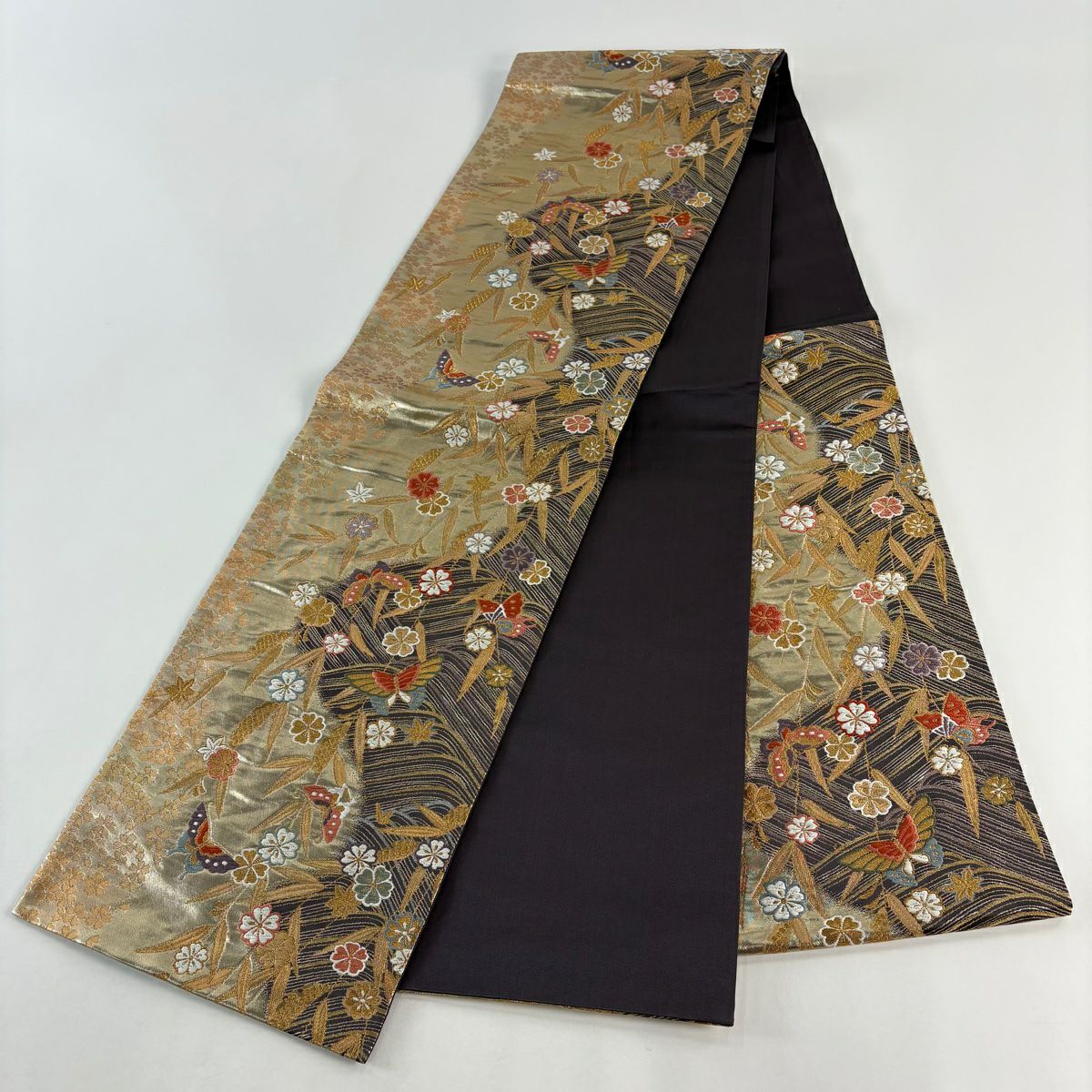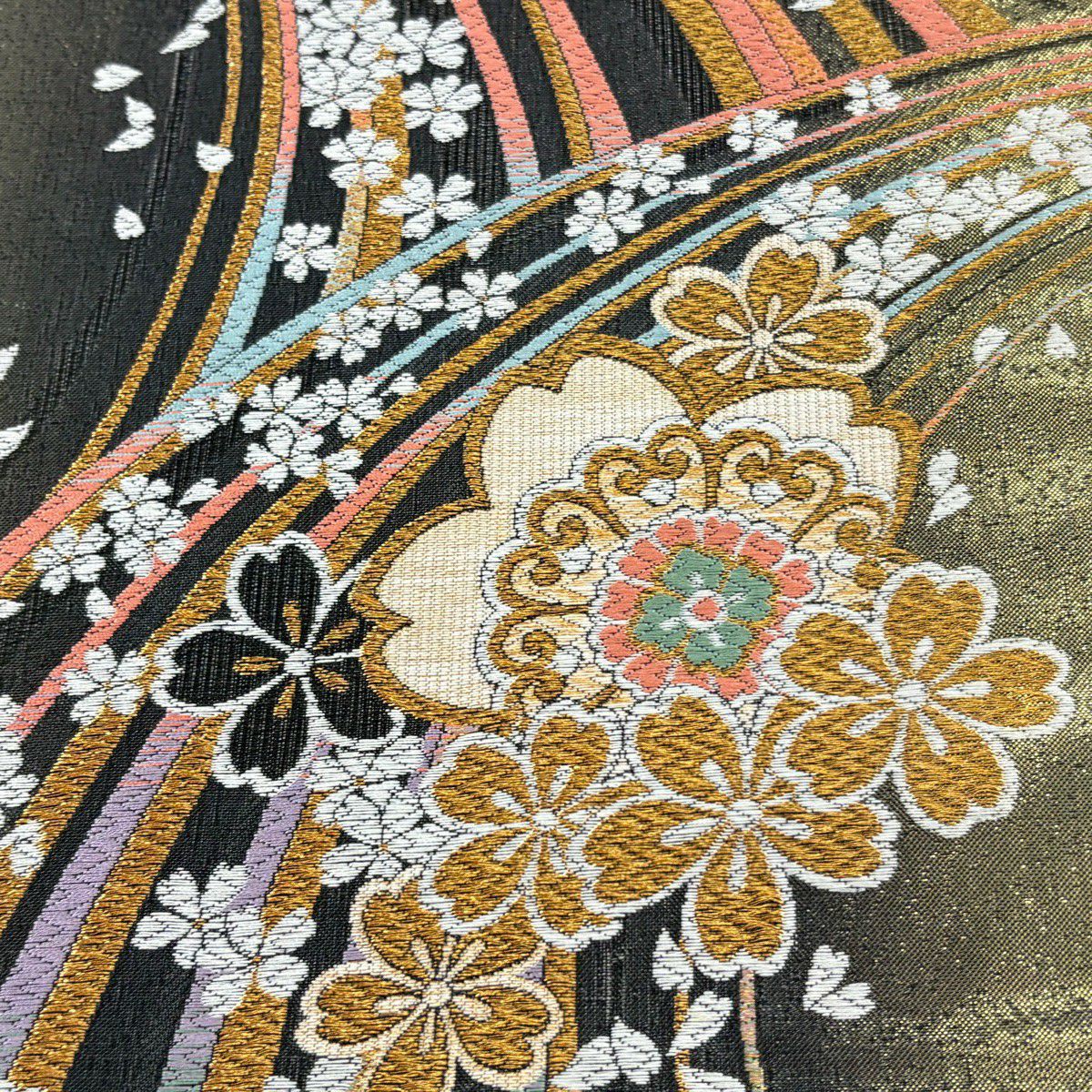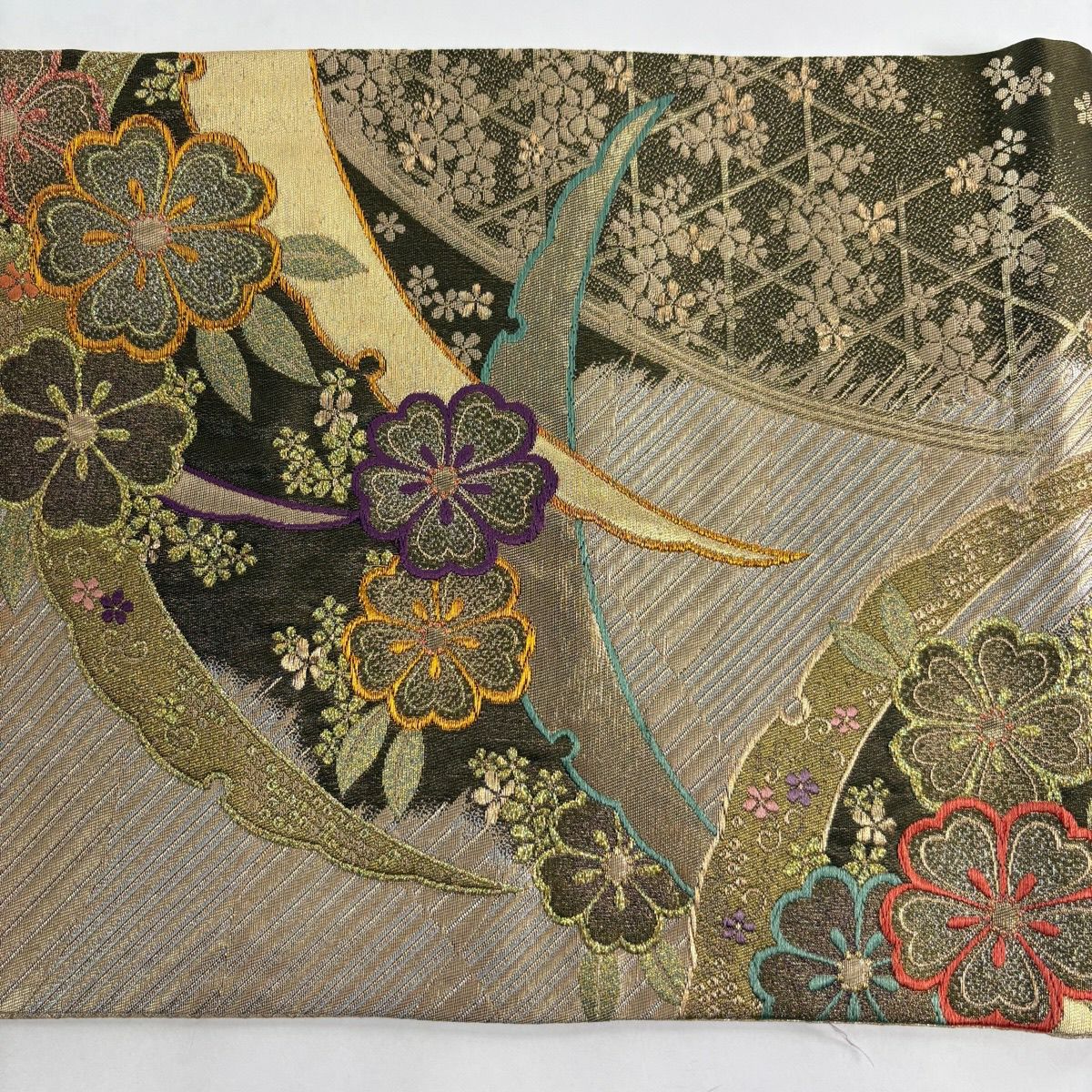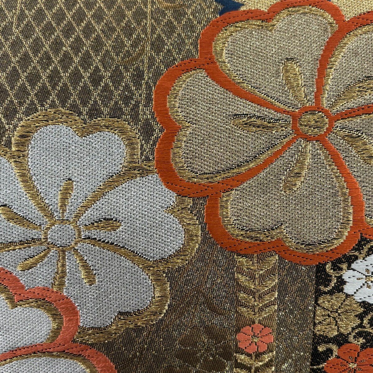 袋帯 秀品 桜 華文 金糸 箔 黒灰 六通 正絹
