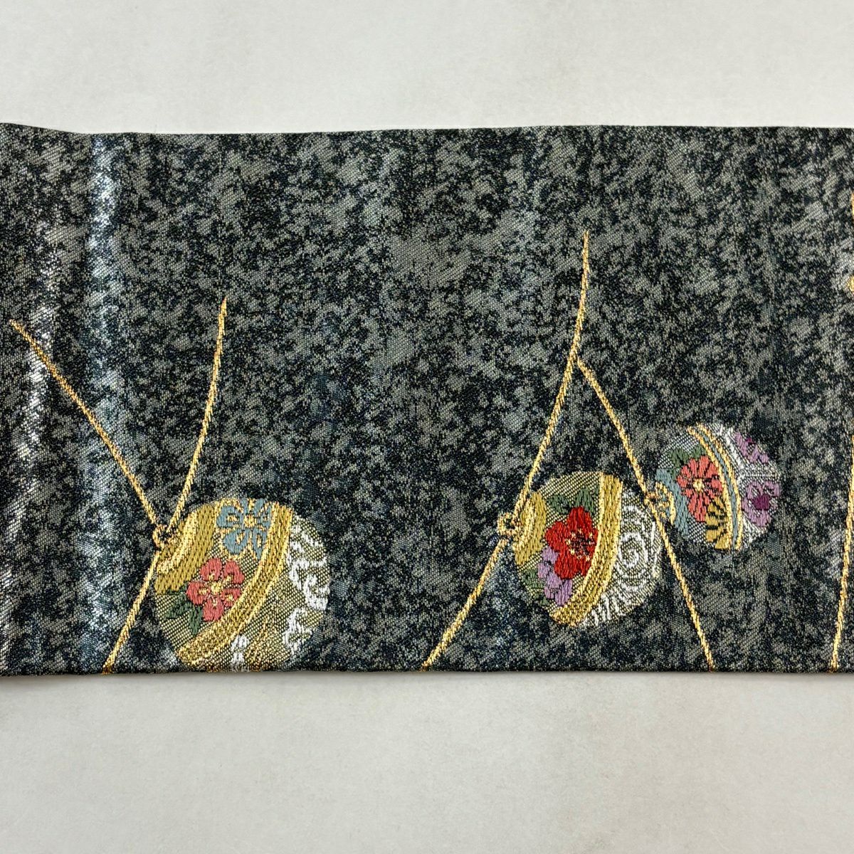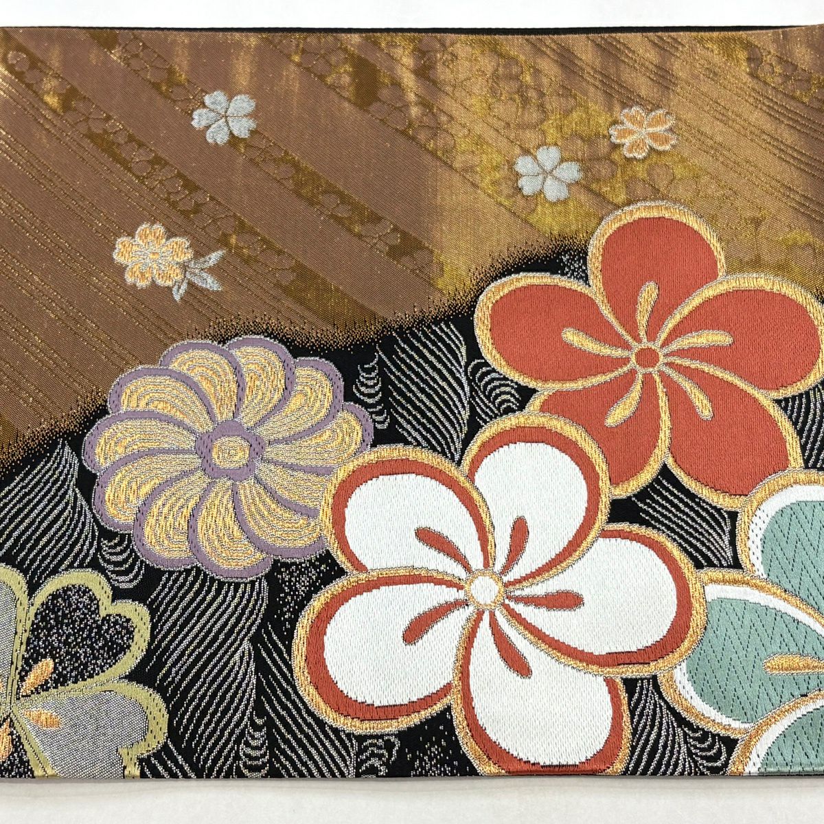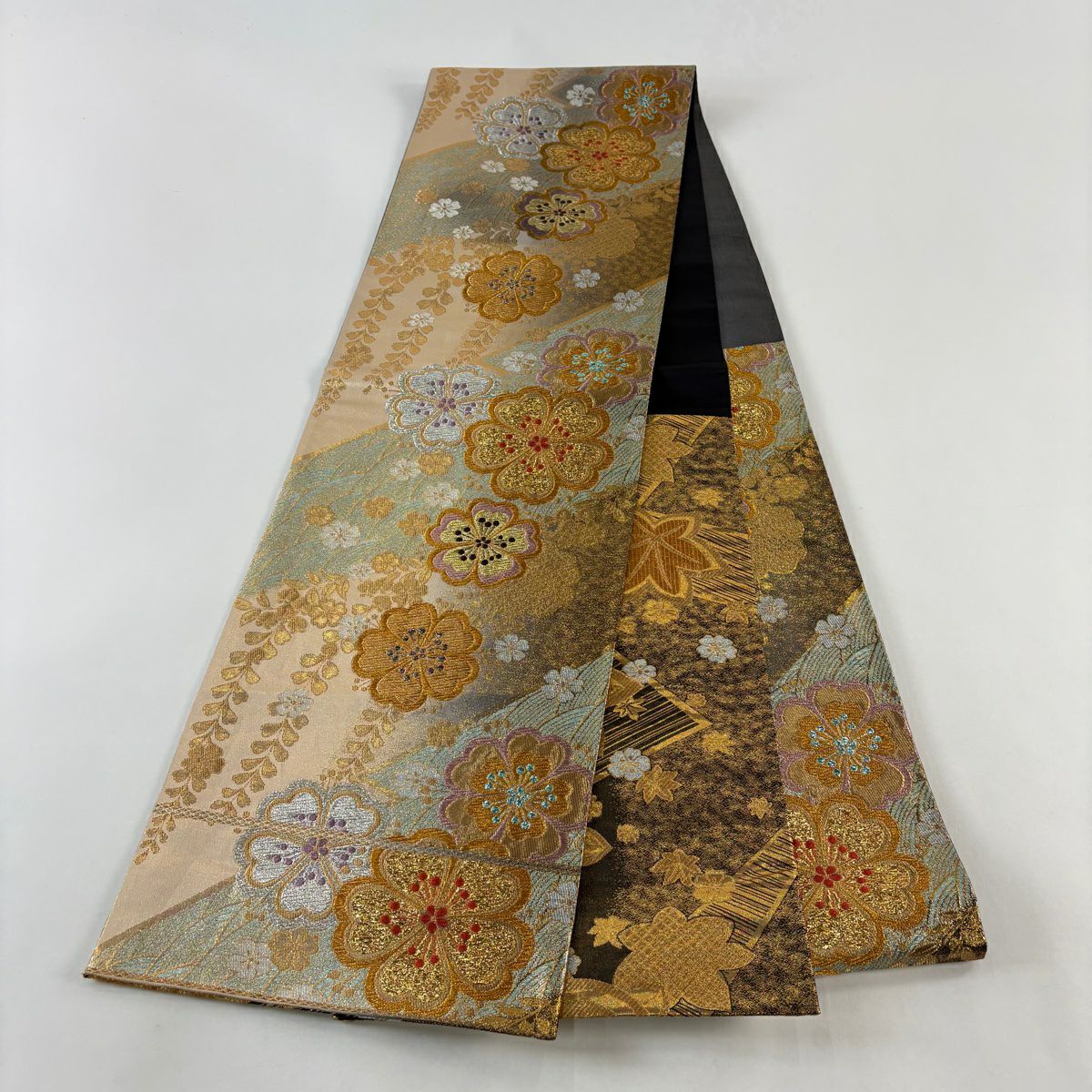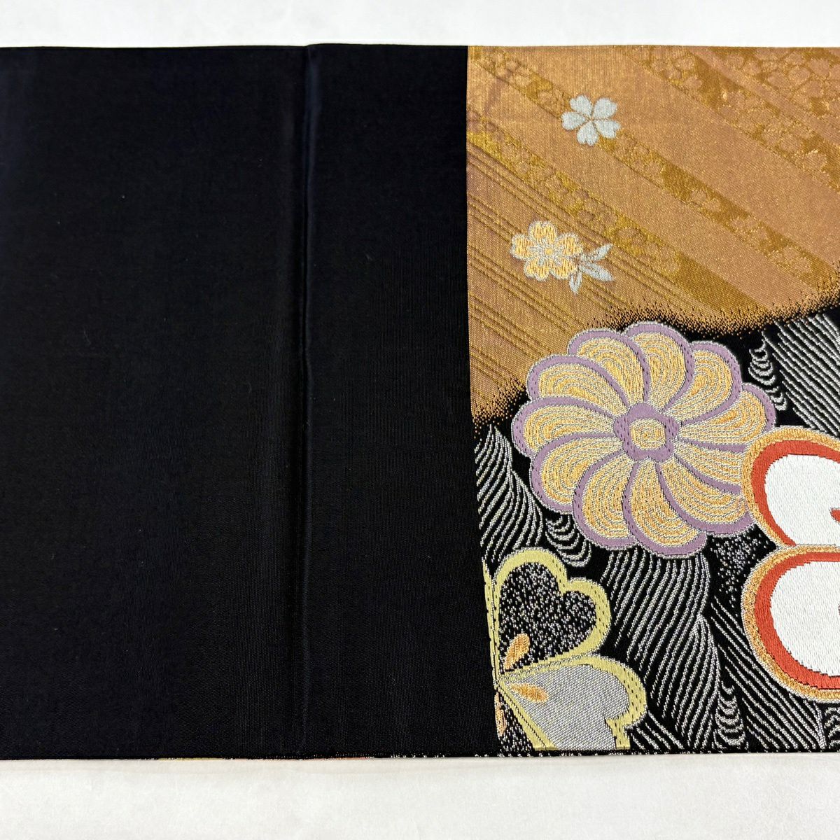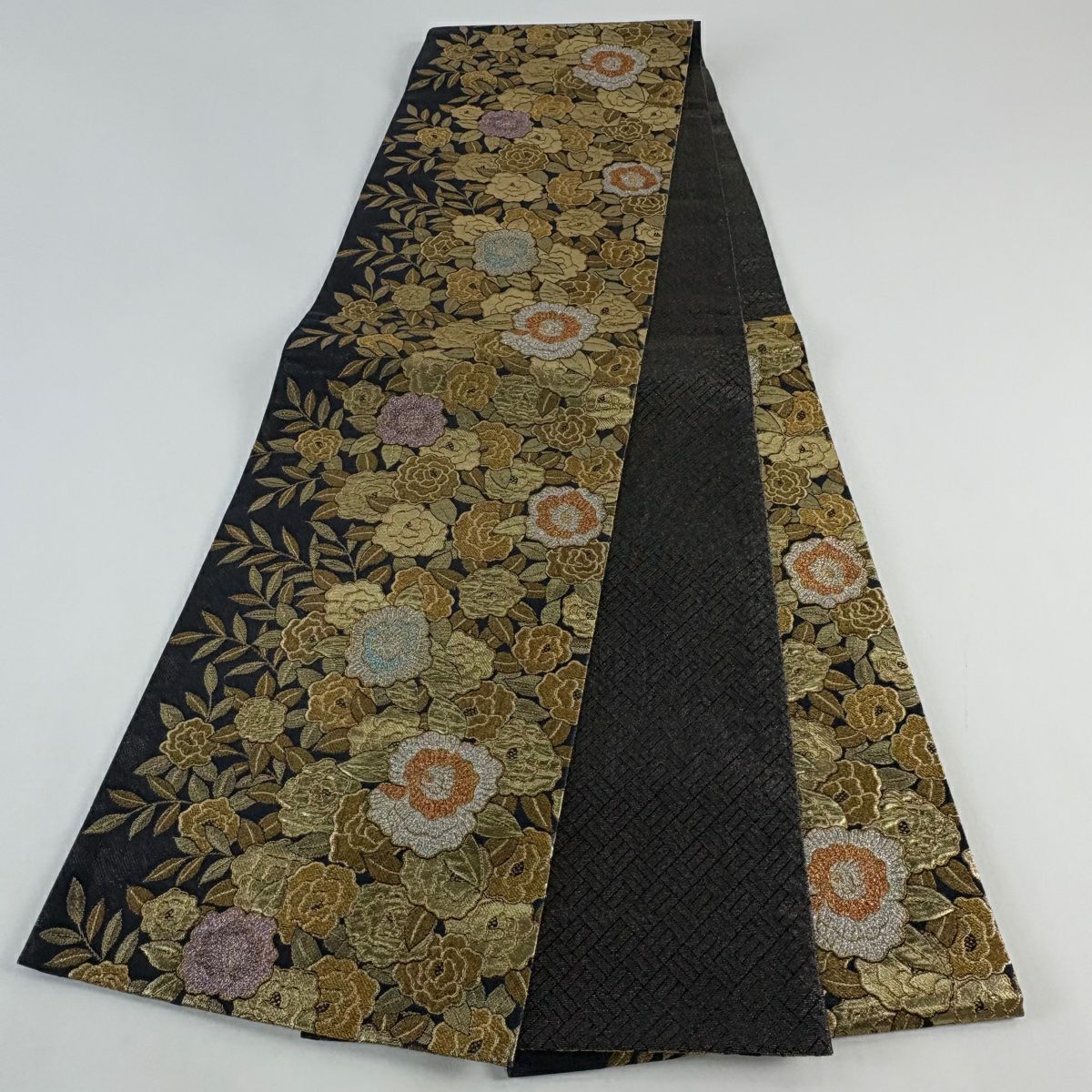 袋帯 秀品 桜 華文 金糸 箔 黒灰 六通 正絹