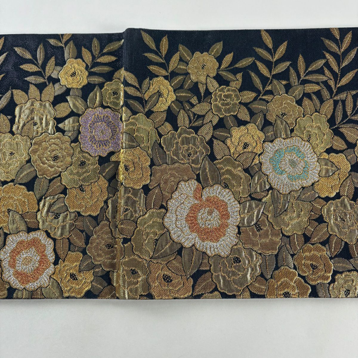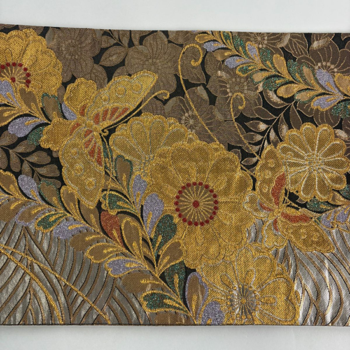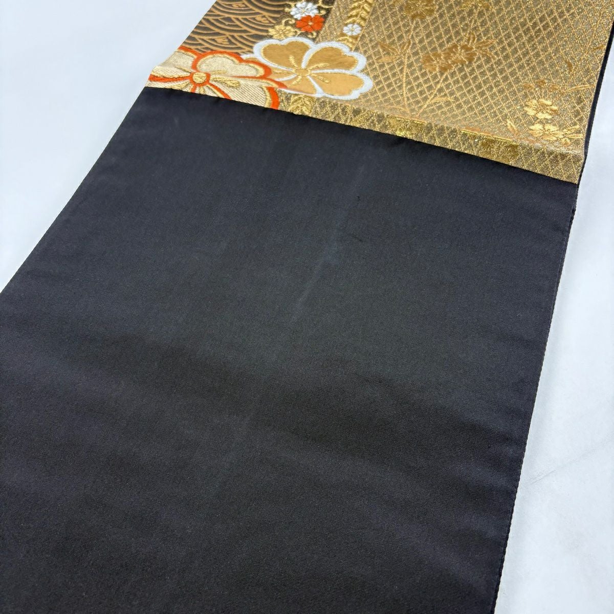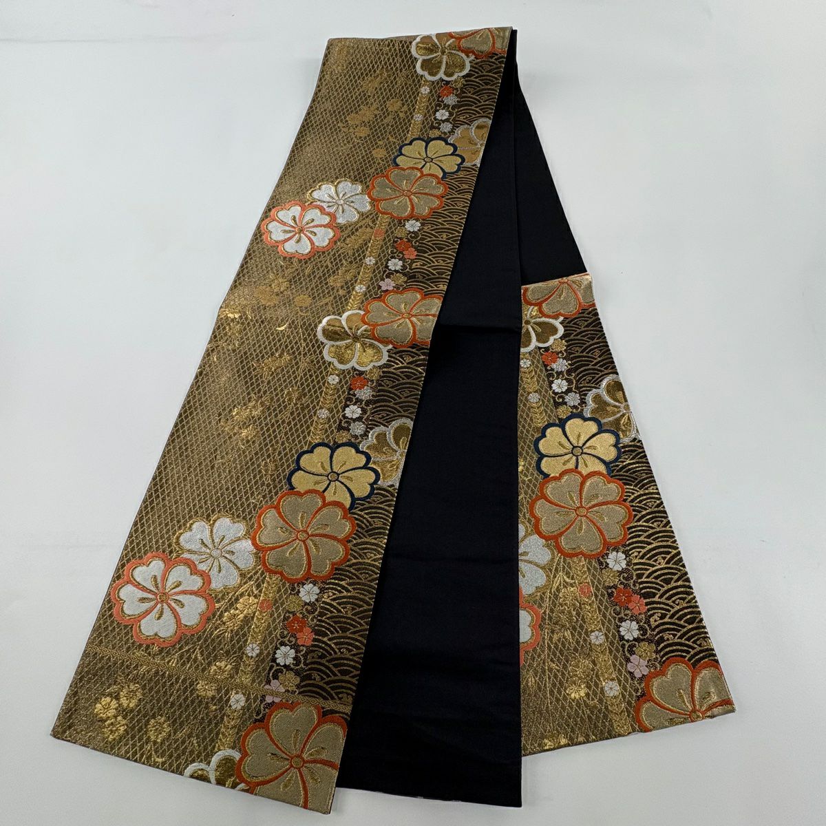袋帯 秀品 桜 華文 金糸 箔 黒灰 六通 正絹
