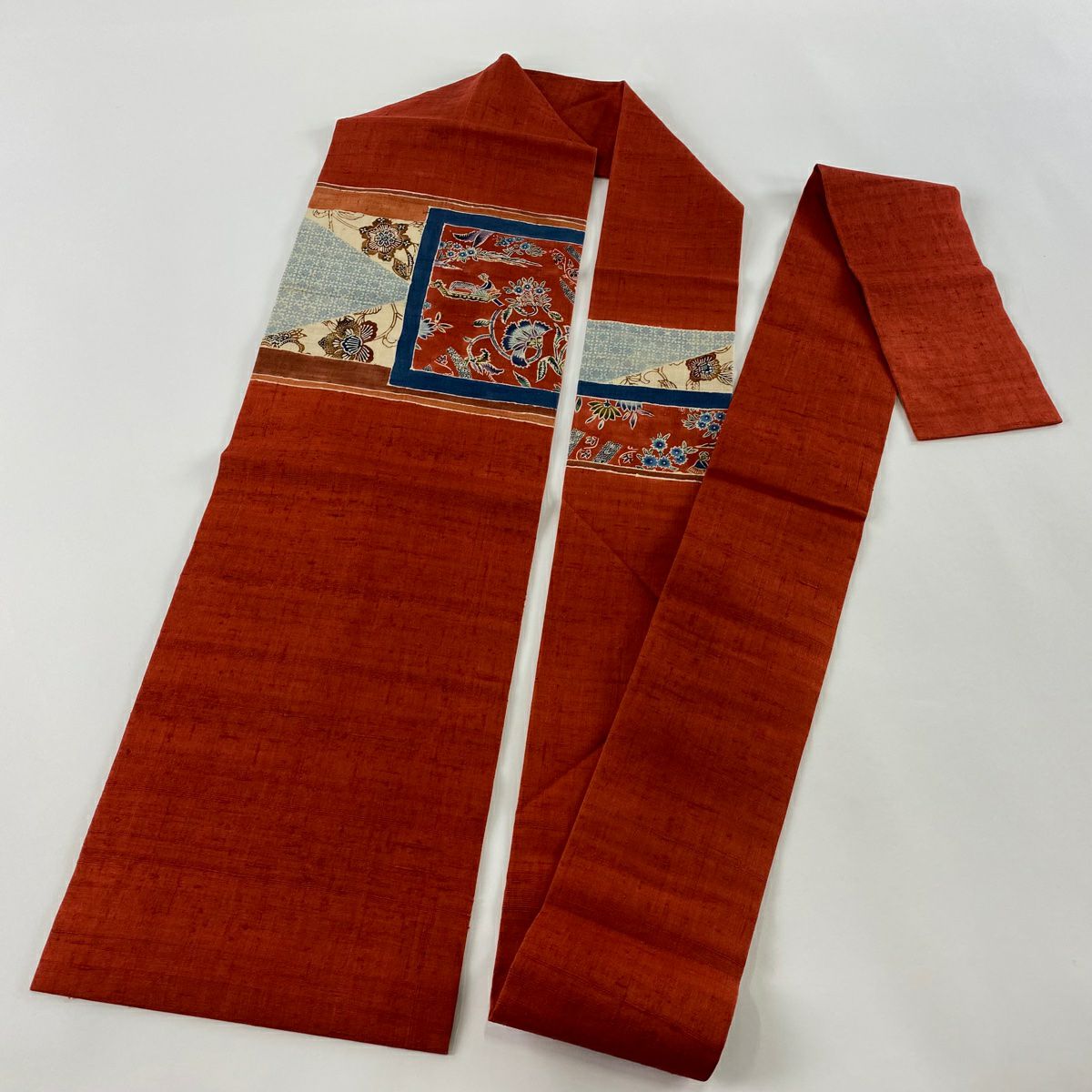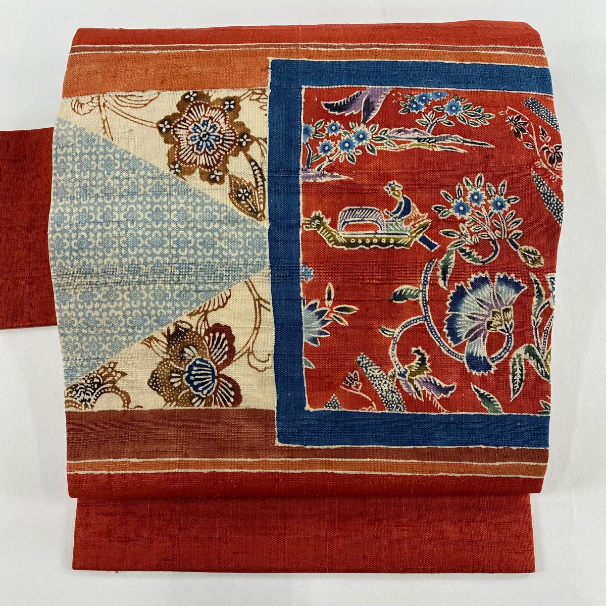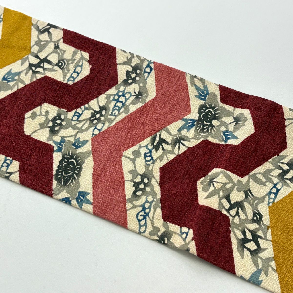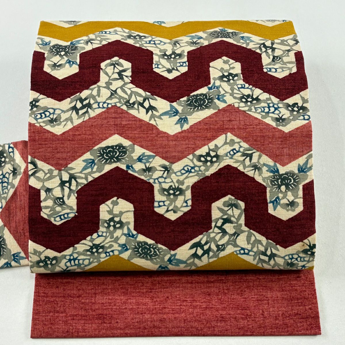 名古屋帯 秀品 紬地 草花 幾何学 茜色 正絹