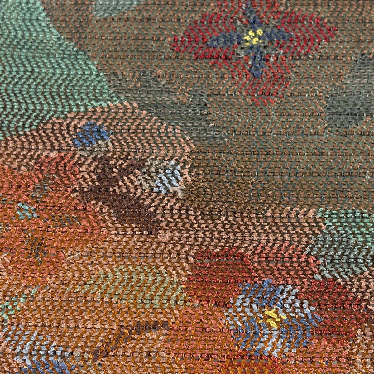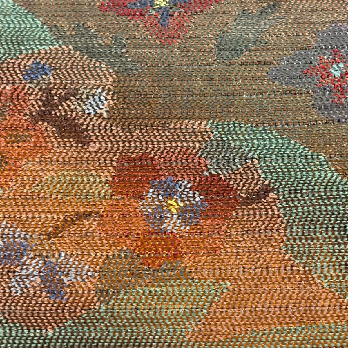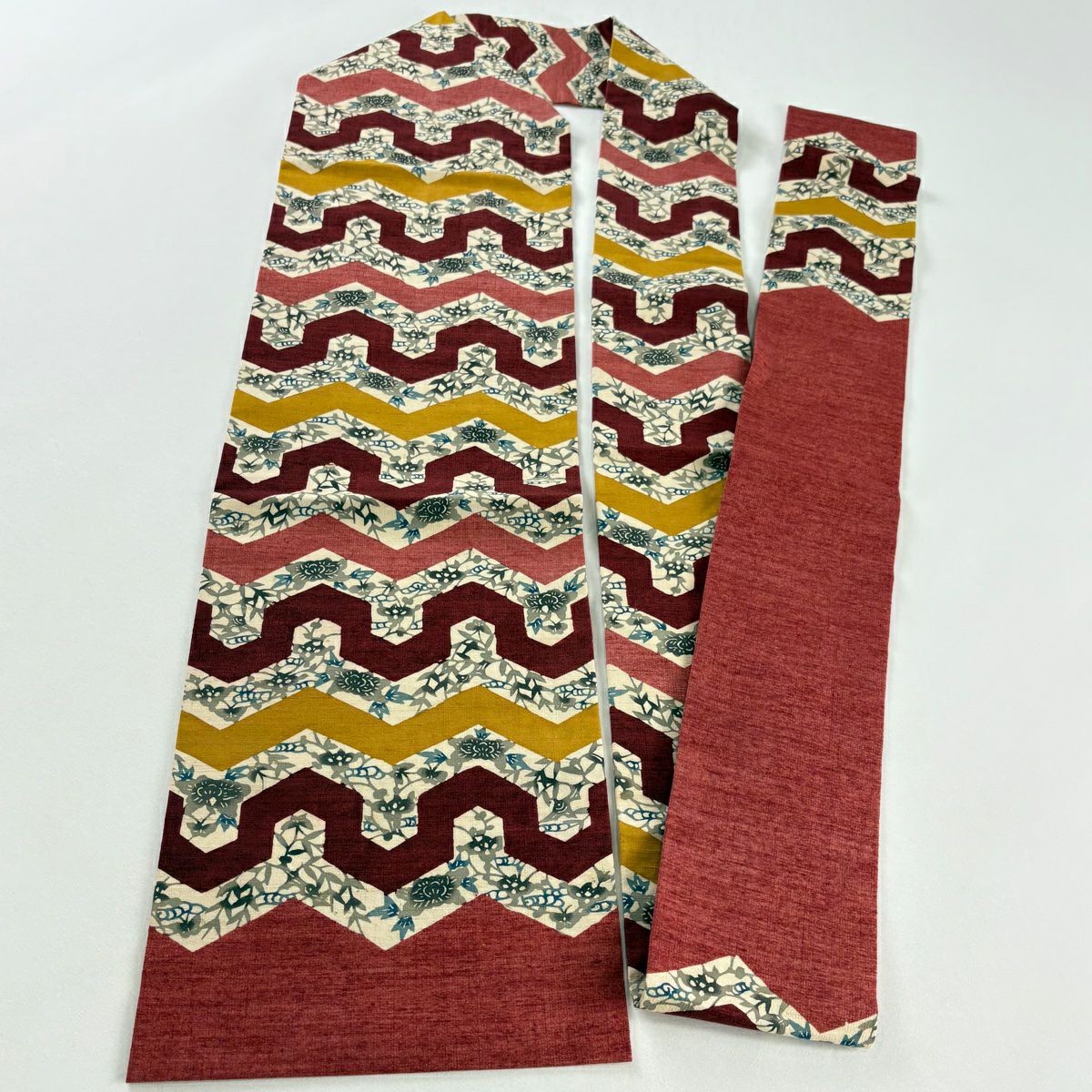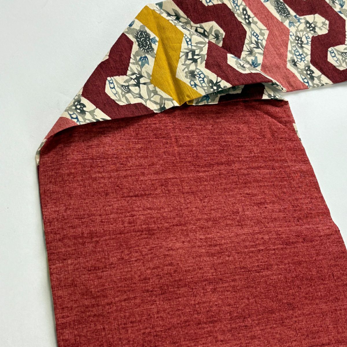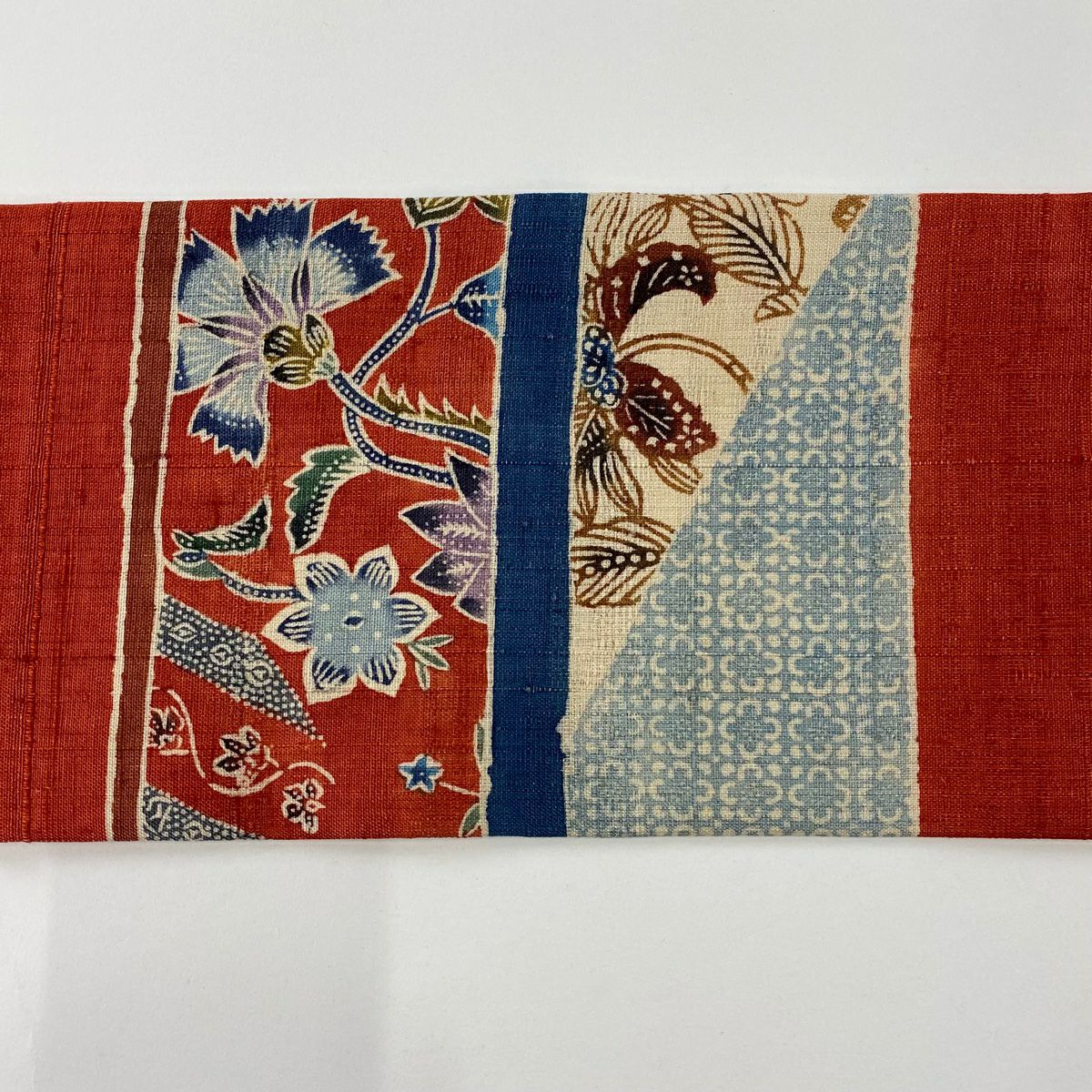 名古屋帯 秀品 紬地 草花 幾何学 茜色 正絹