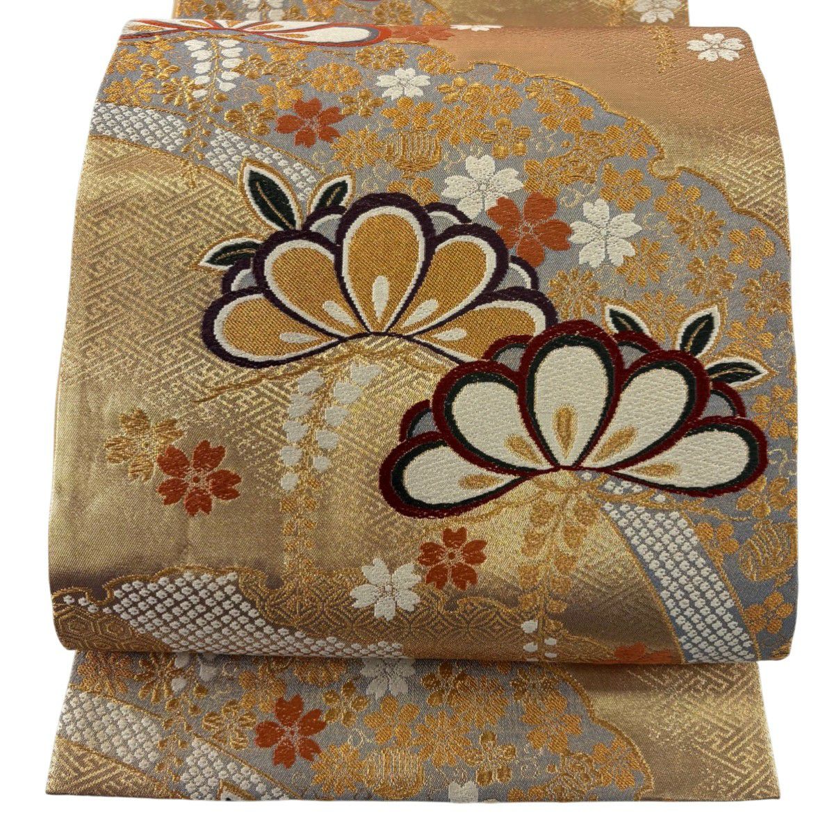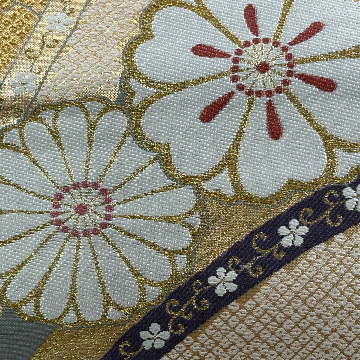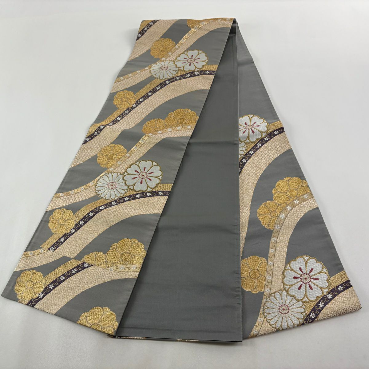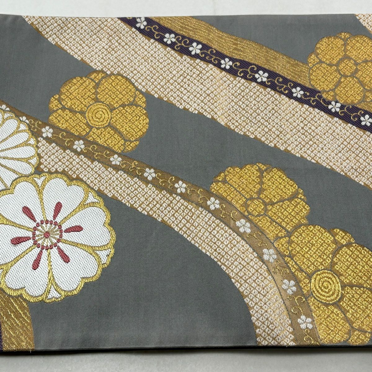 袋帯 秀品 桜 菊 金糸 箔 灰色 六通 正絹