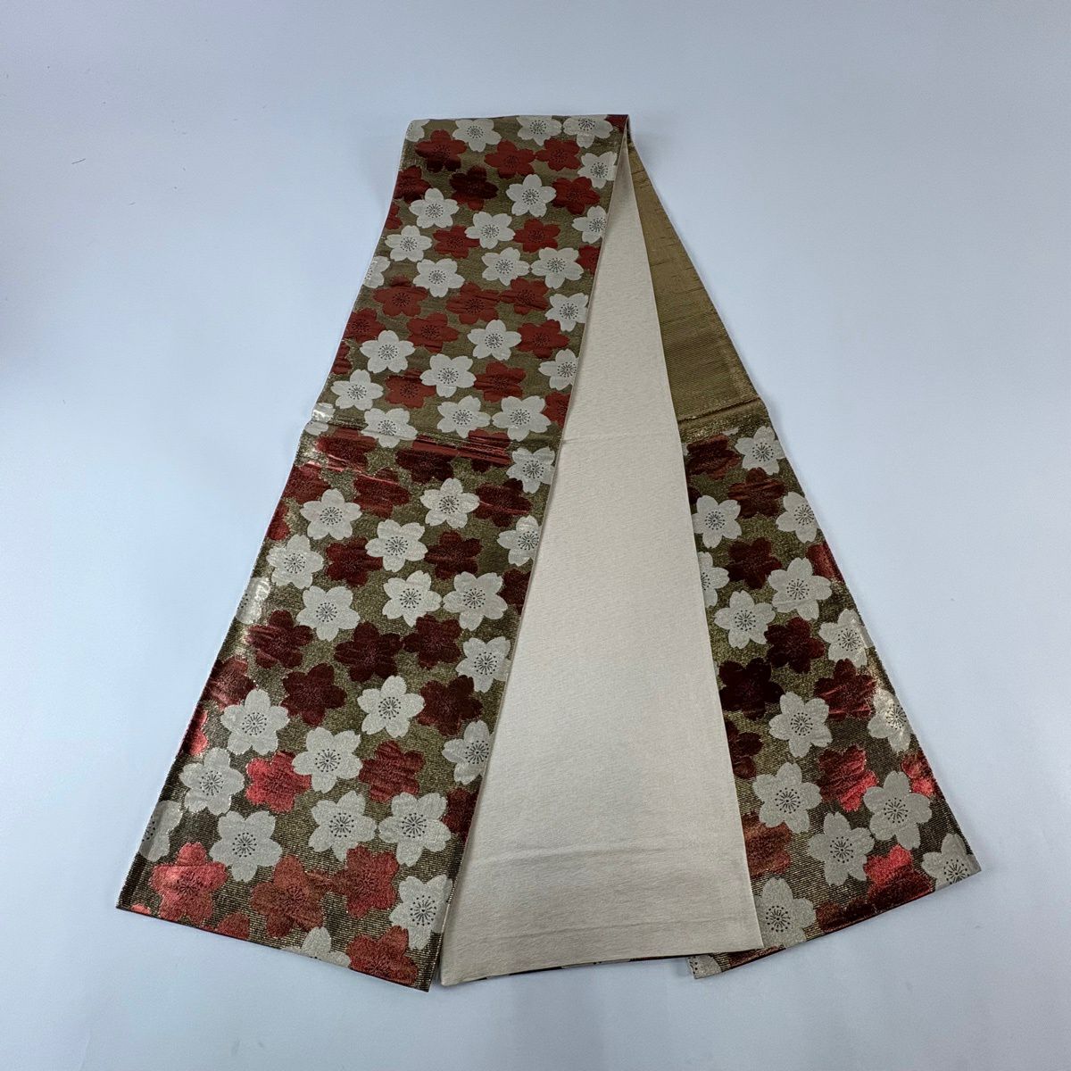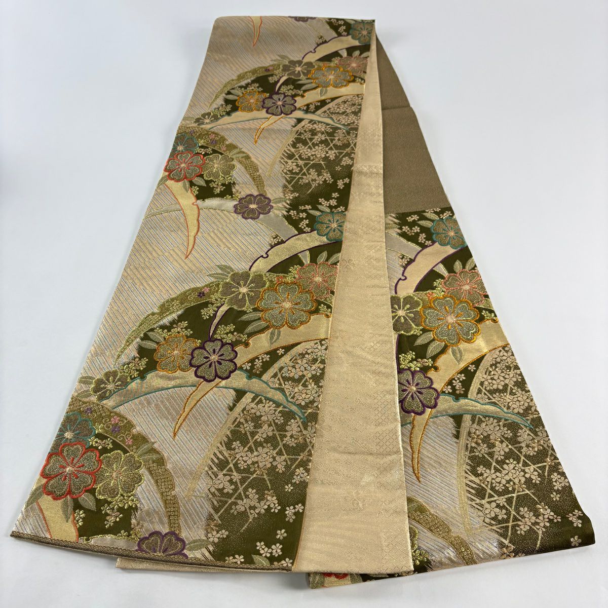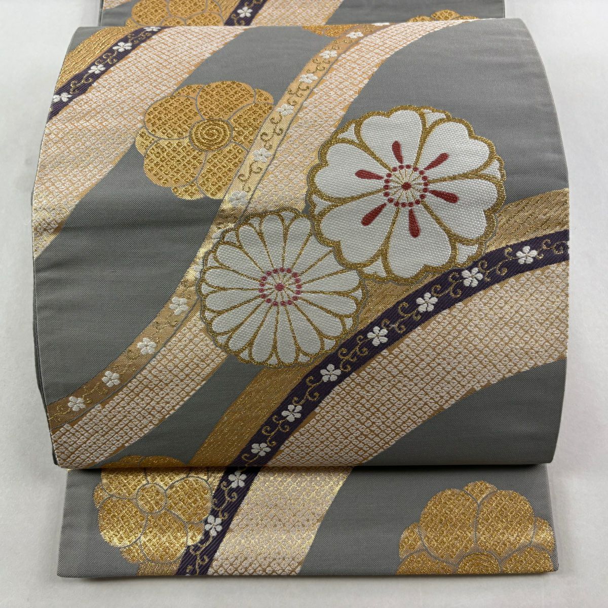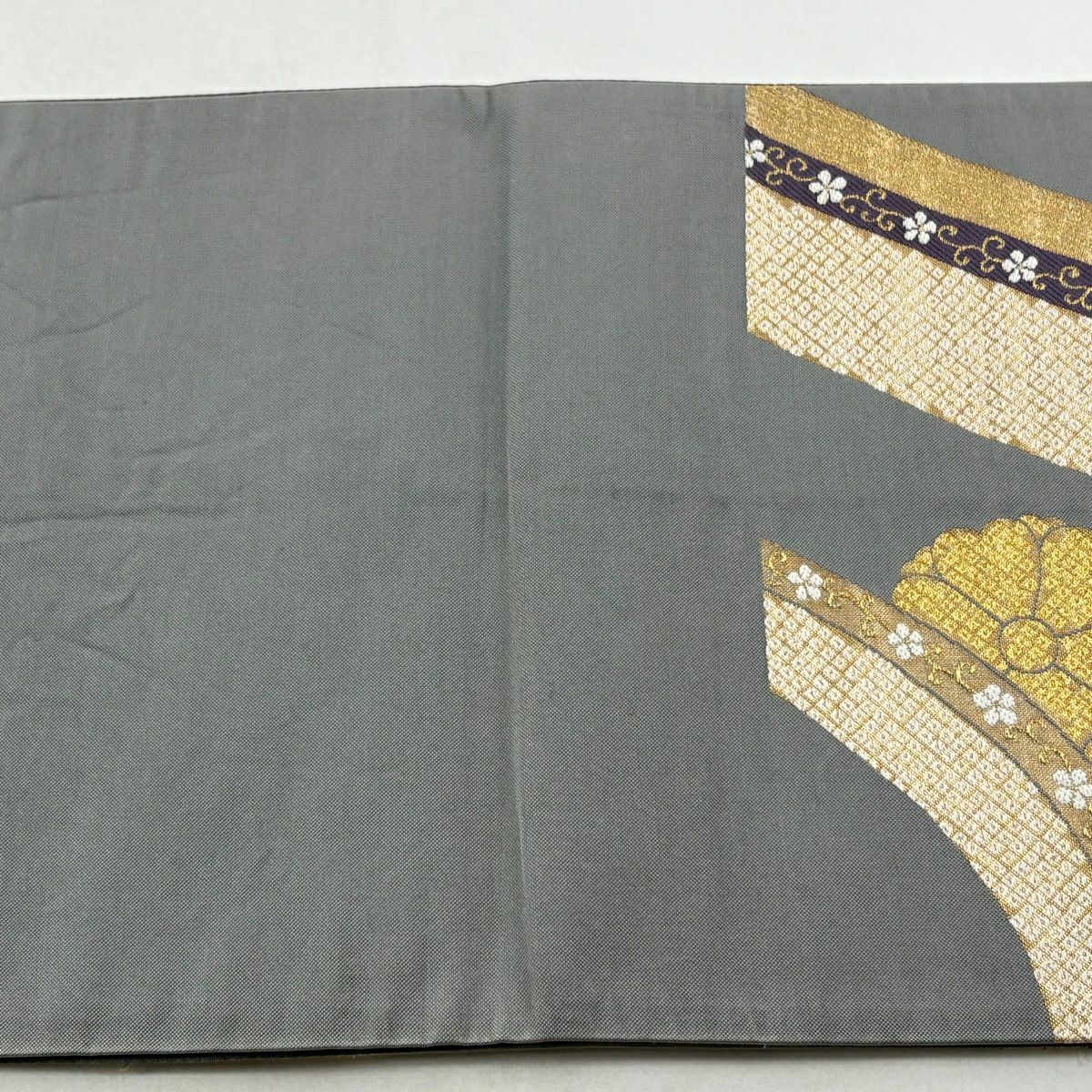 袋帯 秀品 桜 菊 金糸 箔 灰色 六通 正絹