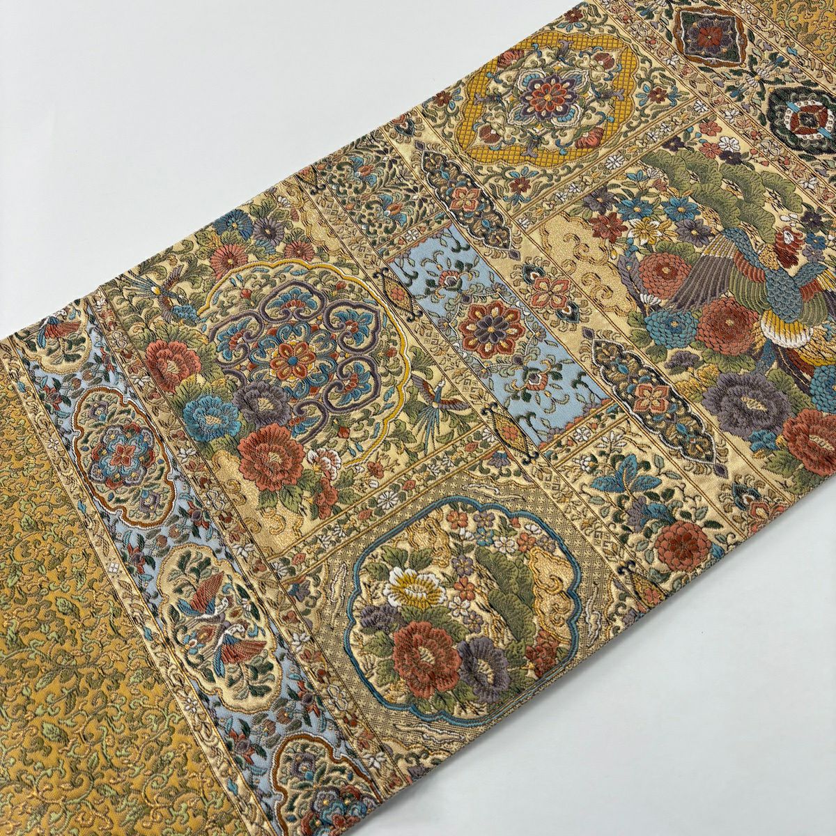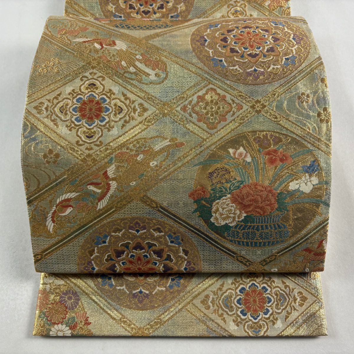 袋帯 秀品 鳳凰 草花 金糸 箔 金色 六通 正絹