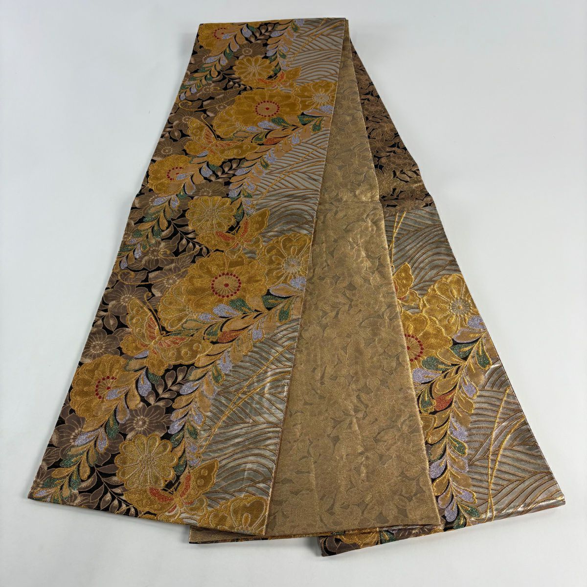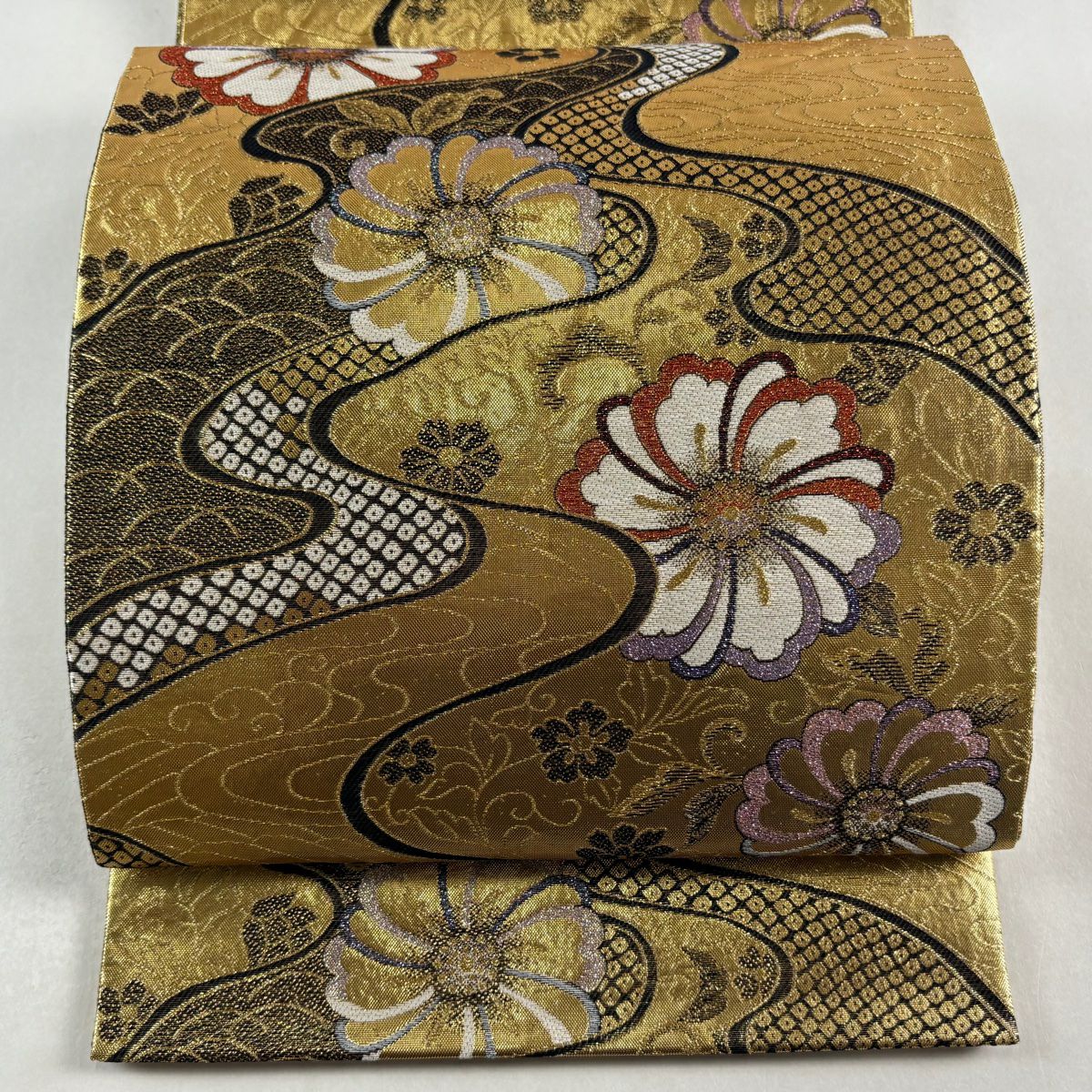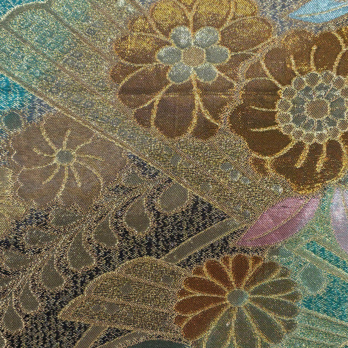 袋帯 秀品 花 流水 箔 金糸 金色 六通 正絹