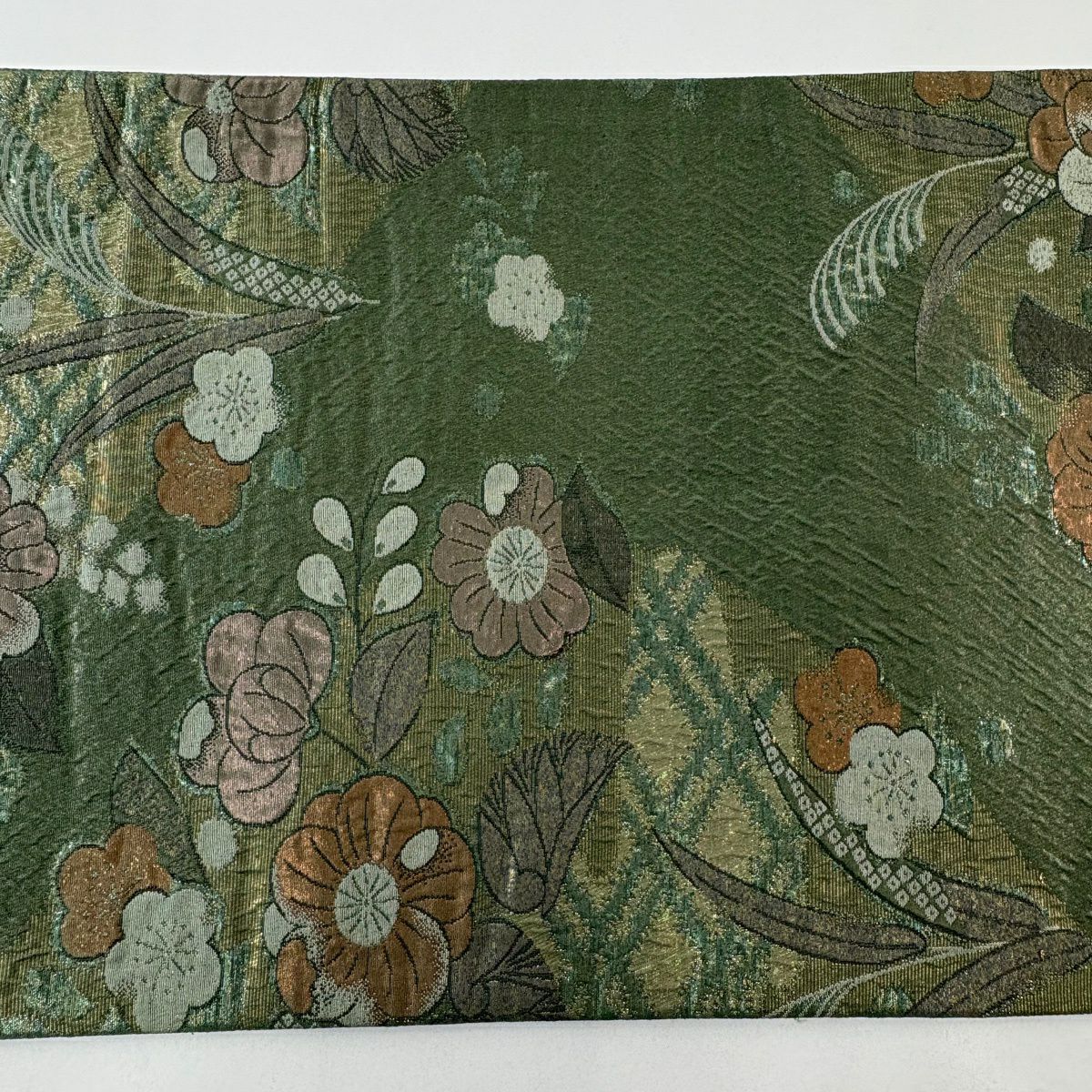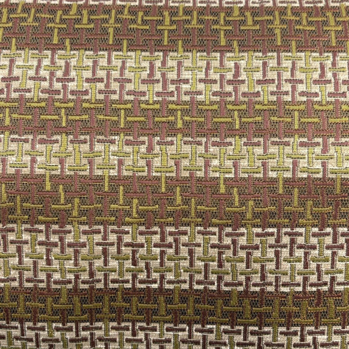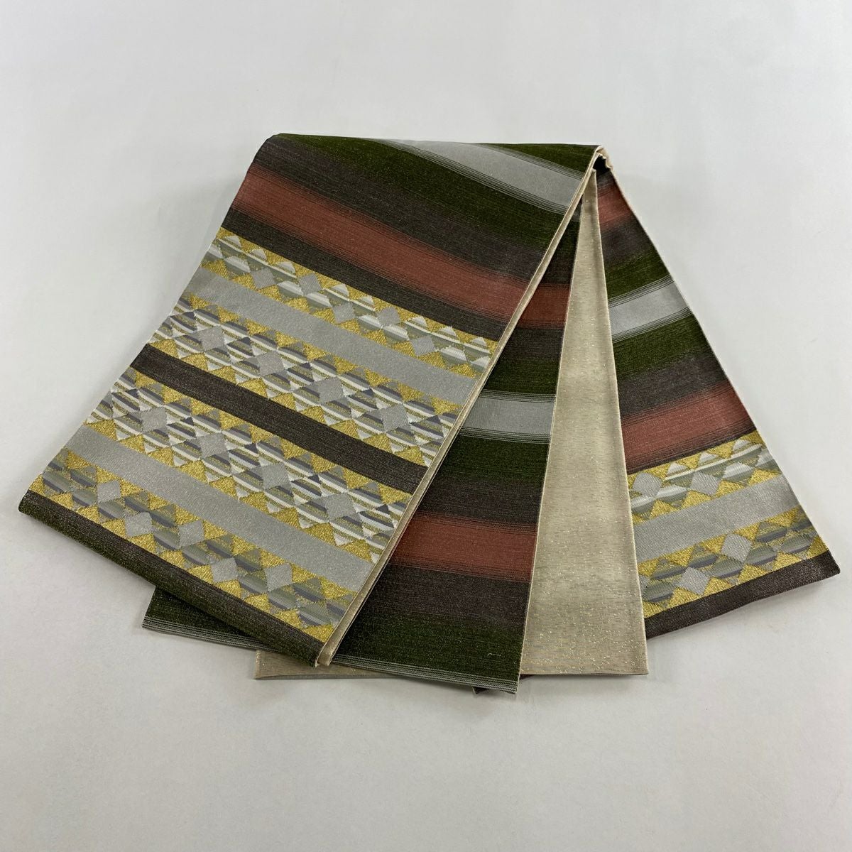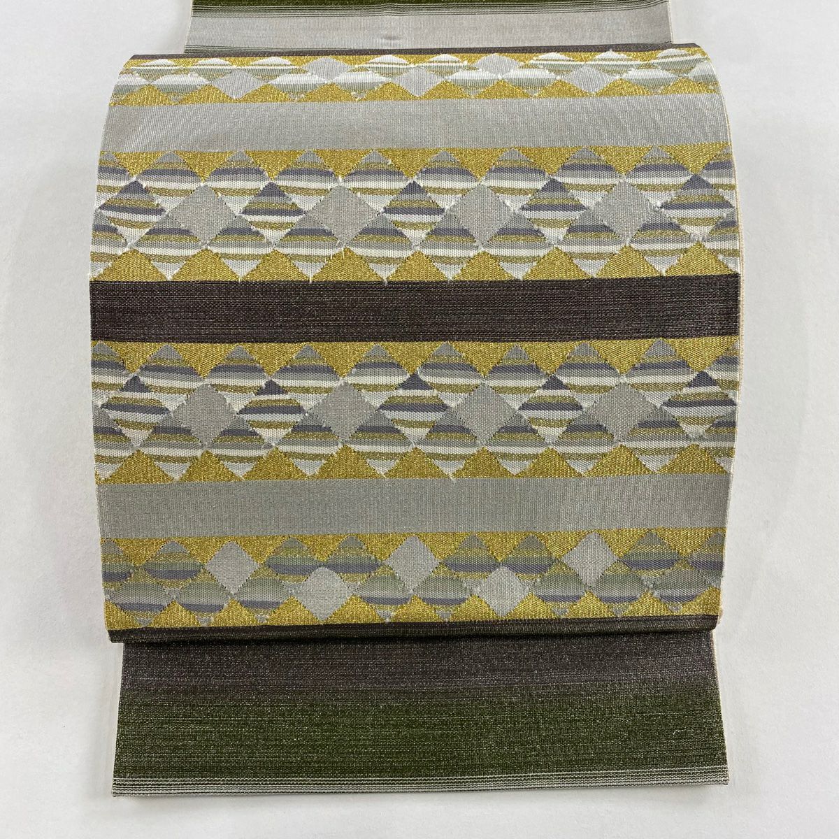 【美品】 袋帯 秀品 幾何学 茶緑色 全通 正絹