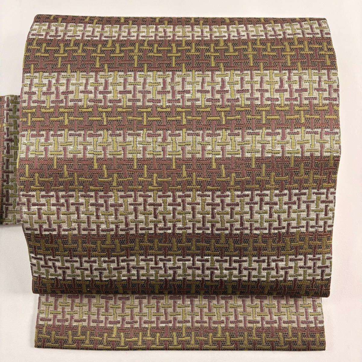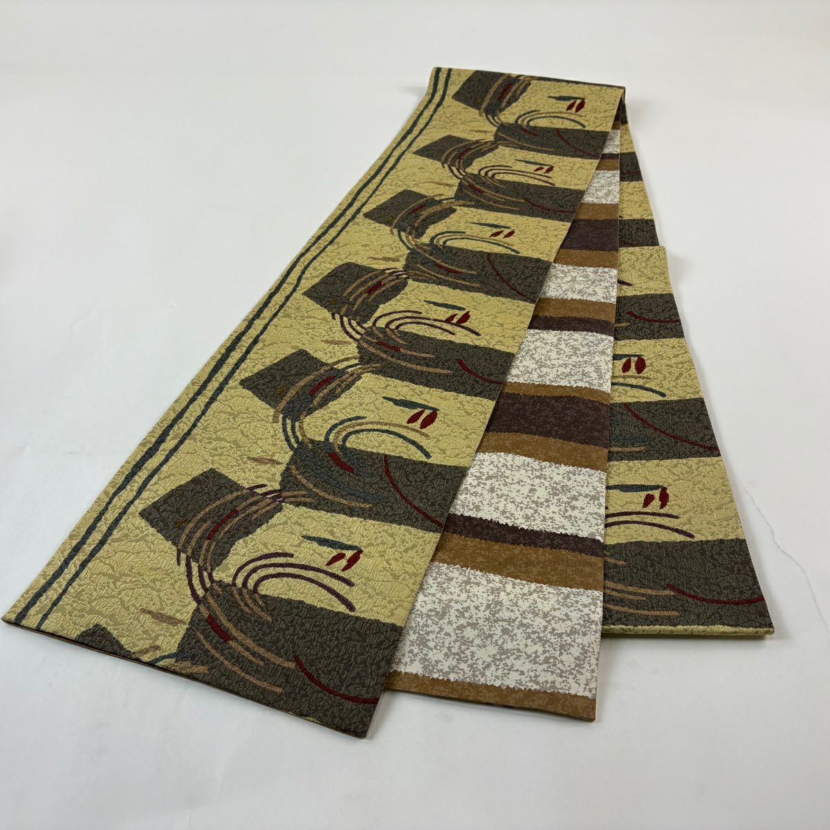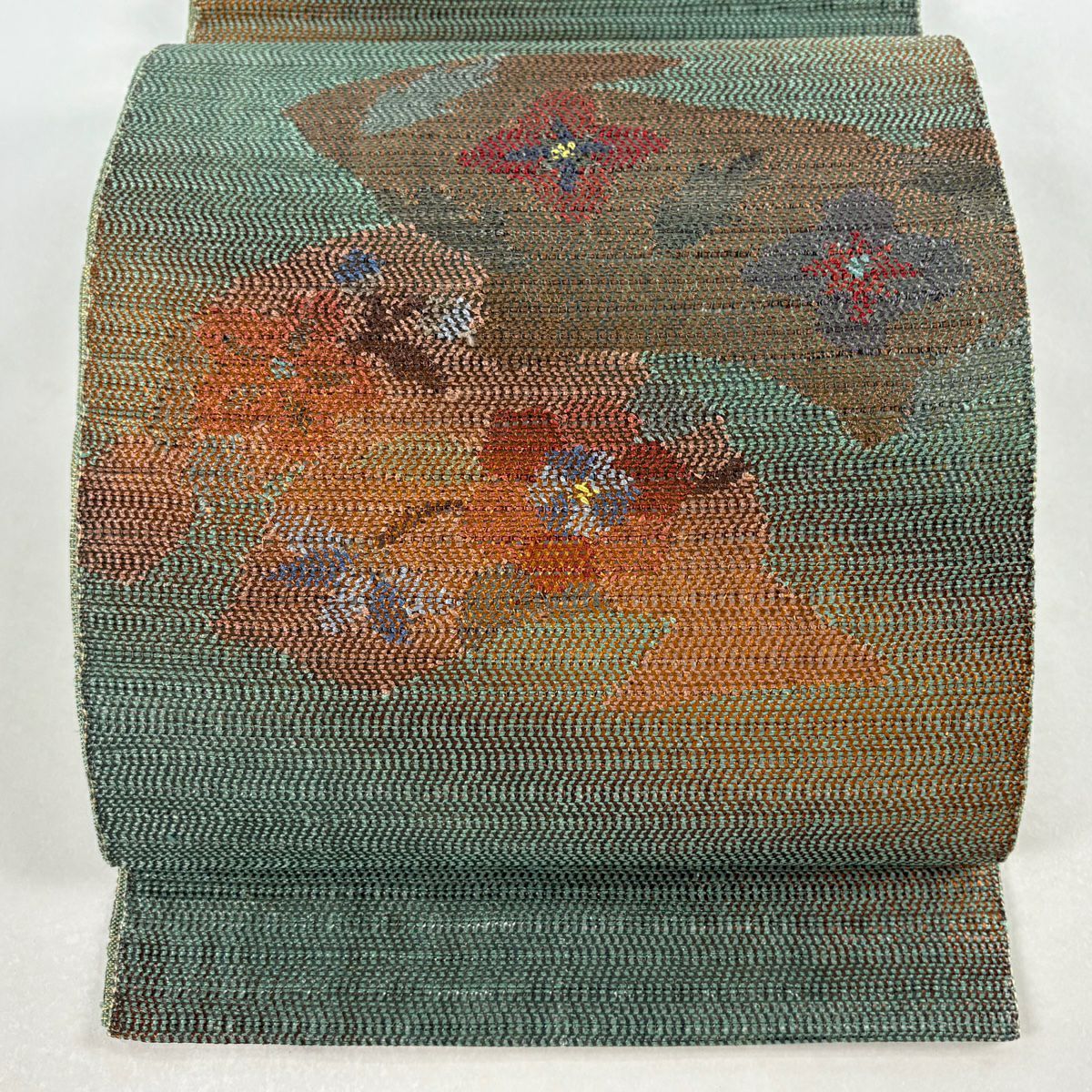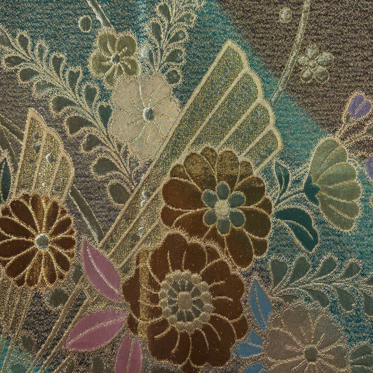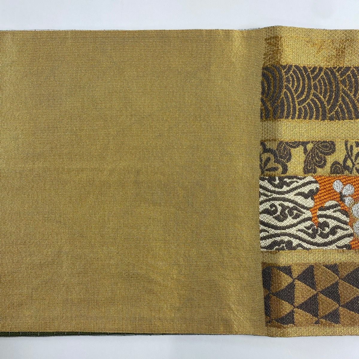 【美品】 袋帯 秀品 幾何学 茶緑色 全通 正絹
