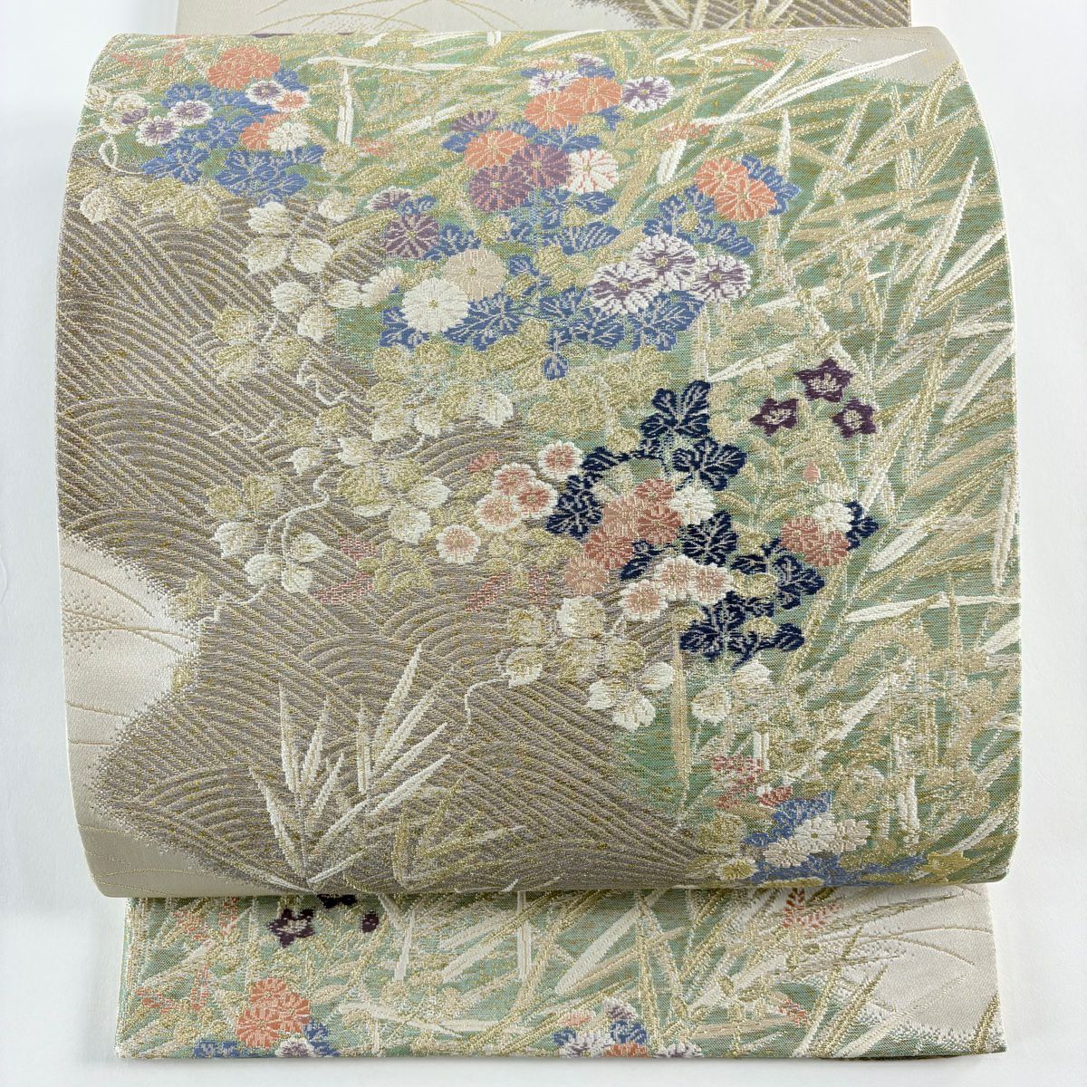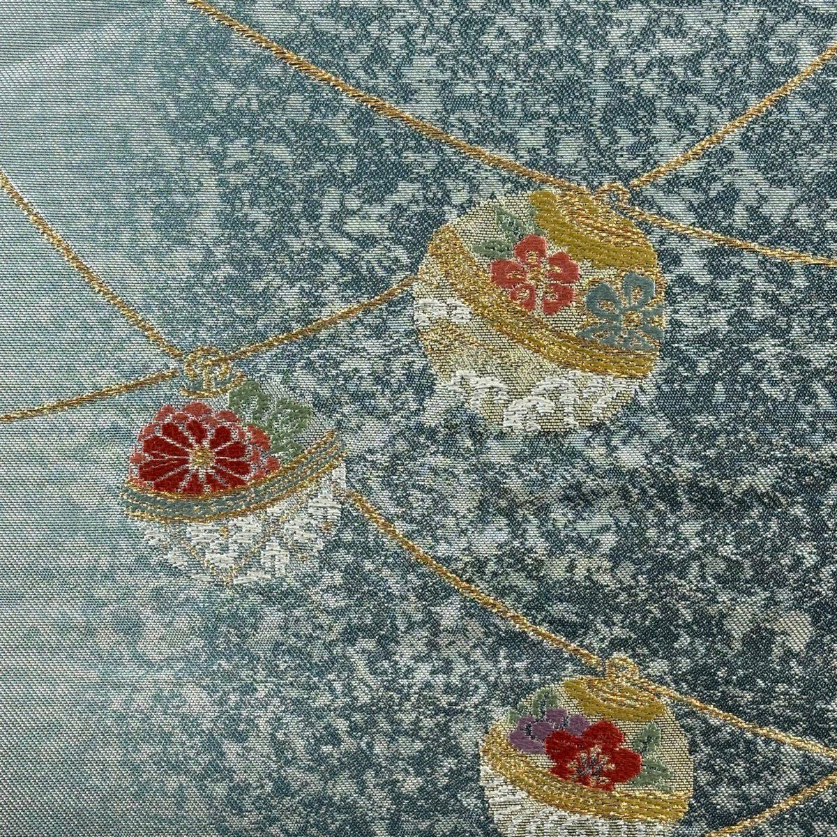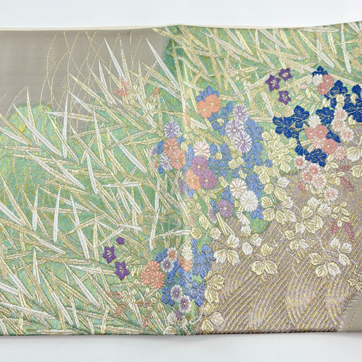 名古屋帯 秀品 鈴 草花 箔 金糸 青灰色 正絹