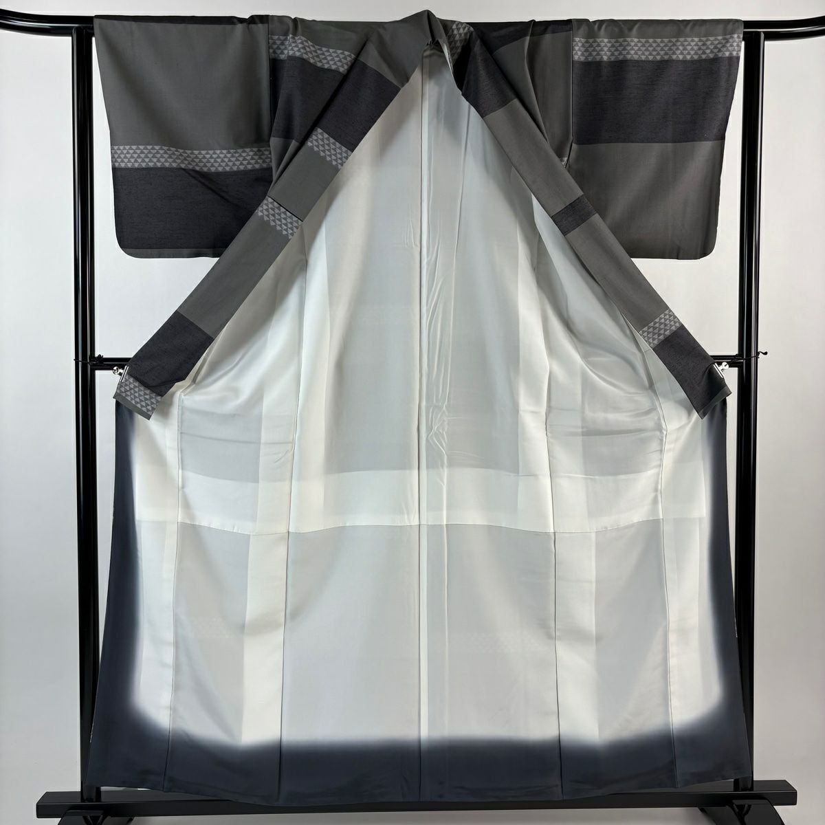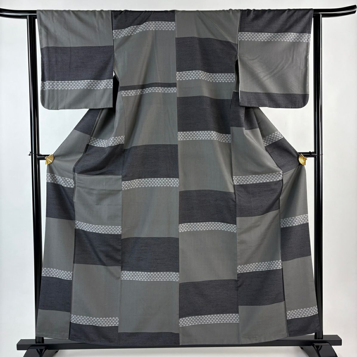 【在庫一掃】 紬 身丈165.5cm 裄丈66cm M 袷 縞 灰色 正絹 秀品