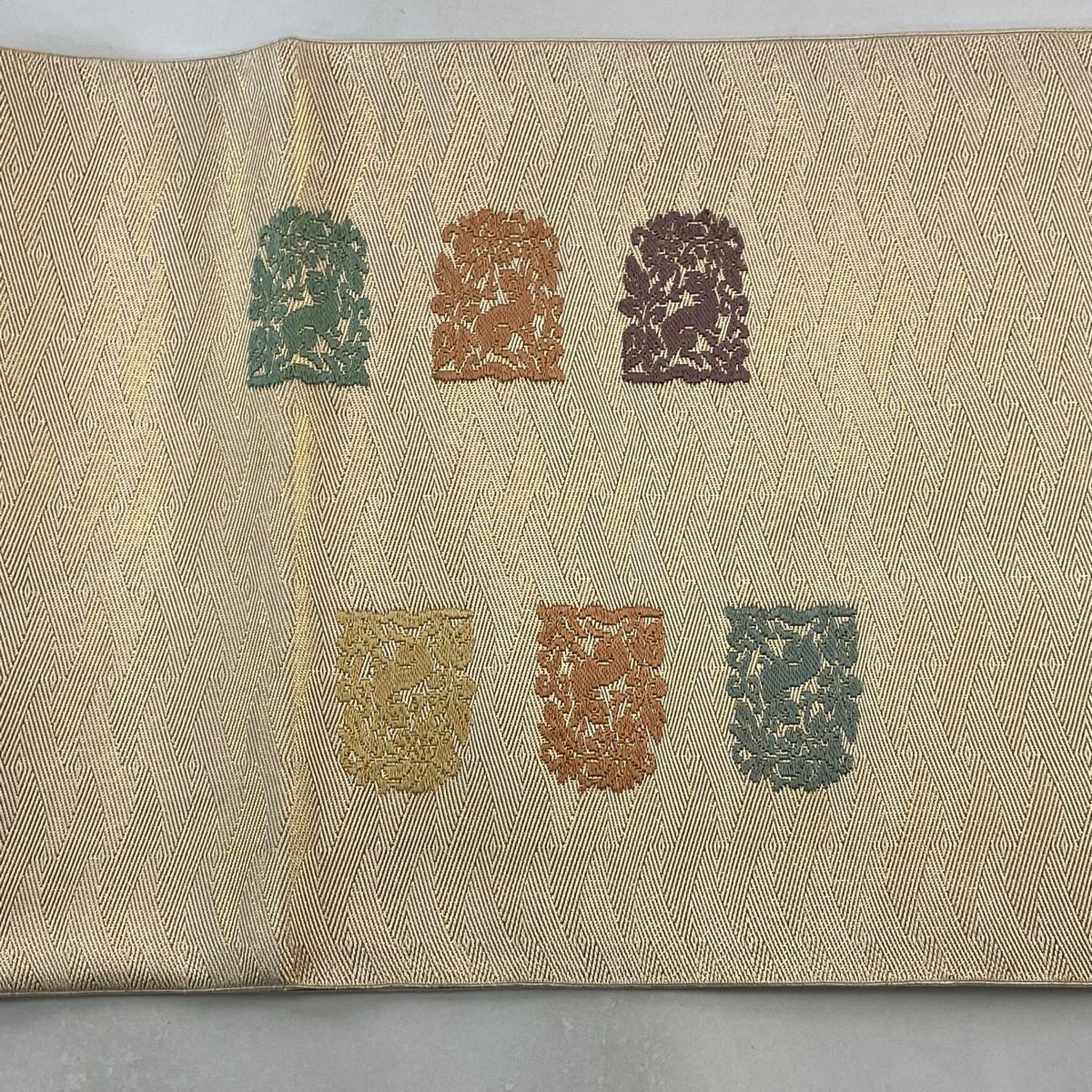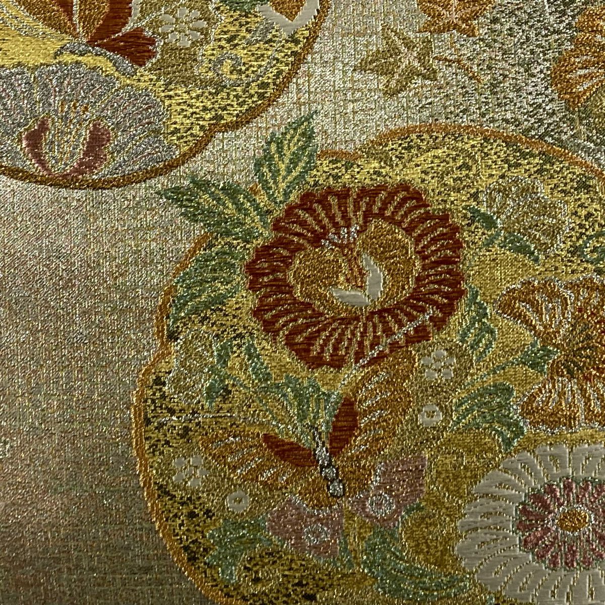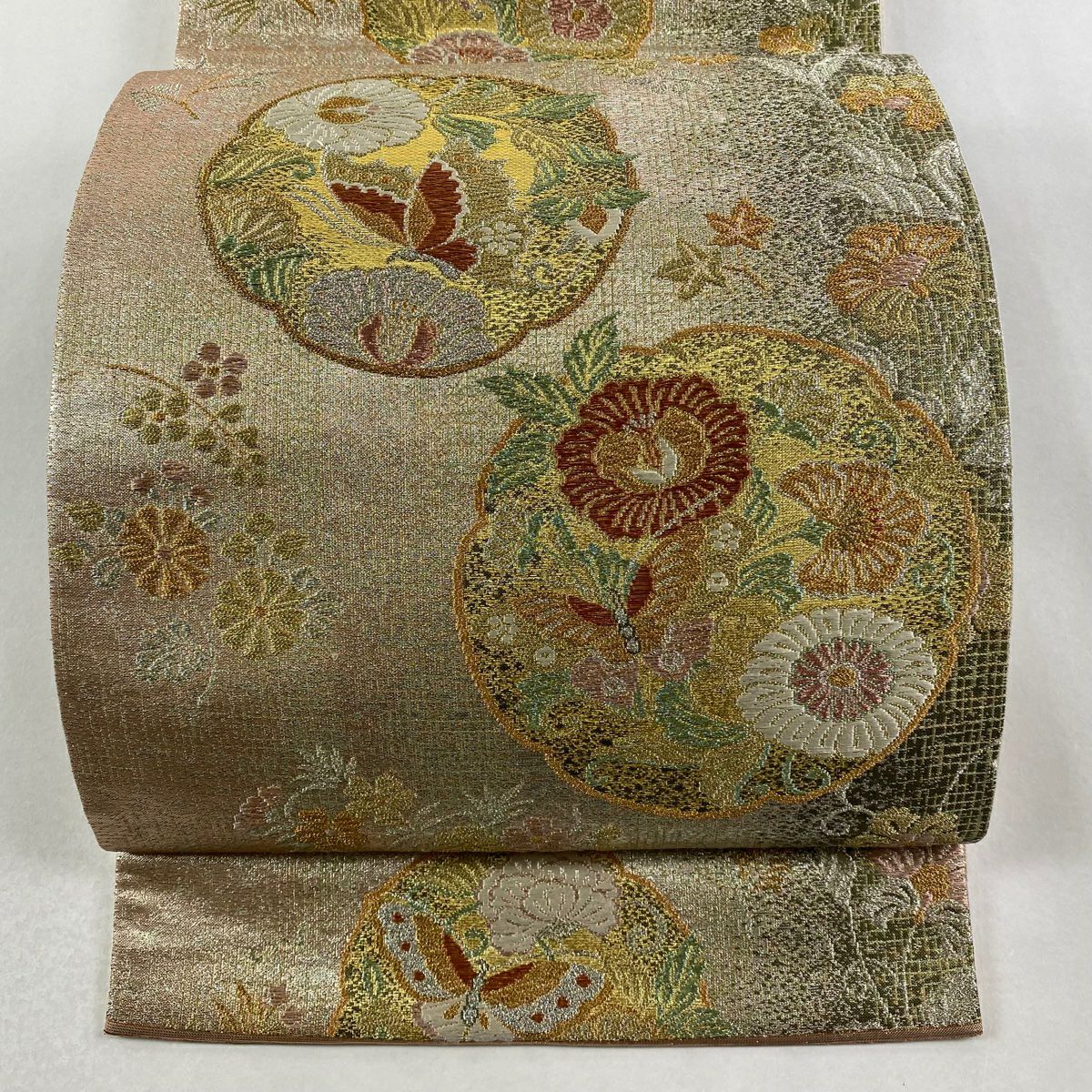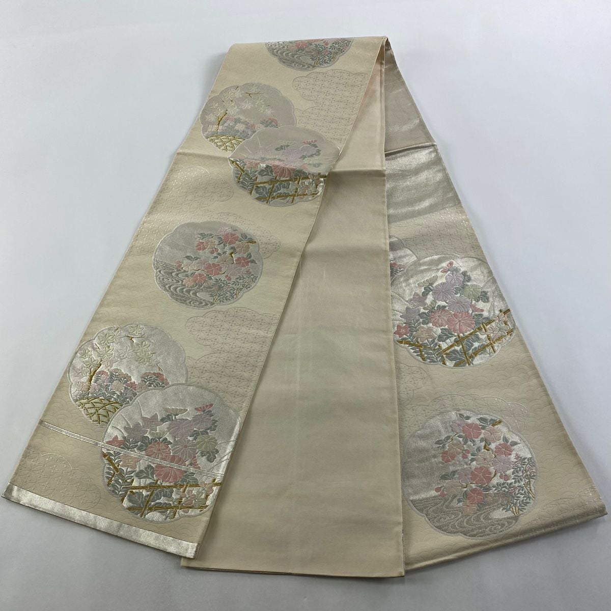 【在庫一掃】 袋帯 秀品 草花 七宝繋ぎ 唐織 金糸 ベージュ 六通 正絹