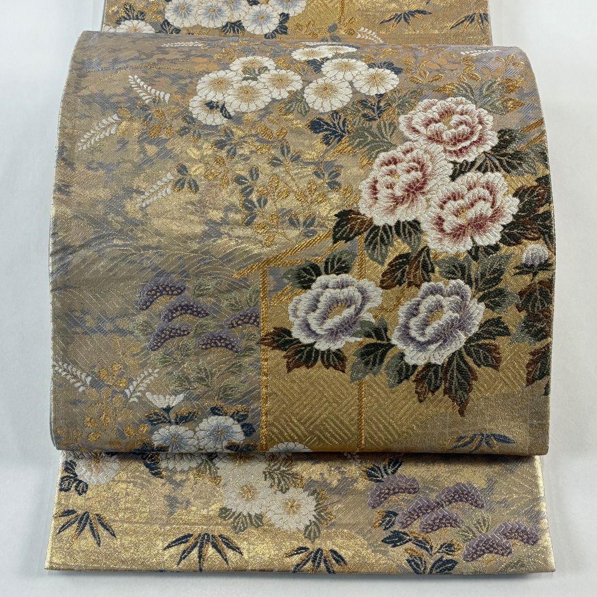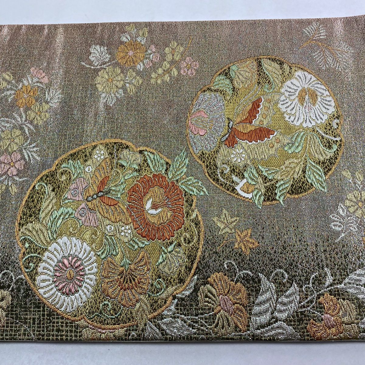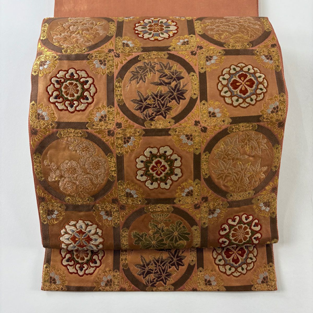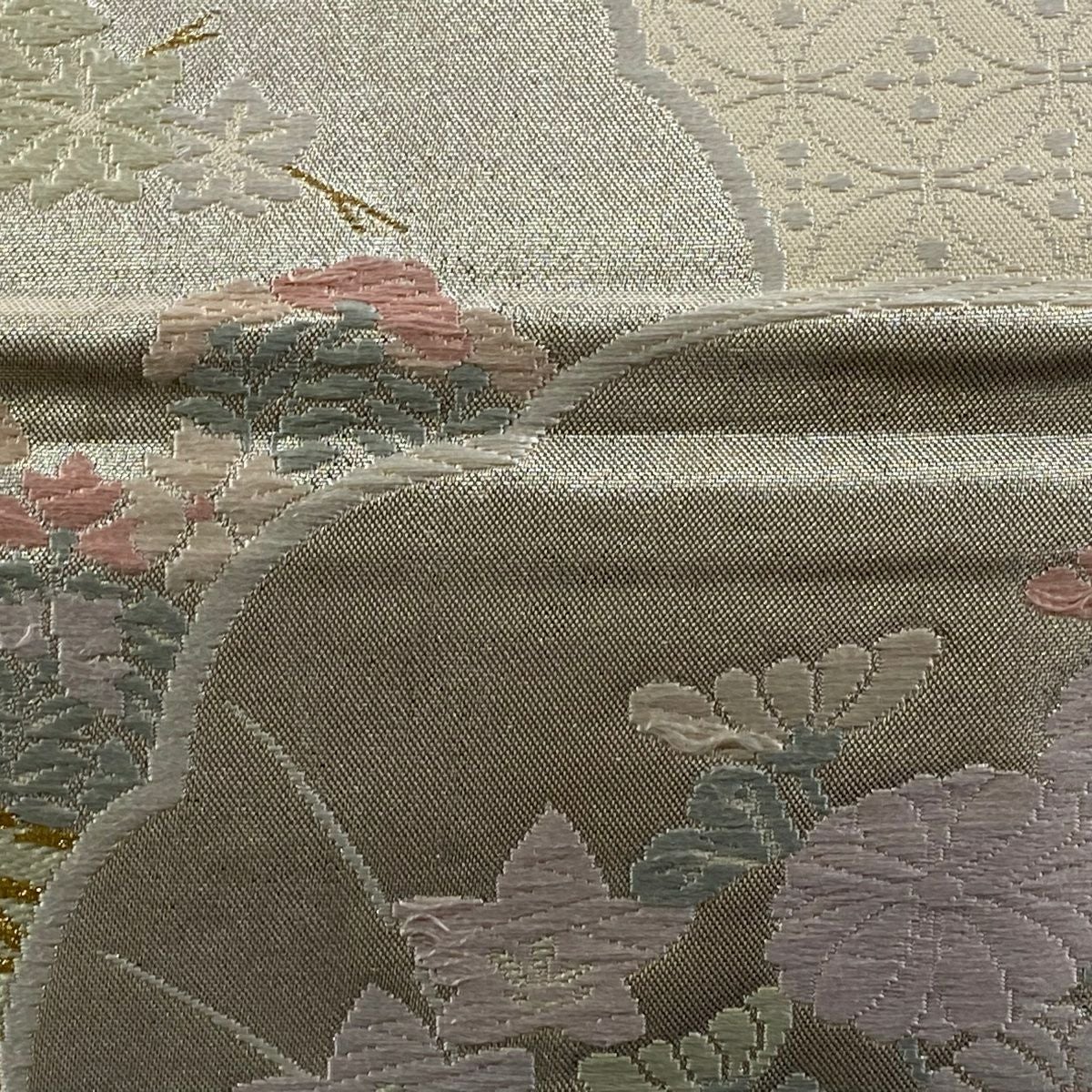 【在庫一掃】 袋帯 秀品 草花 七宝繋ぎ 唐織 金糸 ベージュ 六通 正絹