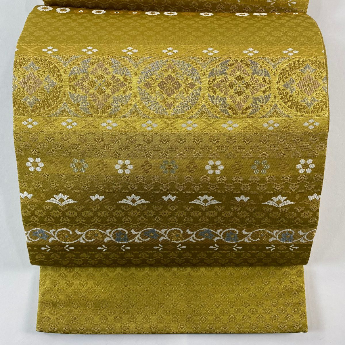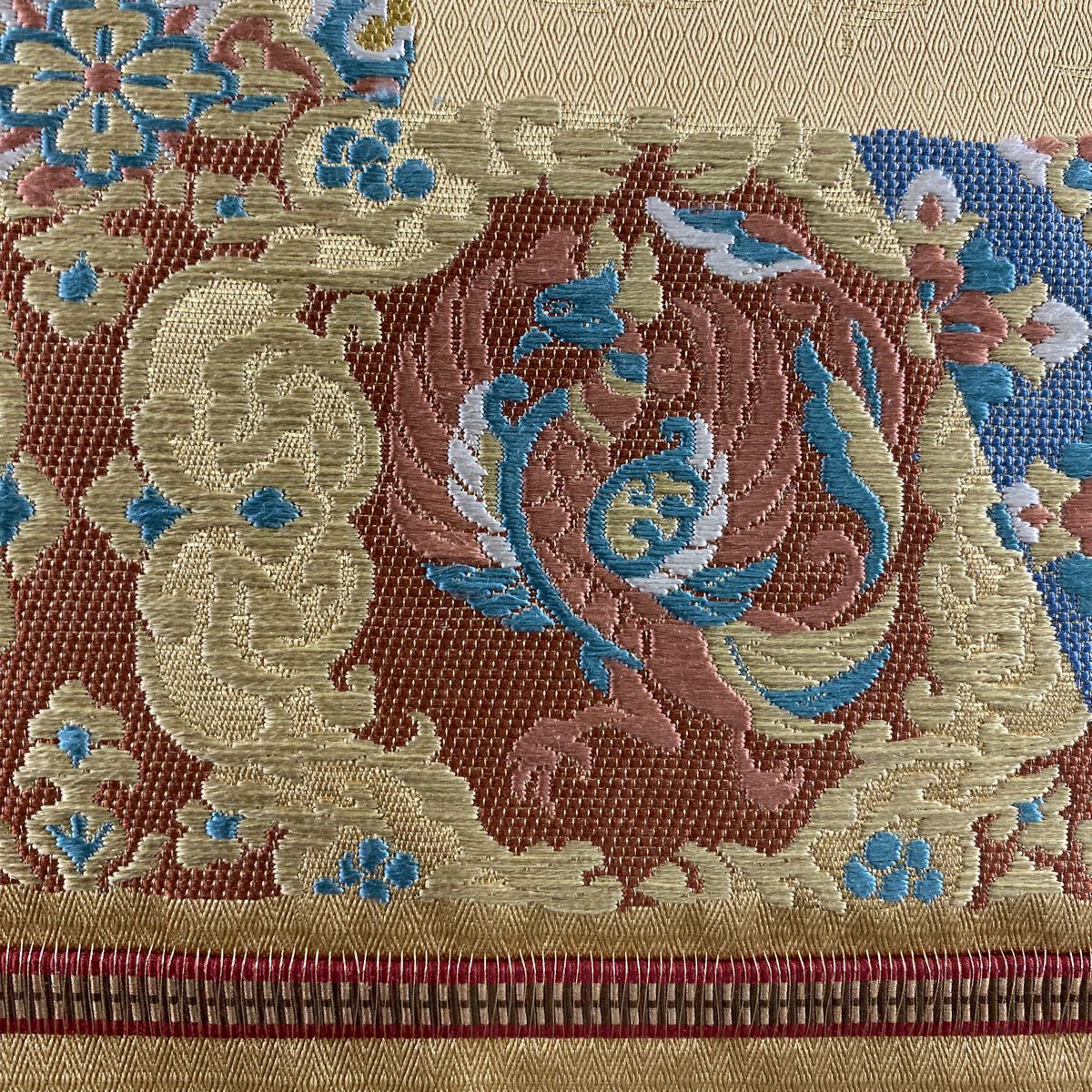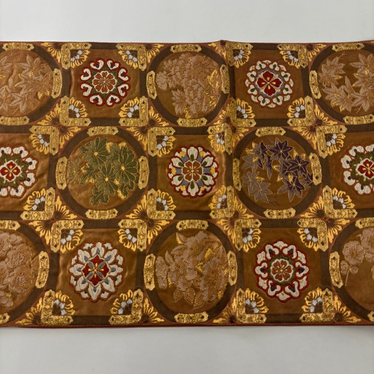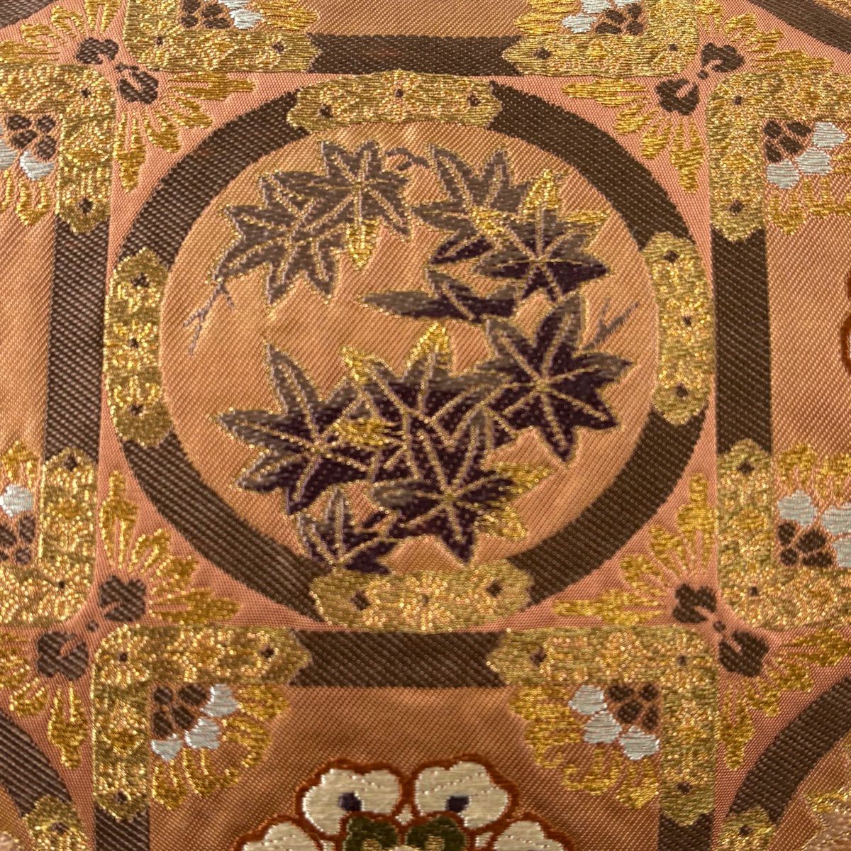 【在庫一掃】 袋帯 秀品 草花 七宝繋ぎ 唐織 金糸 ベージュ 六通 正絹