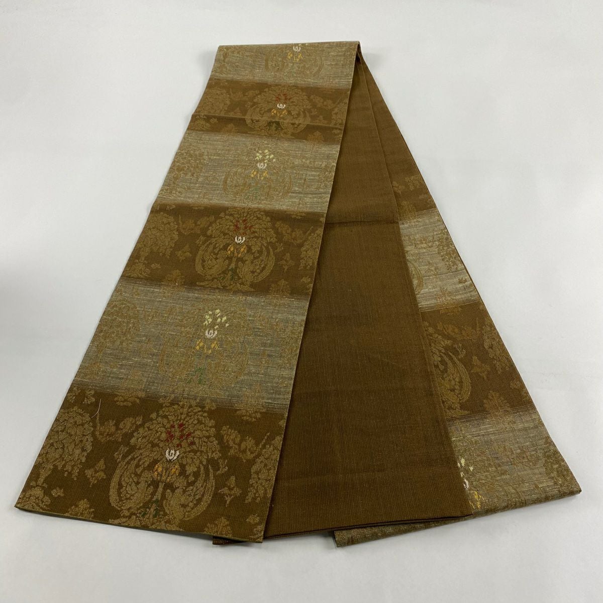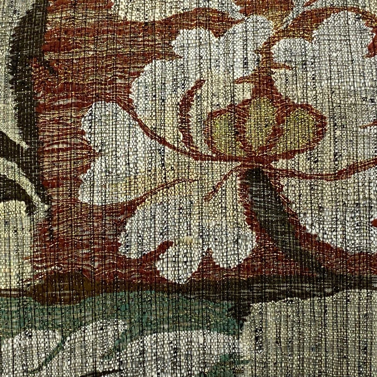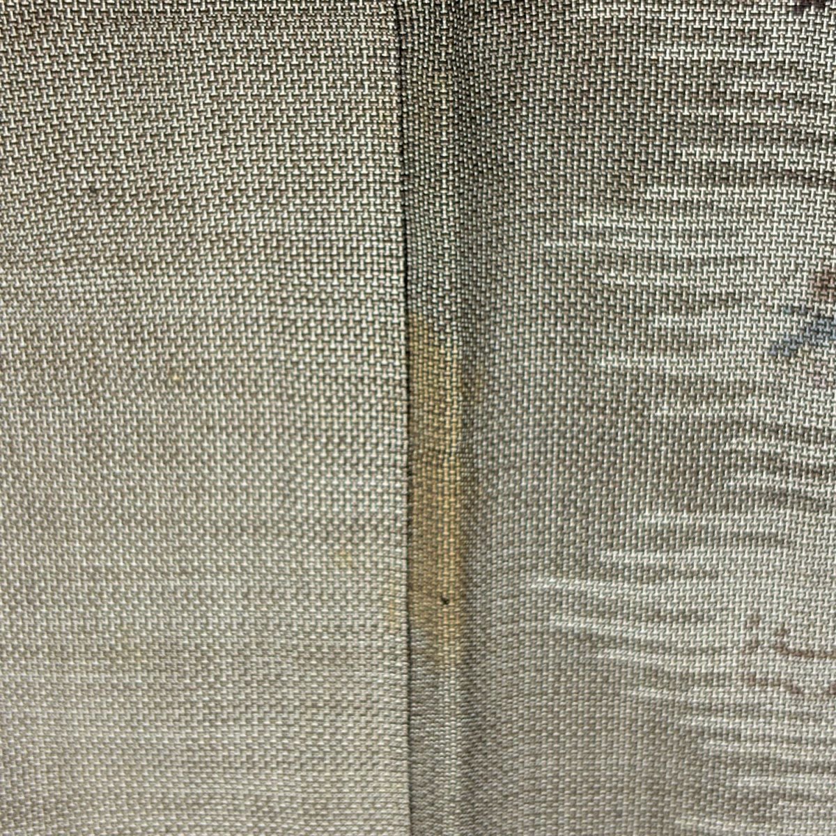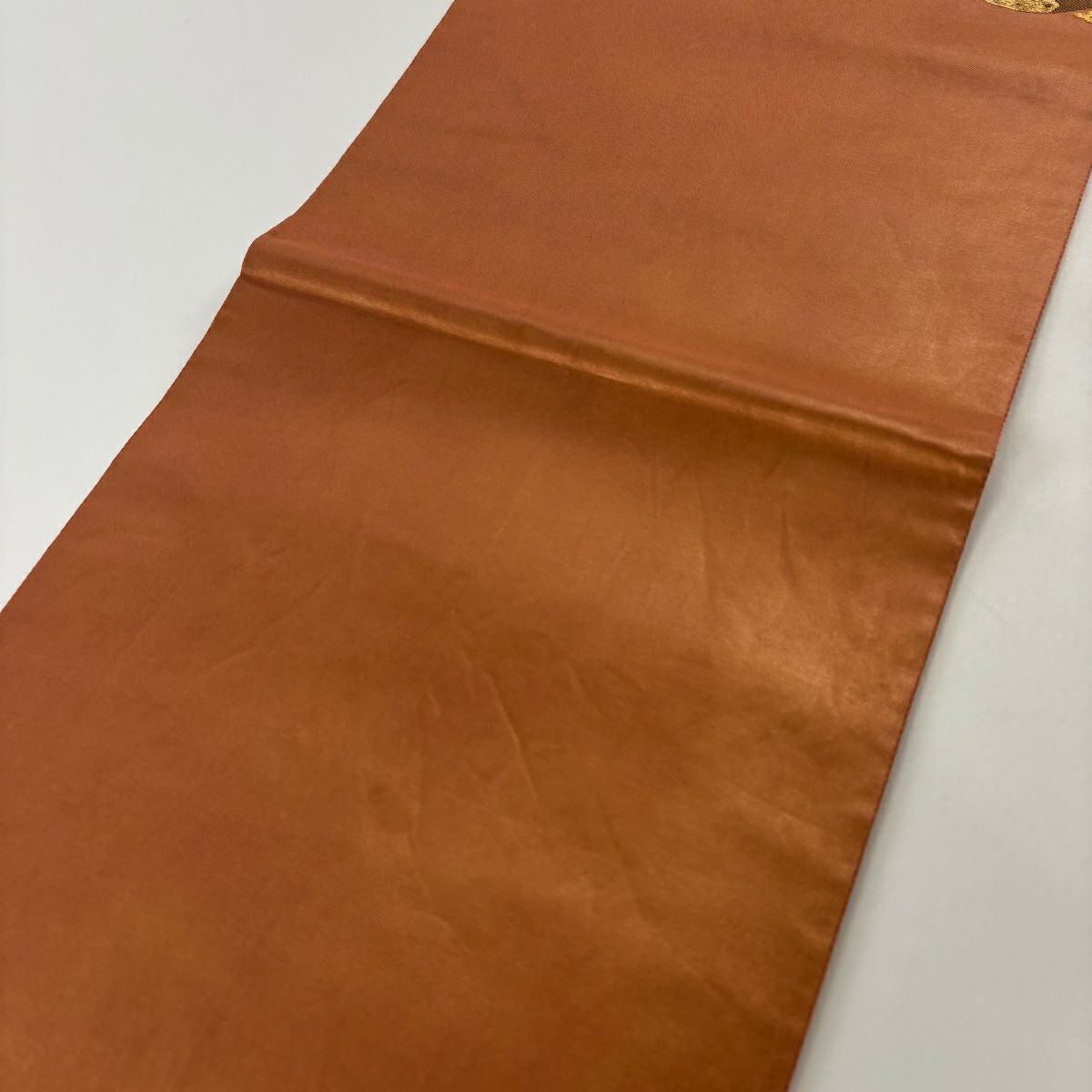 【在庫一掃】 【美品】 袋帯 秀品 道長取り 草花 金糸 箔 薄茶色 六通 正絹