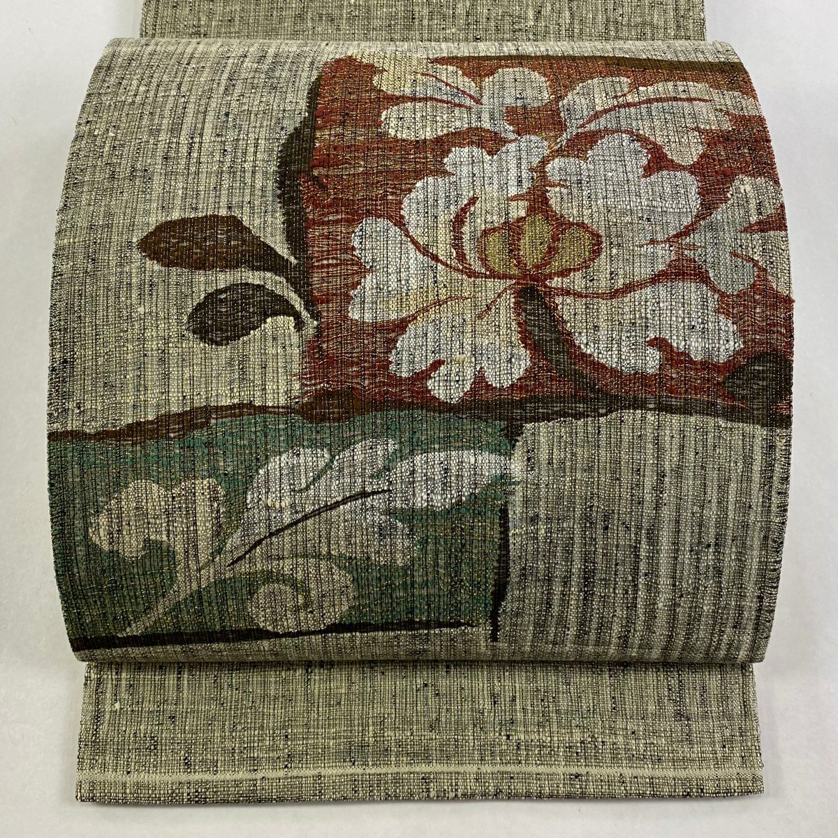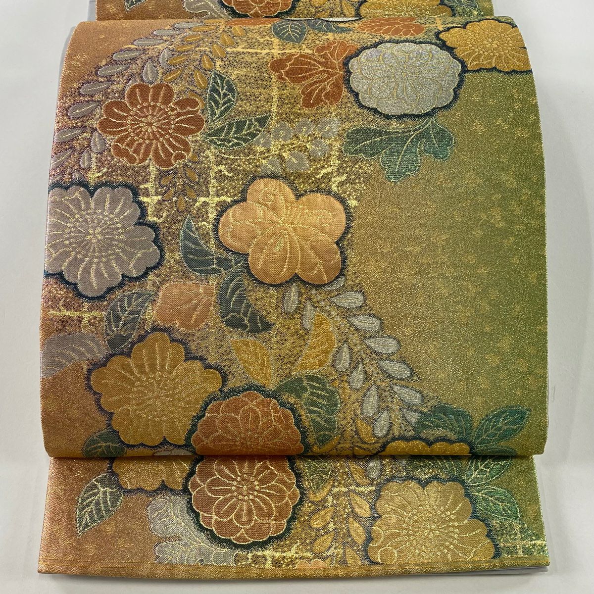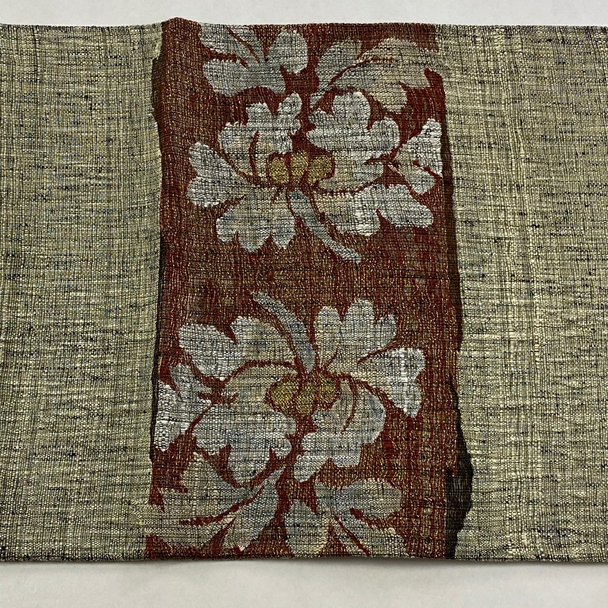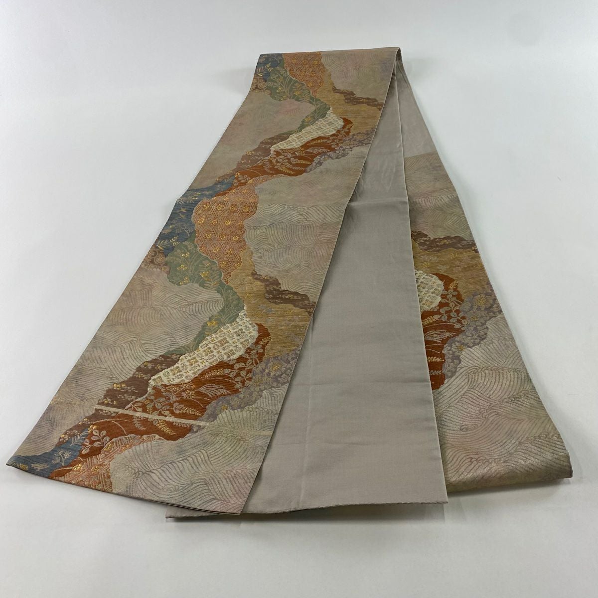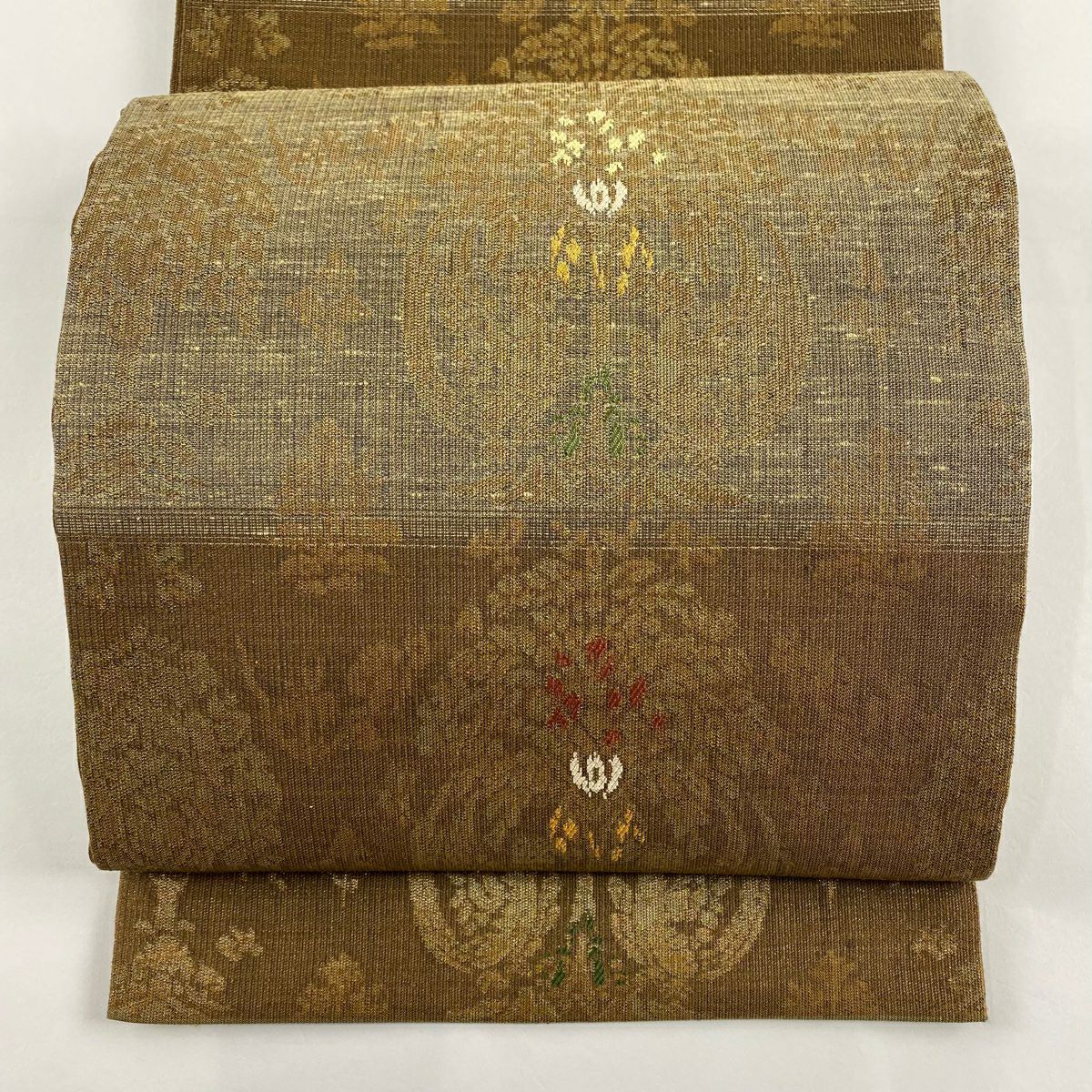 【在庫一掃】 【美品】 袋帯 秀品 道長取り 草花 金糸 箔 薄茶色 六通 正絹