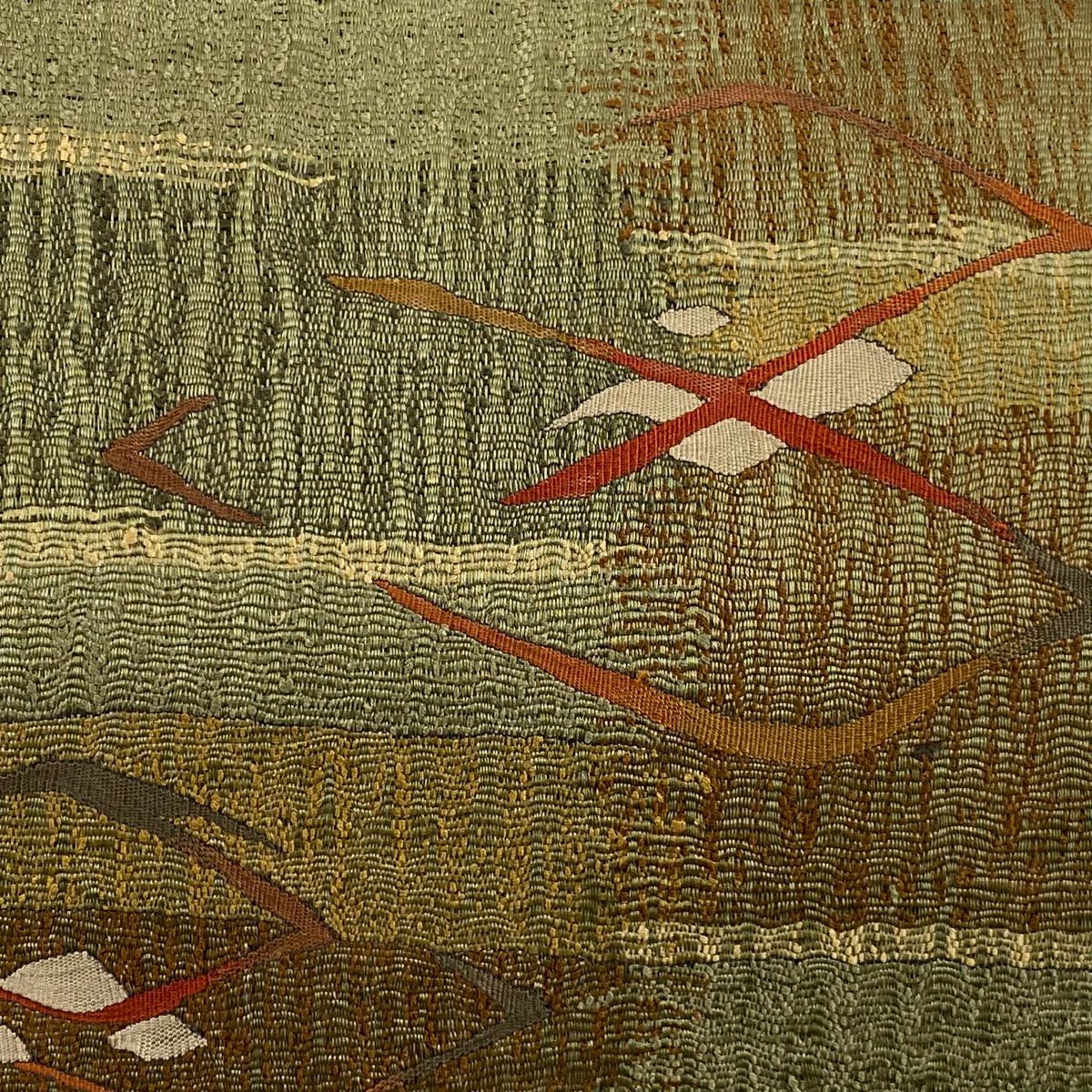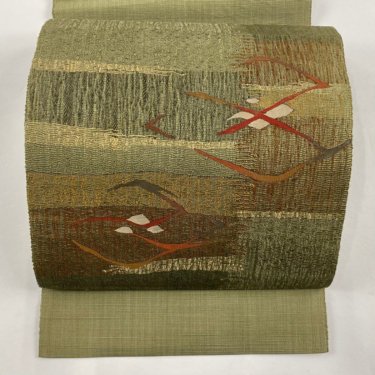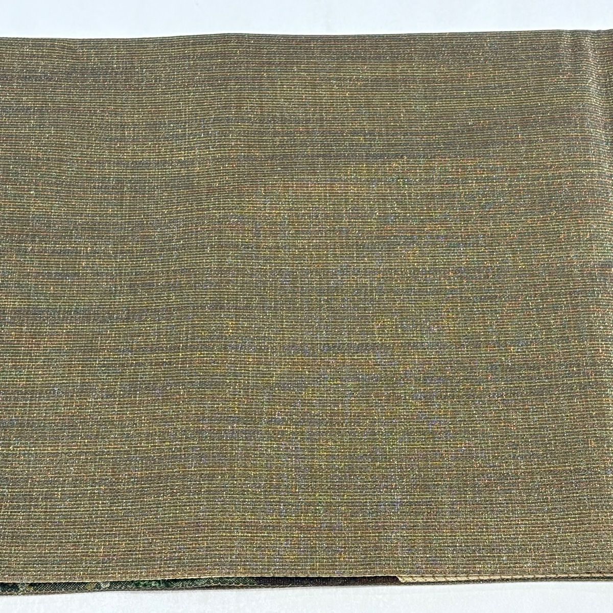 【在庫一掃】 【美品】 袋帯 秀品 紬地 樹下鳥獣文 樹木 箔 茶緑色 六通 正絹