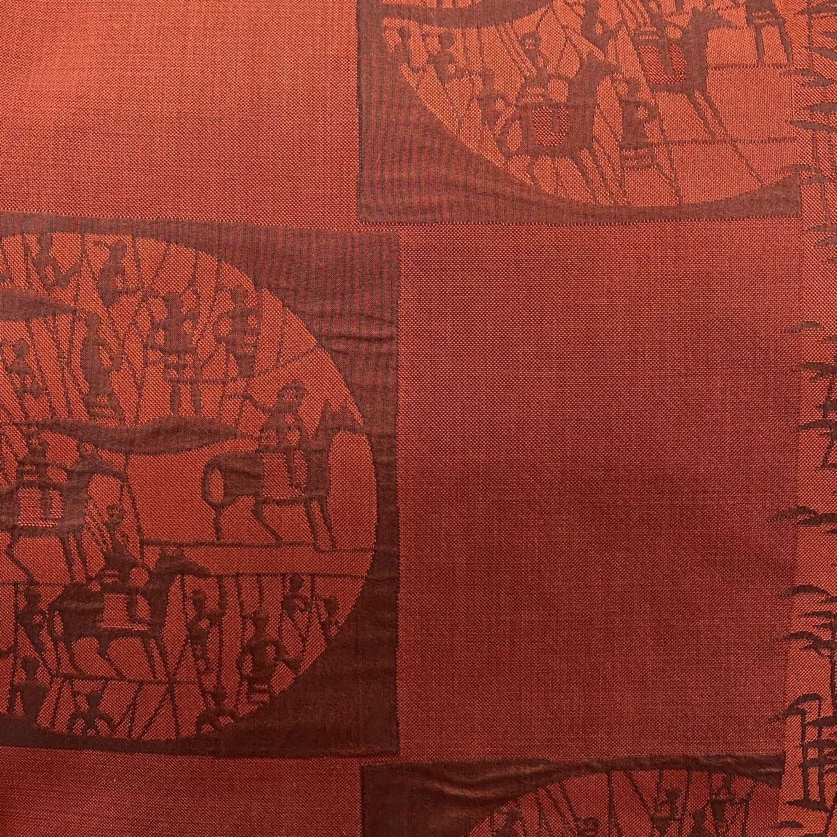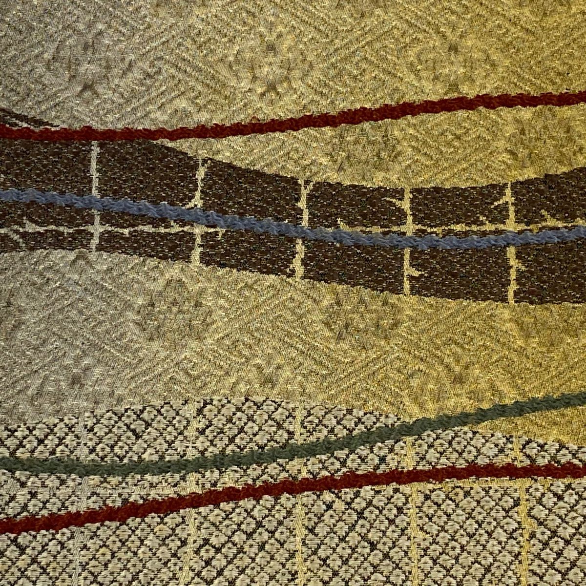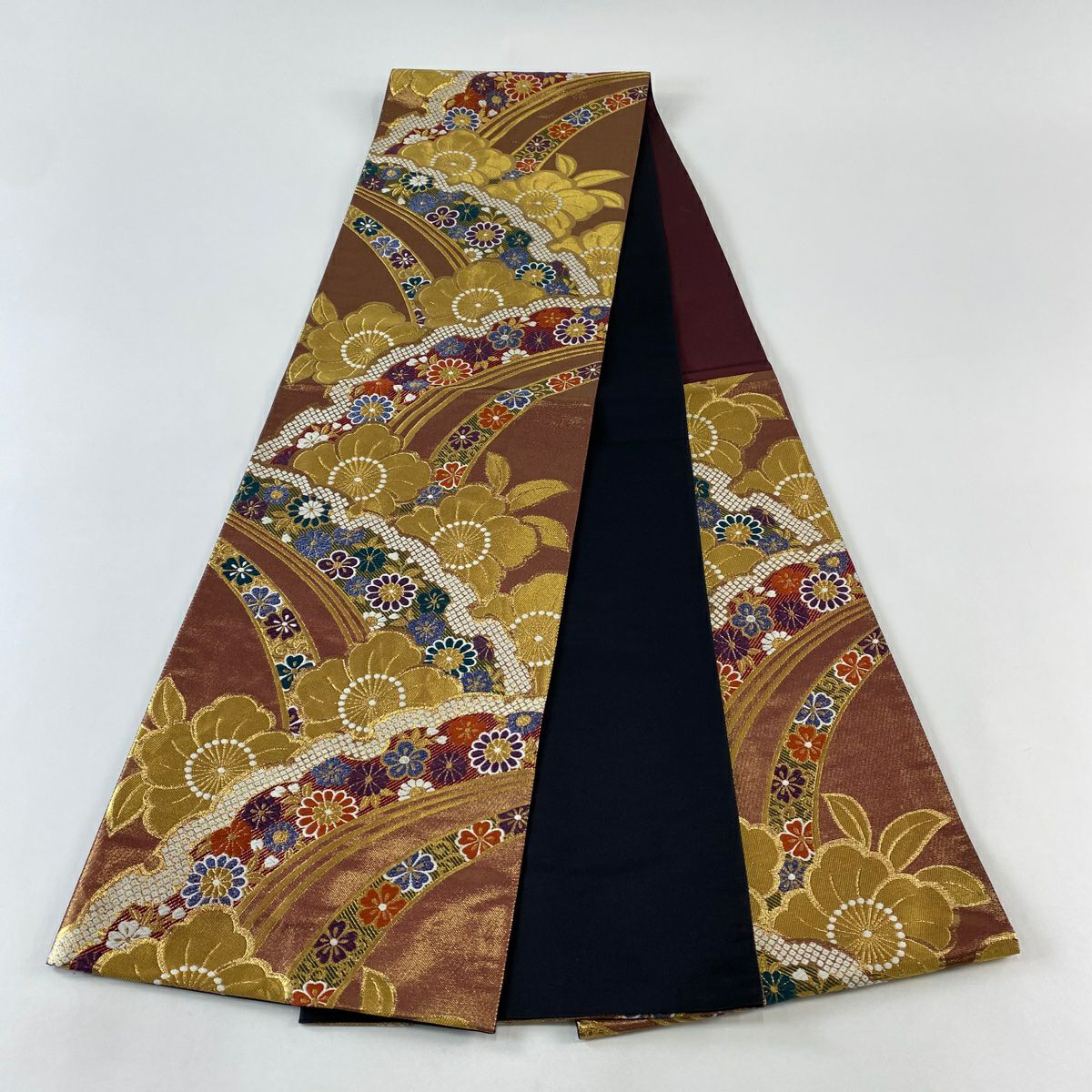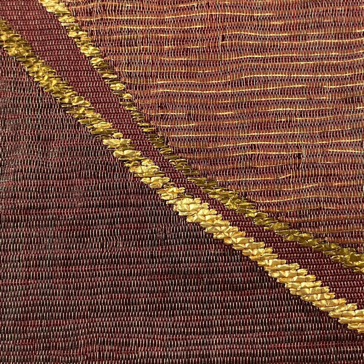 【在庫一掃】 袋帯 秀品 幾何学模様 波 箔 金通し えんじ色 お太鼓柄 正絹