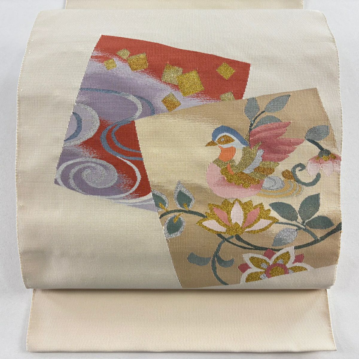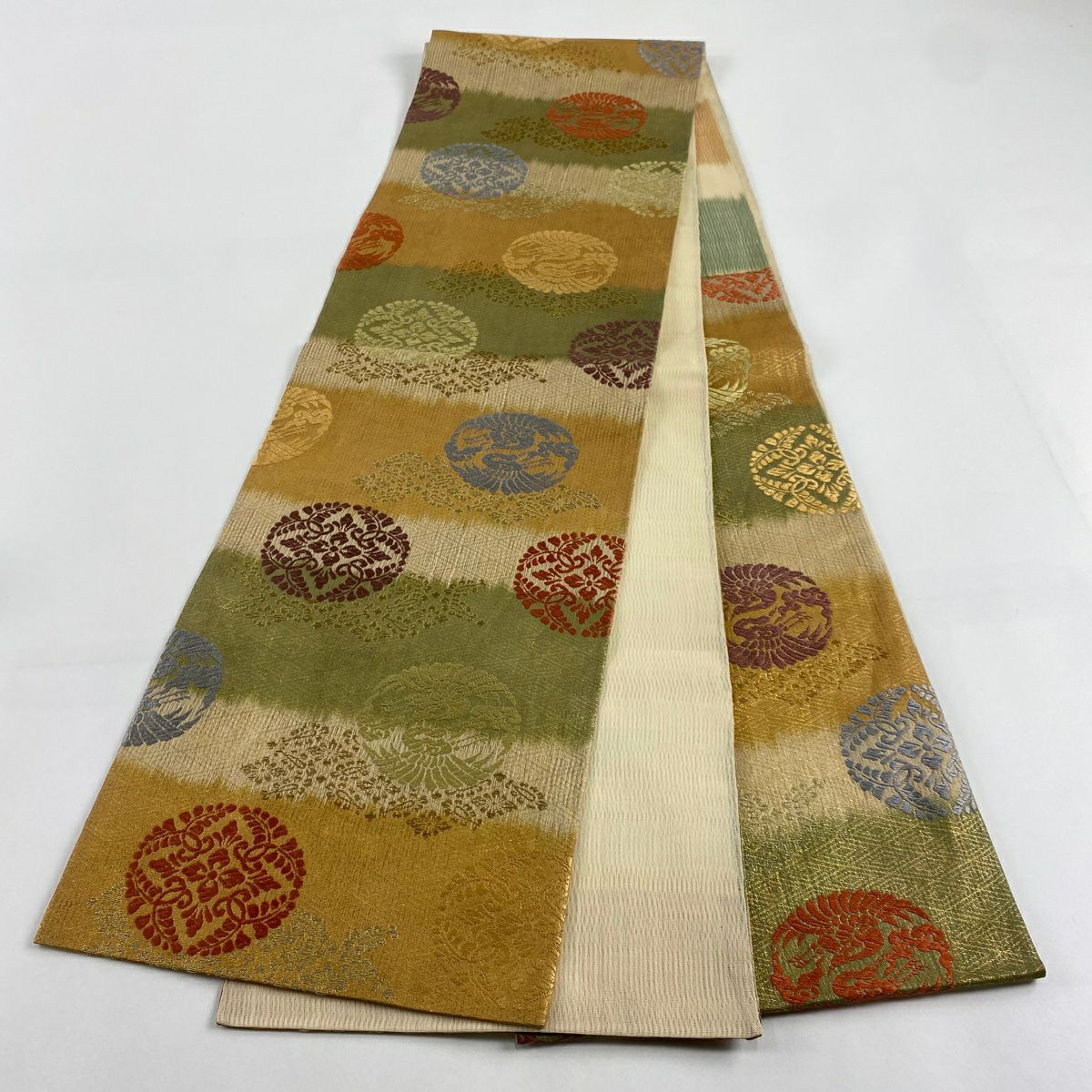 【在庫一掃】 袋帯 秀品 八つ藤の丸 向鳥 唐織 箔 ベージュ 六通 正絹