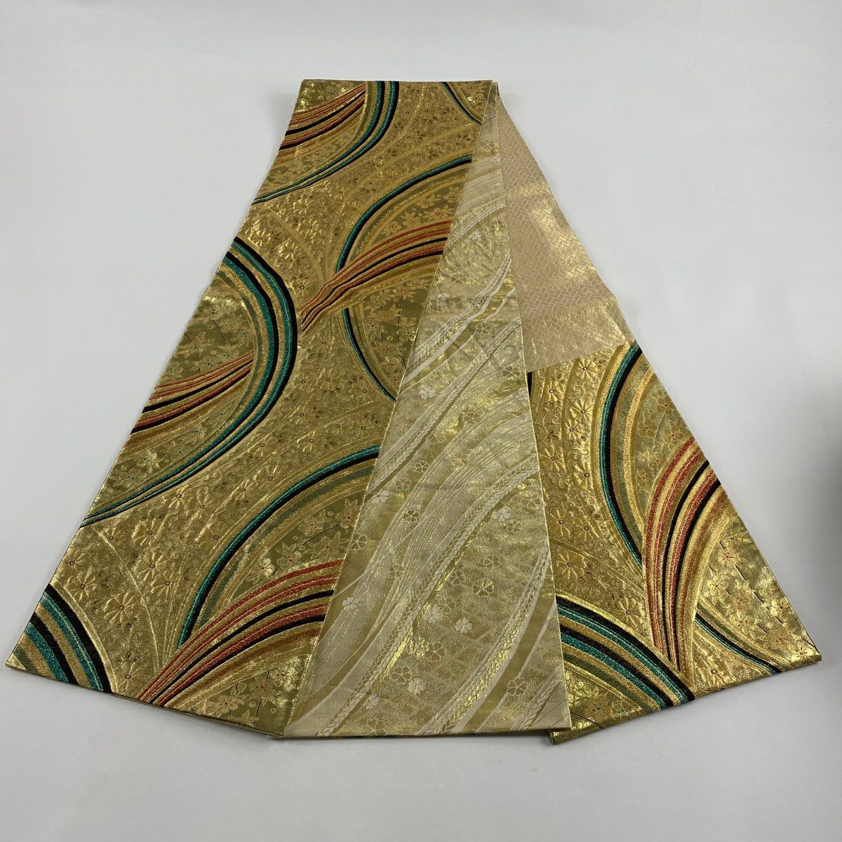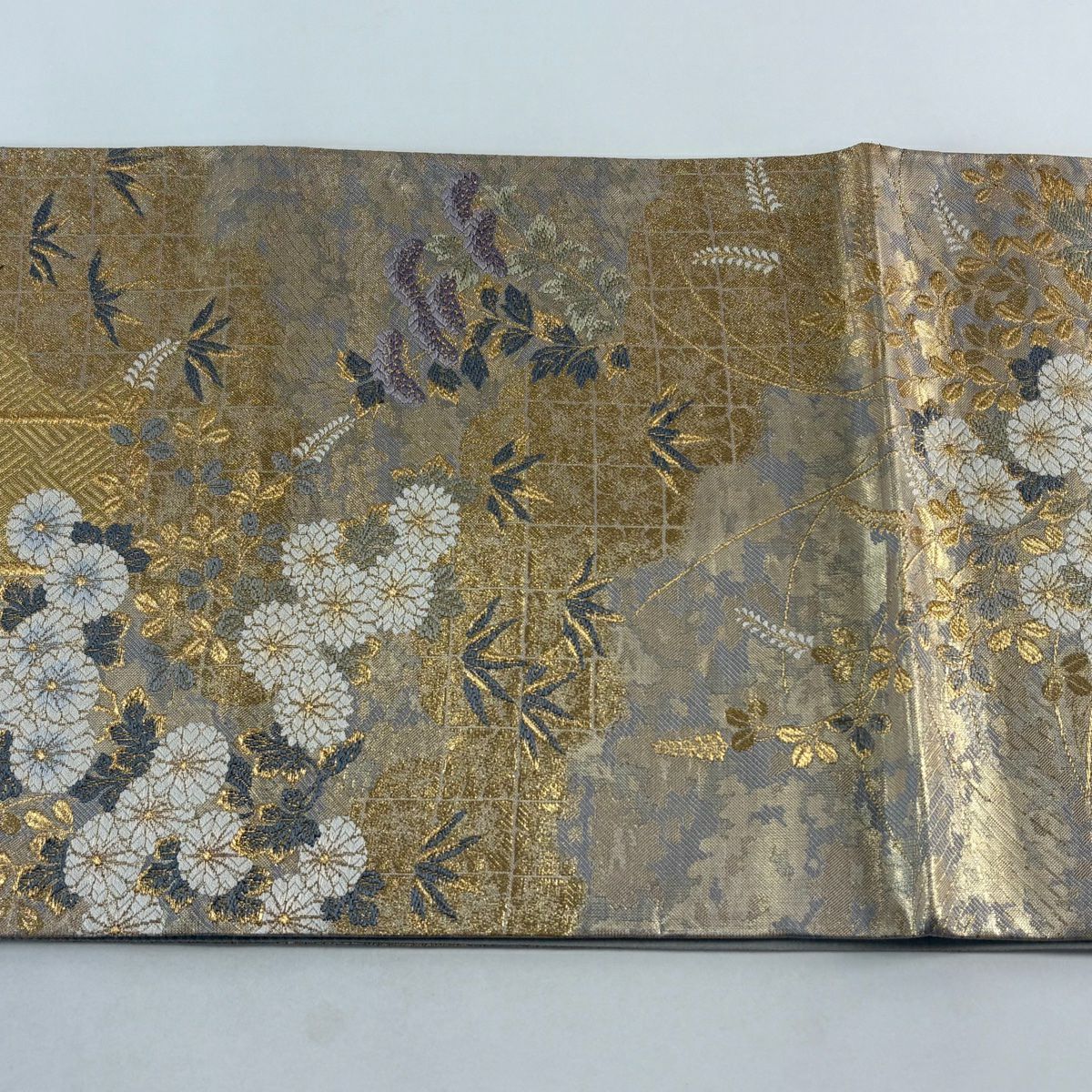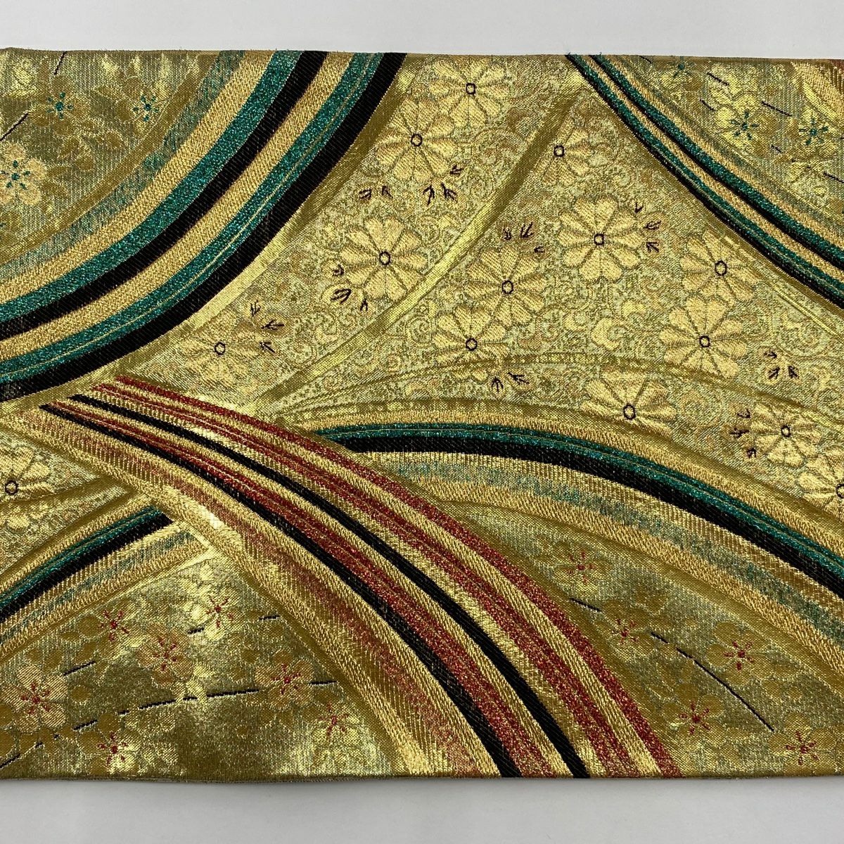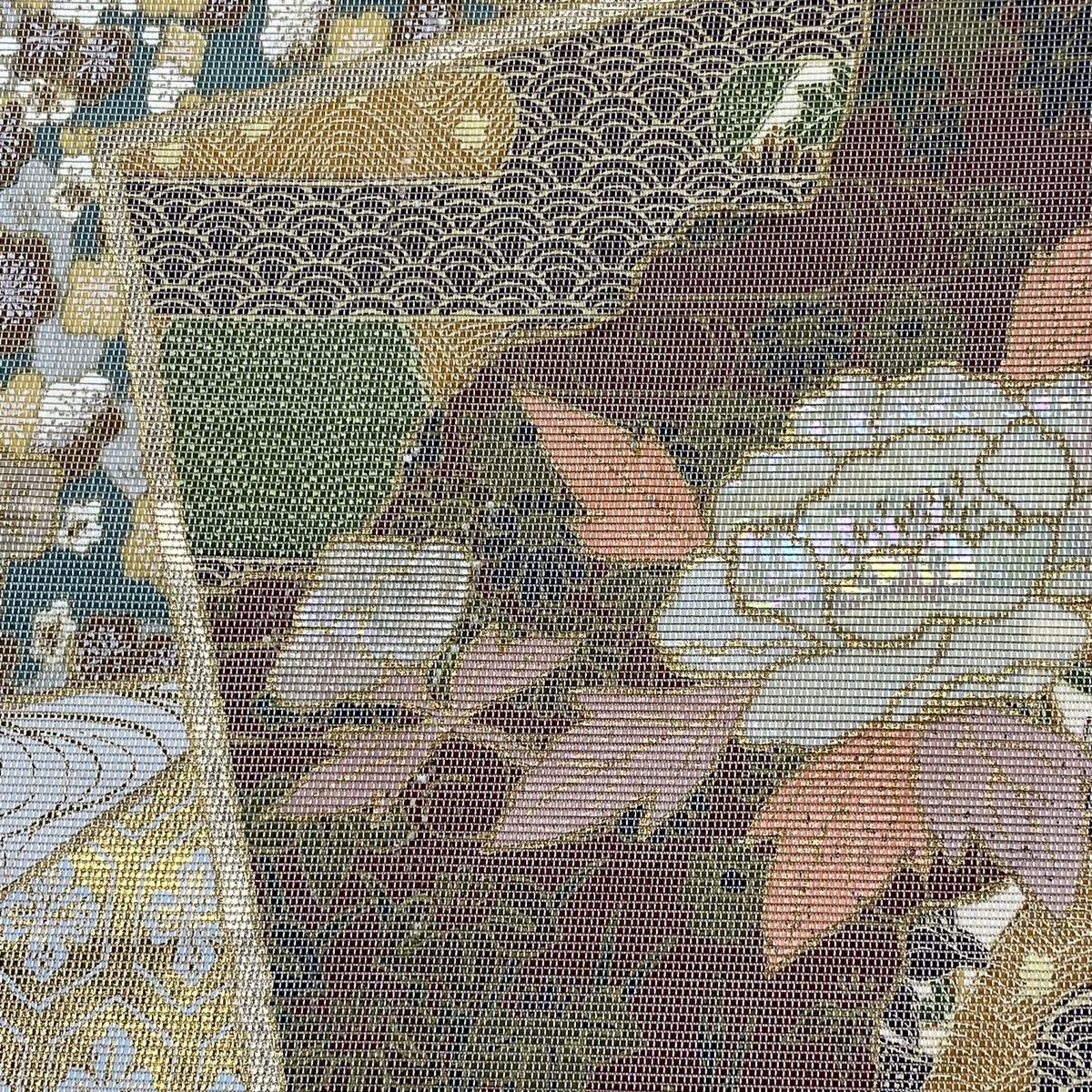 【在庫一掃】 袋帯 秀品 振袖向き 幾何学模様 草花 金糸 箔 金色 六通 正絹