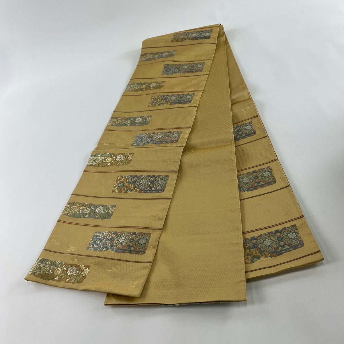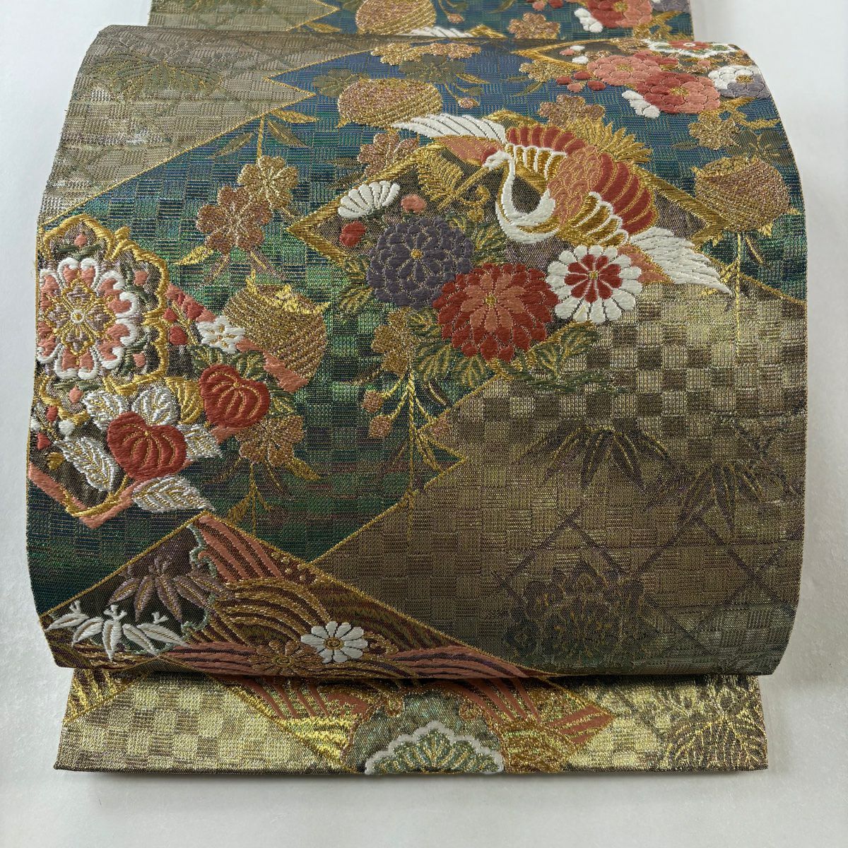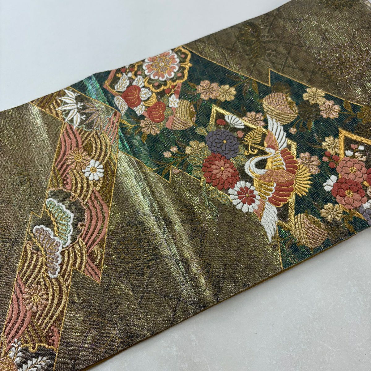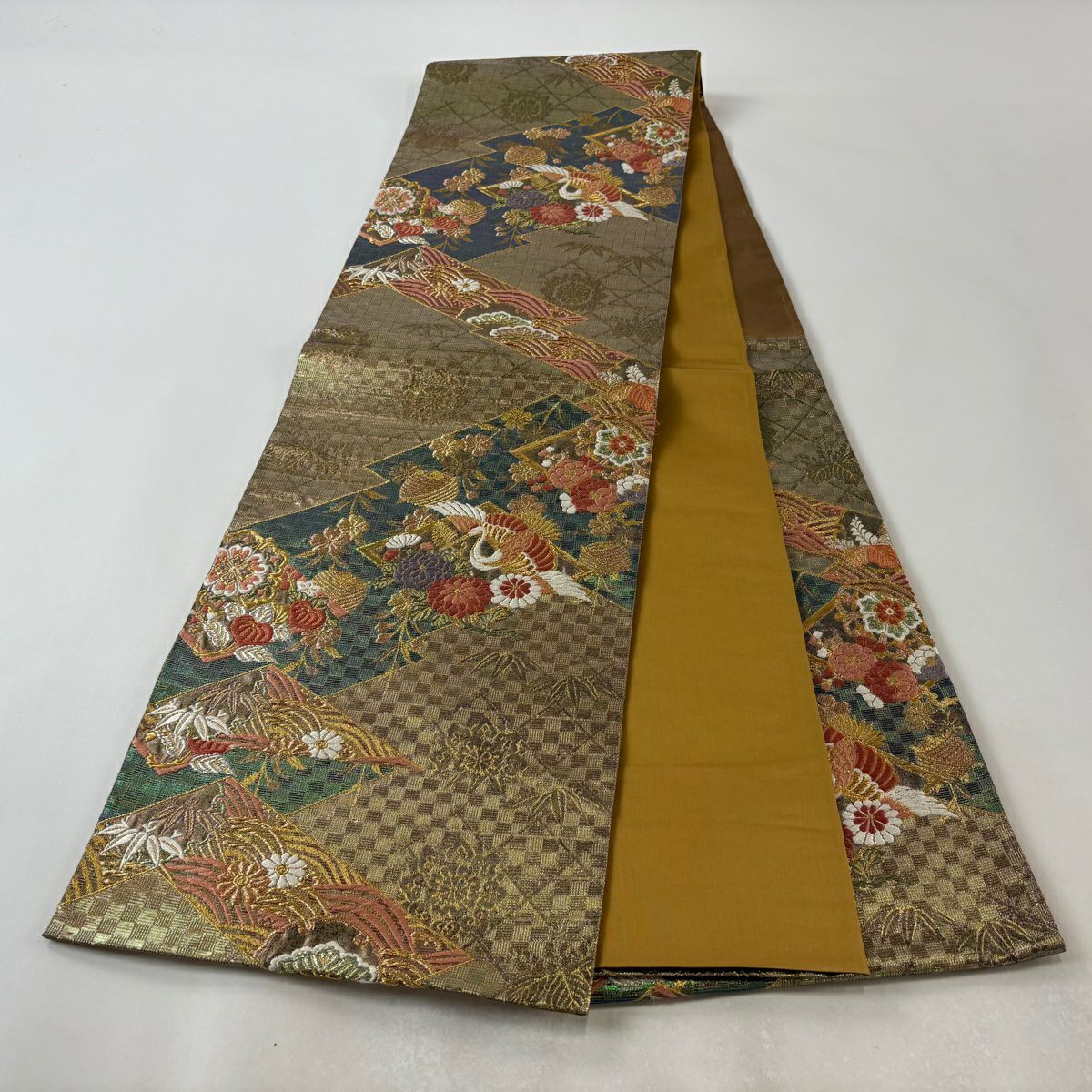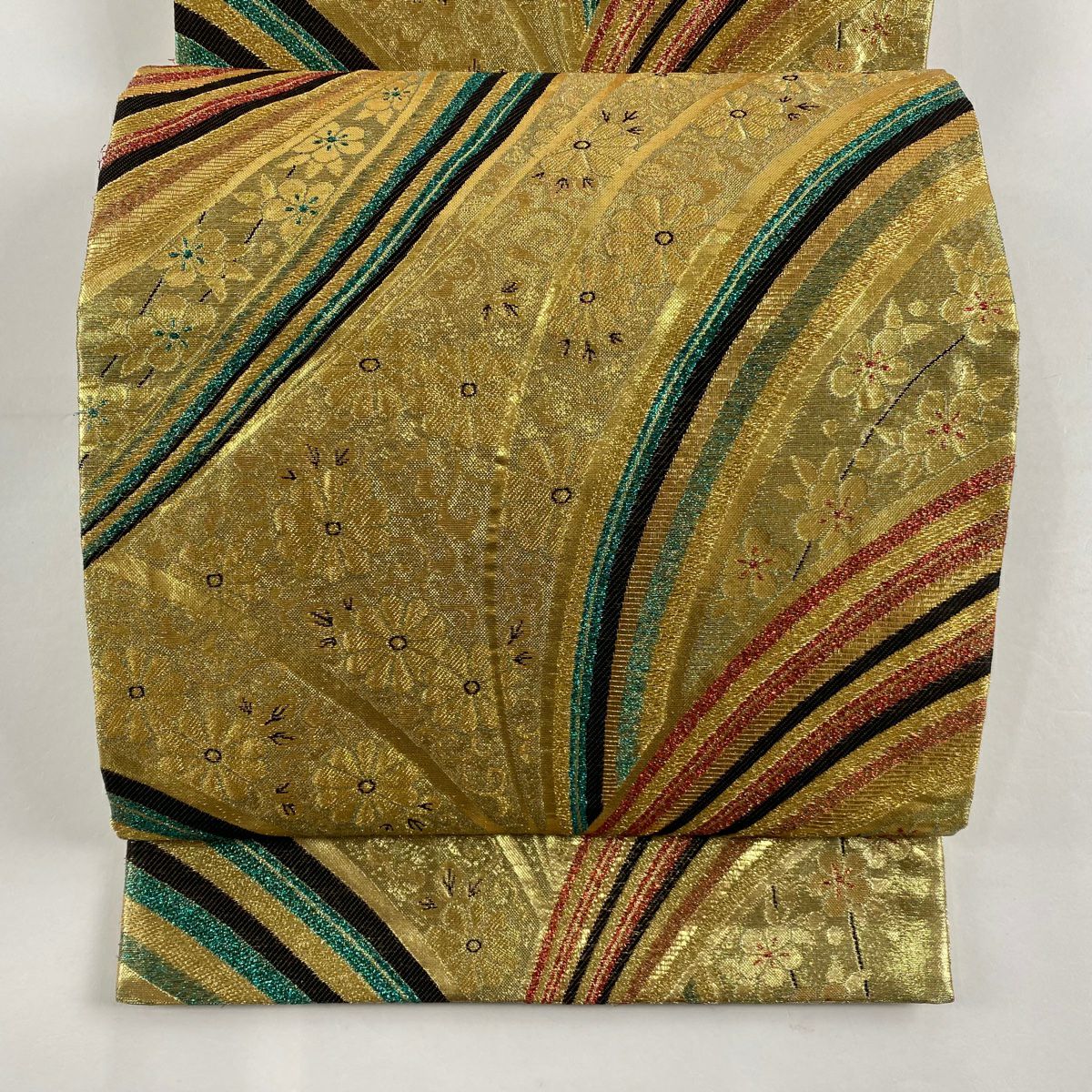 【在庫一掃】 袋帯 秀品 振袖向き 幾何学模様 草花 金糸 箔 金色 六通 正絹
