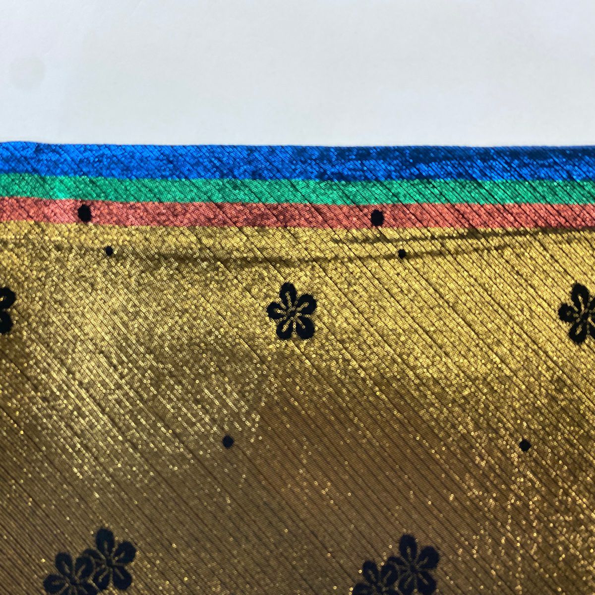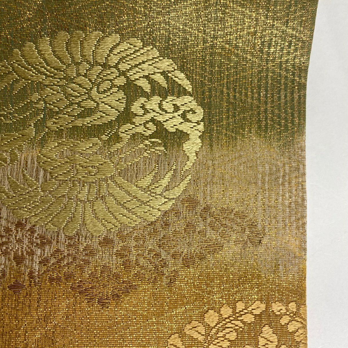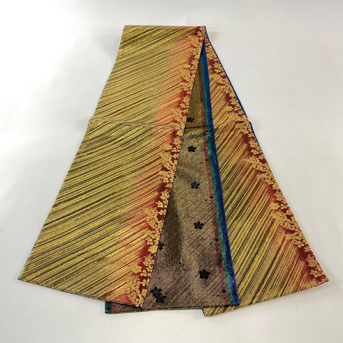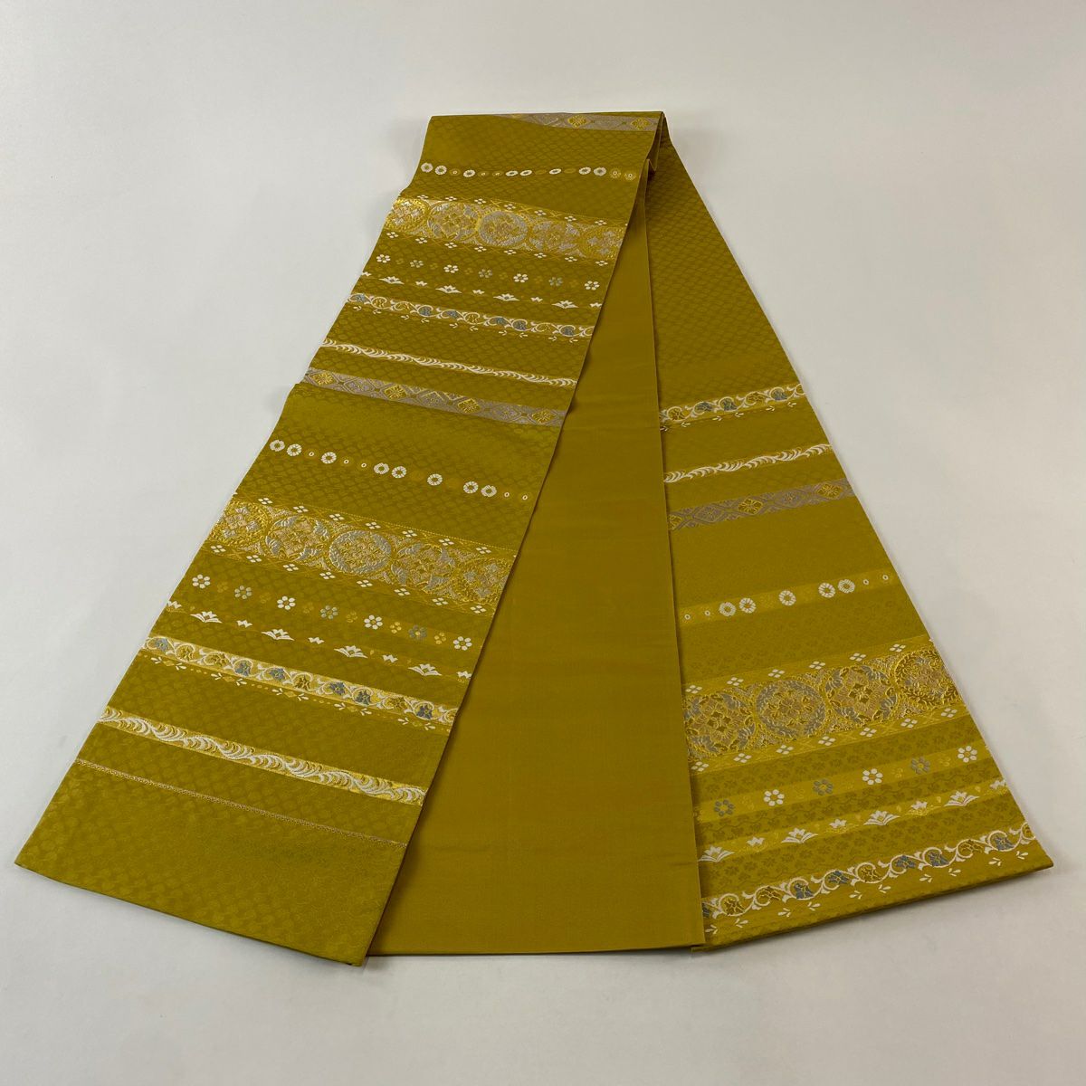 【在庫一掃】 袋帯 秀品 振袖向き 幾何学模様 草花 金糸 箔 金色 六通 正絹