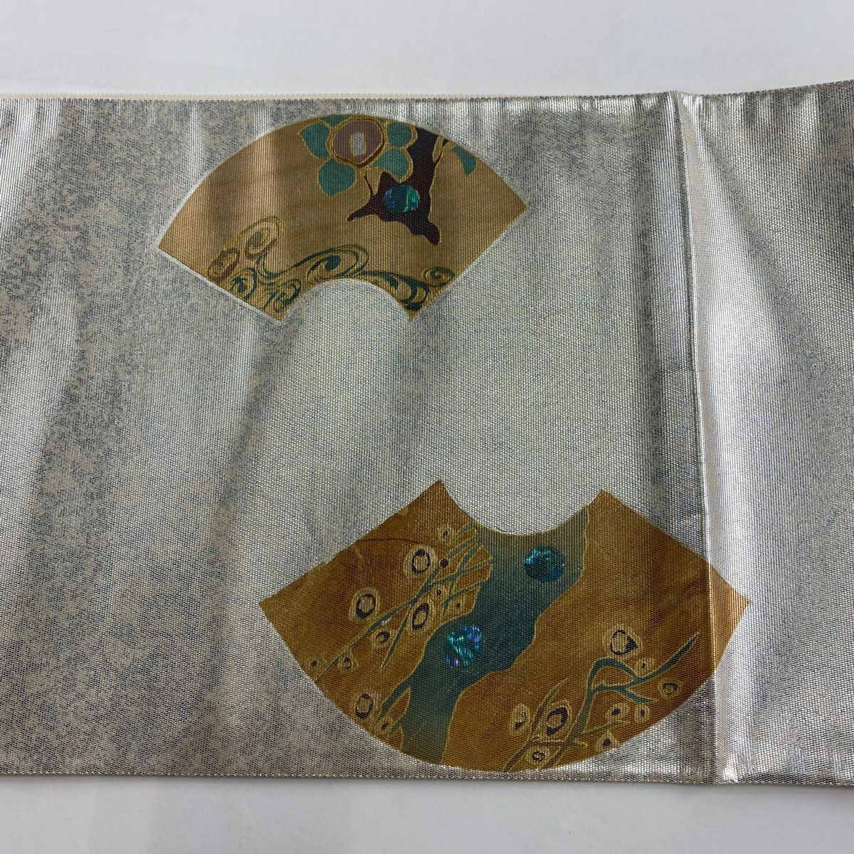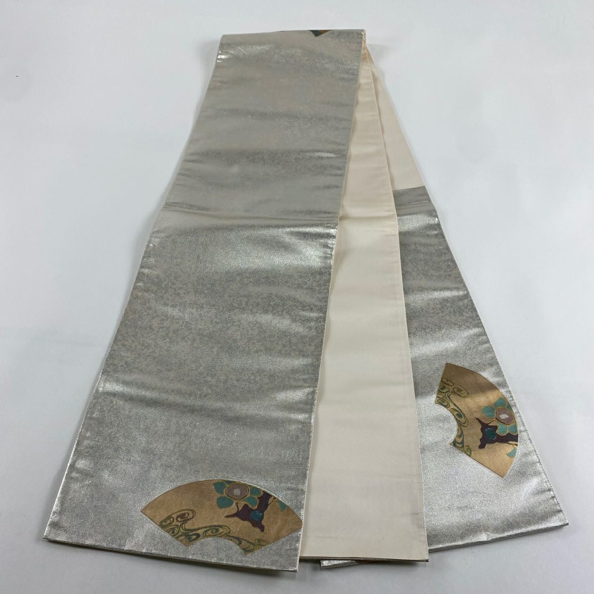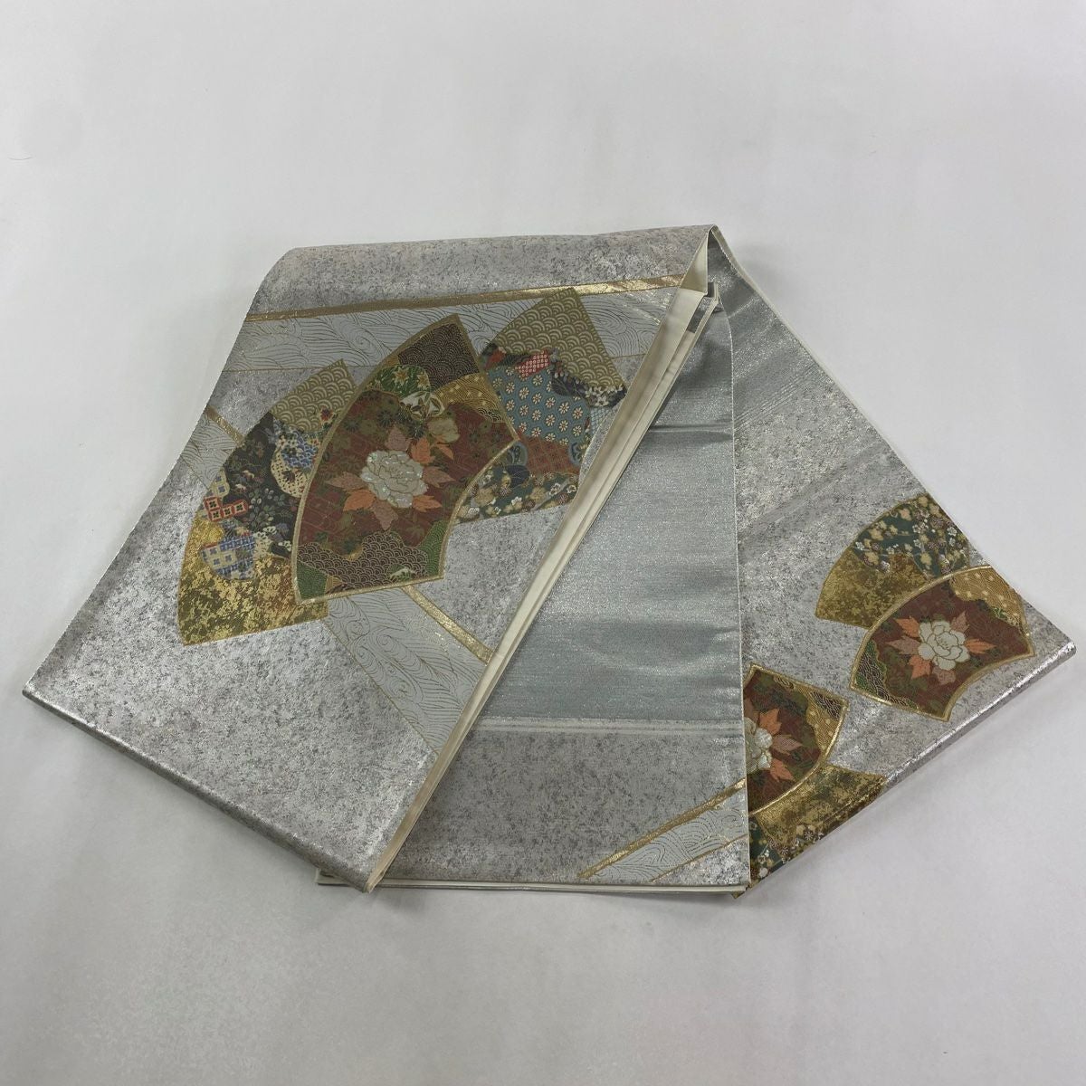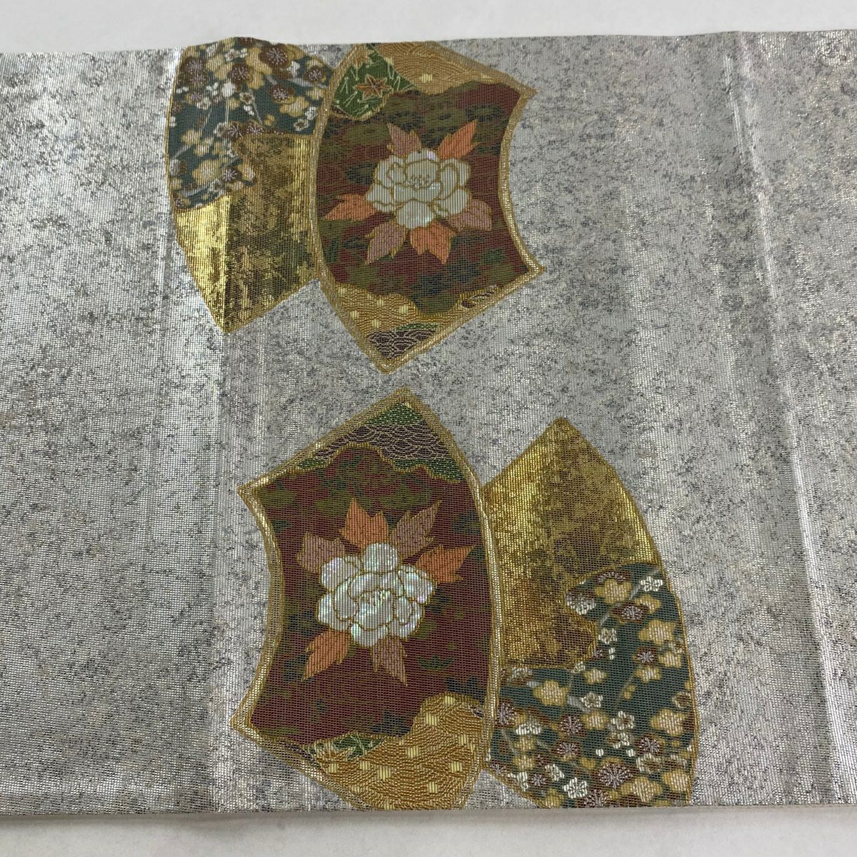 【在庫一掃】 【美品】 袋帯 秀品 扇面 枝花 箔 金銀彩 銀色 お太鼓柄 正絹