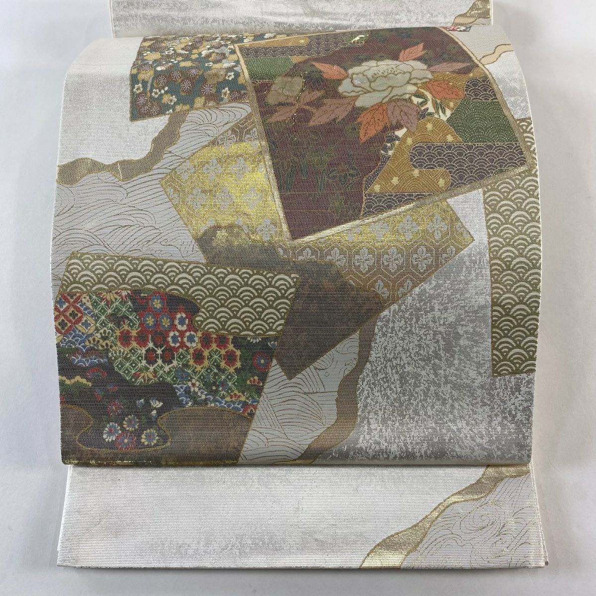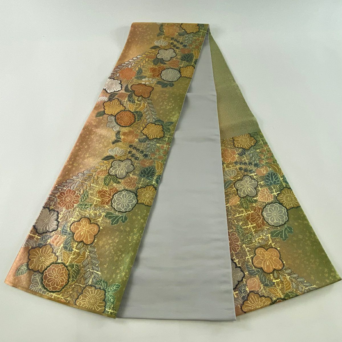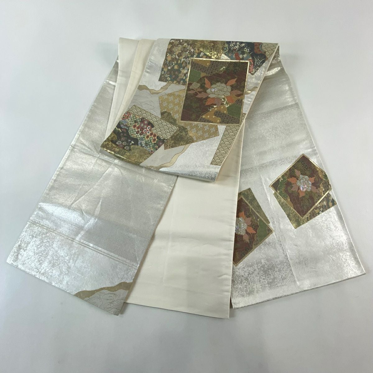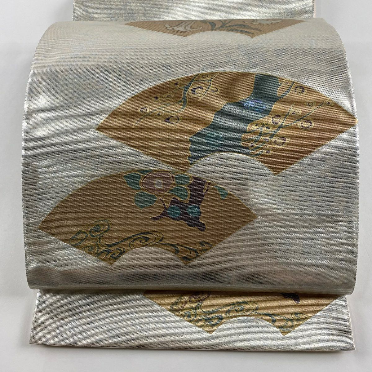 【在庫一掃】 【美品】 袋帯 秀品 扇面 枝花 箔 金銀彩 銀色 お太鼓柄 正絹