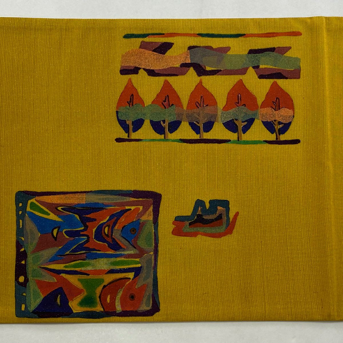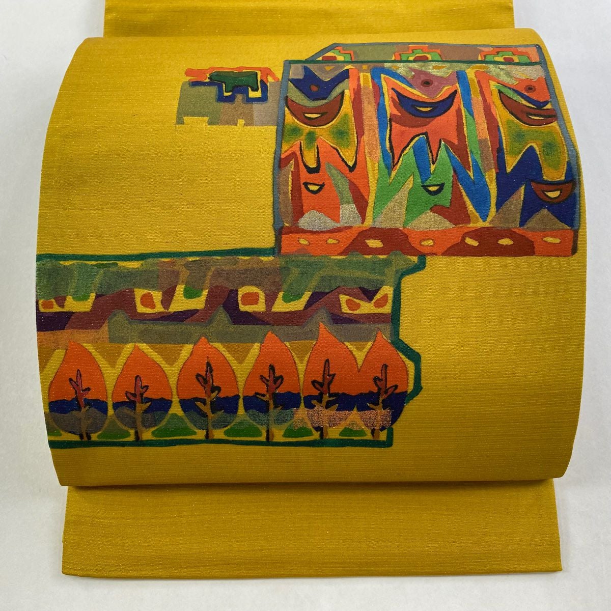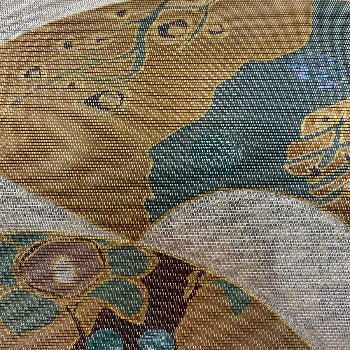 【在庫一掃】 【美品】 袋帯 秀品 樹木 魚 金通し 彩 黄土色 お太鼓柄 正絹