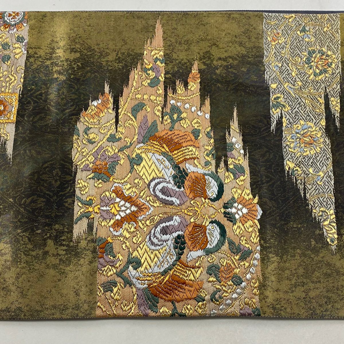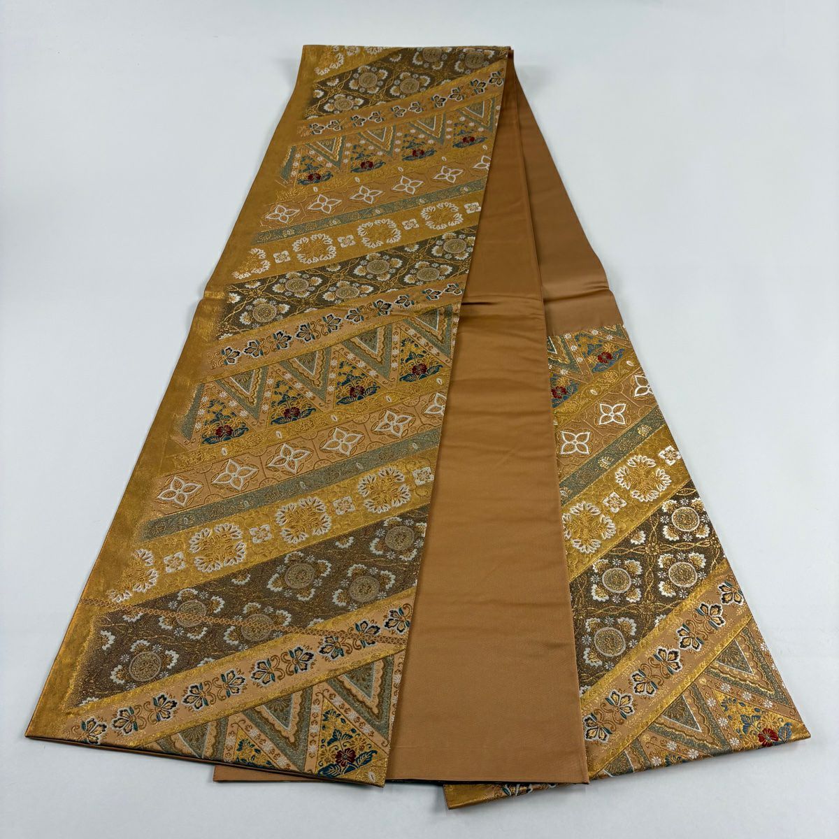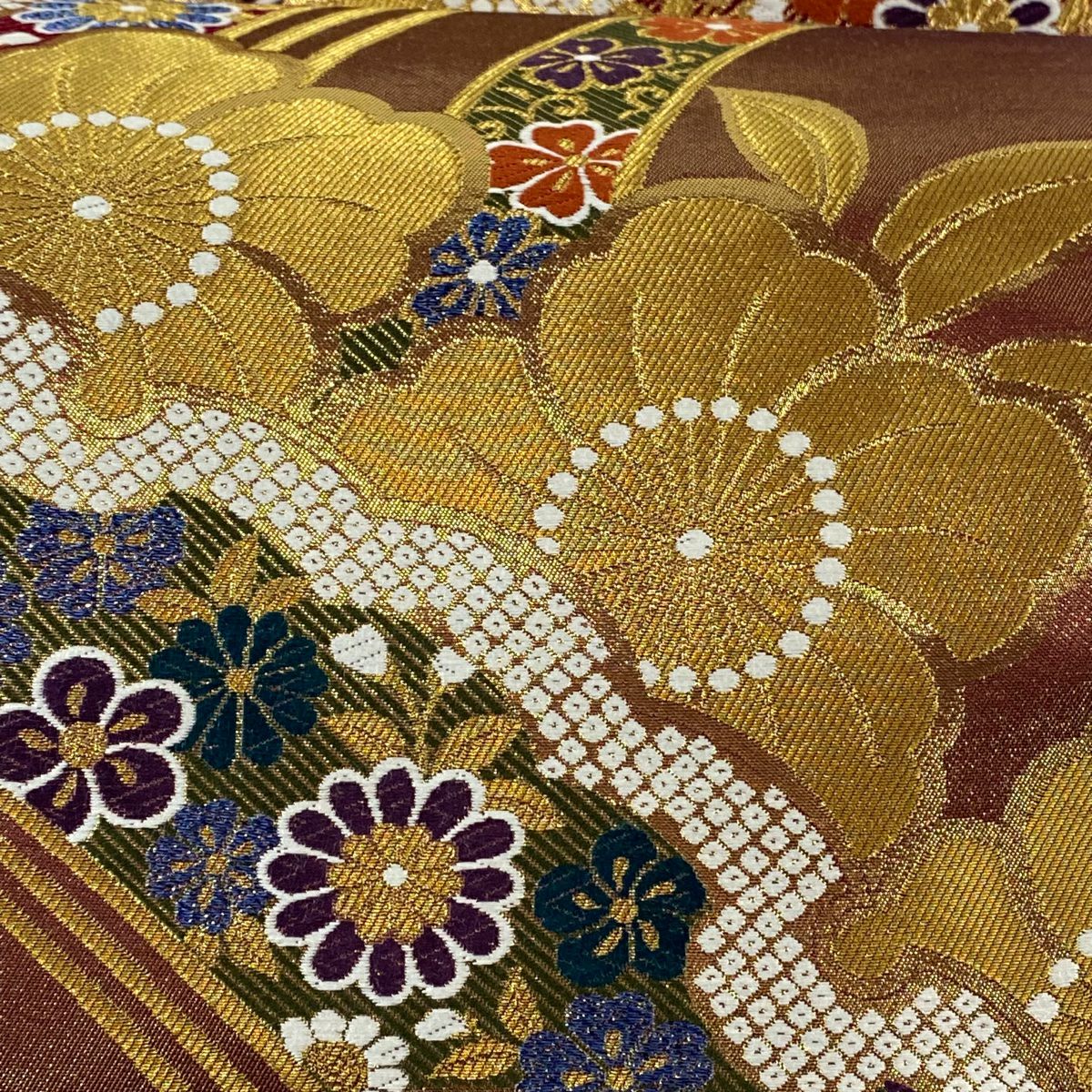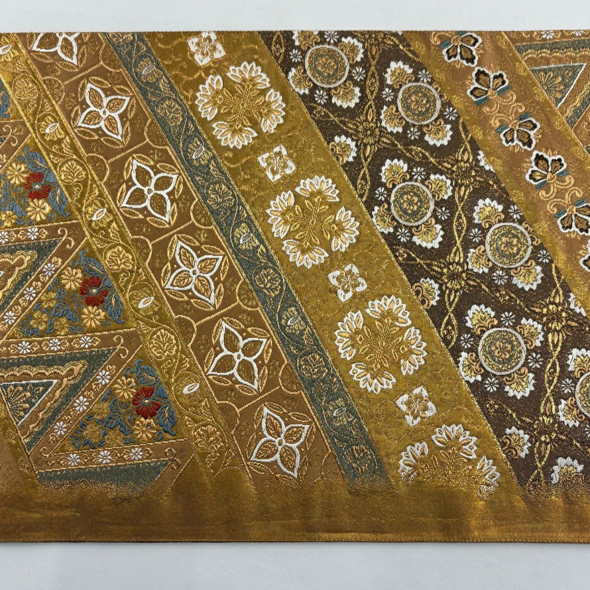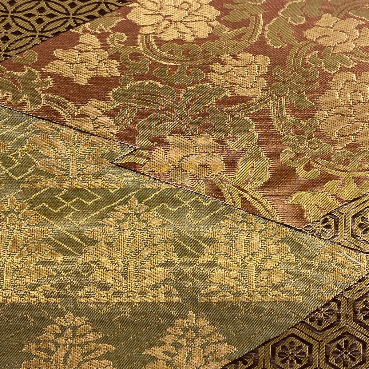 【在庫一掃】 袋帯 秀品 斜取異更紗段文 華文 草花 箔 金糸 金茶 六通 正絹