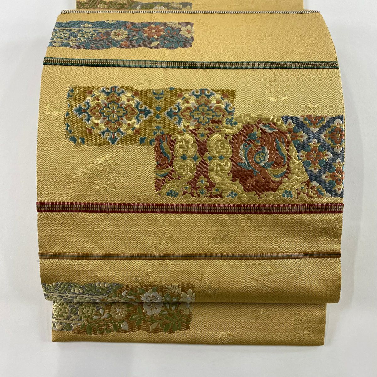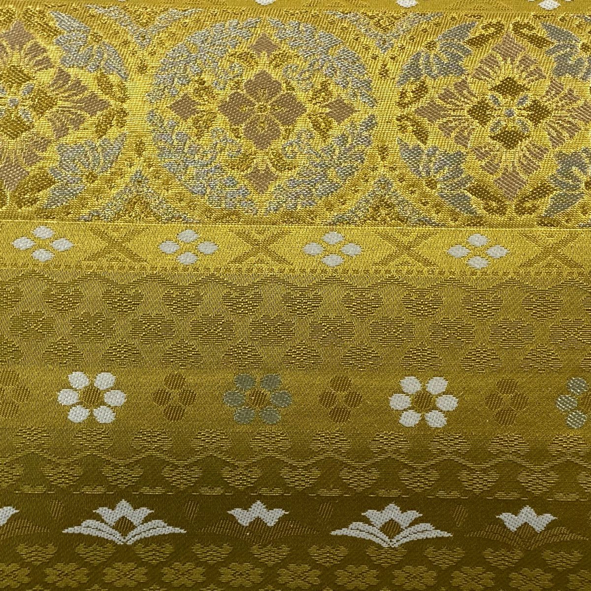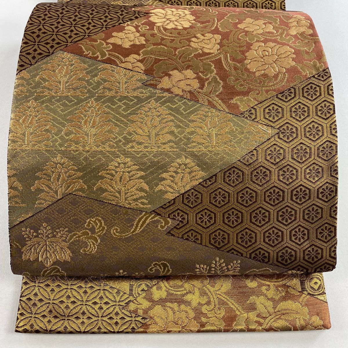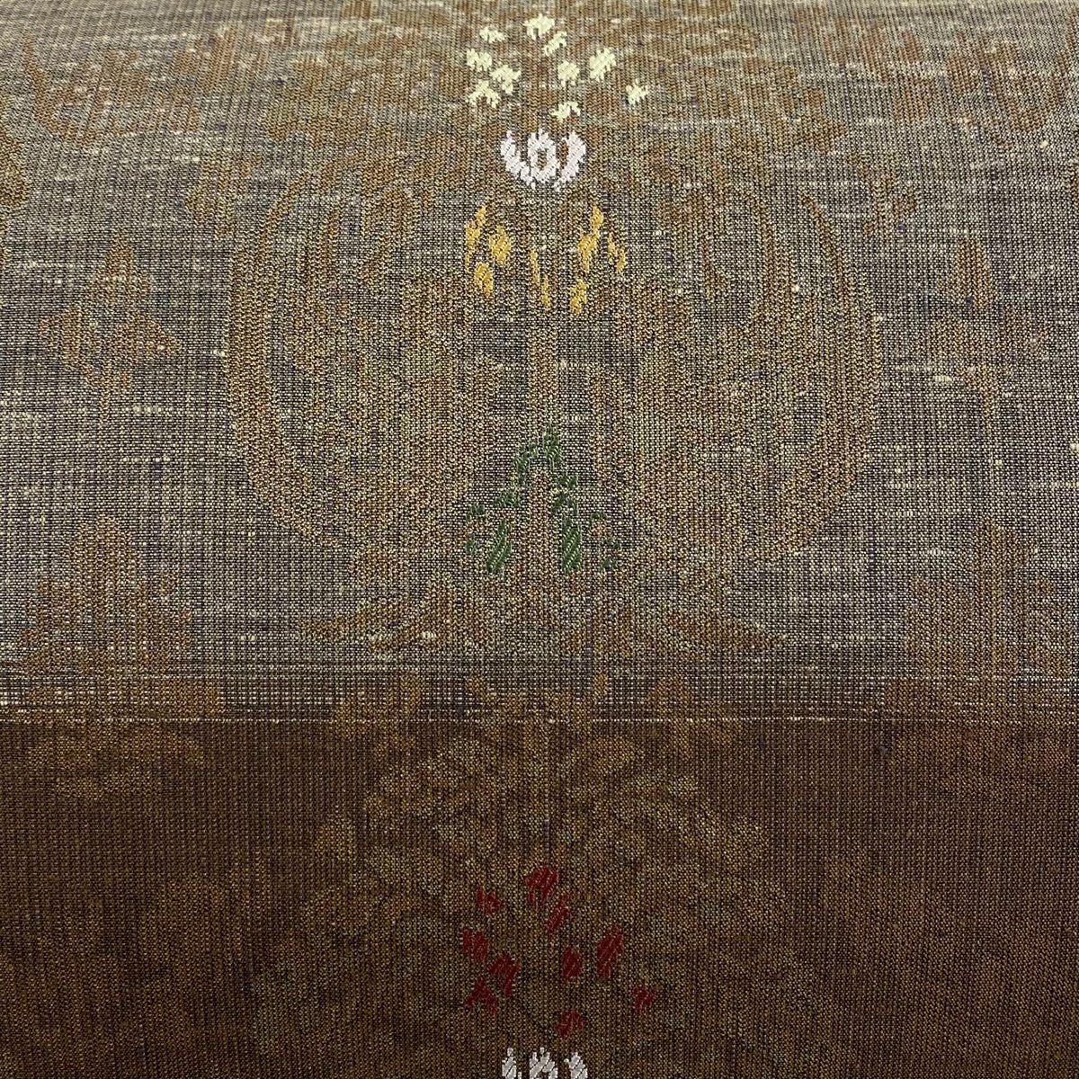【在庫一掃】 袋帯 秀品 斜取異更紗段文 華文 草花 箔 金糸 金茶 六通 正絹