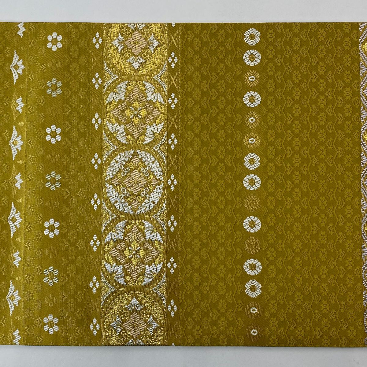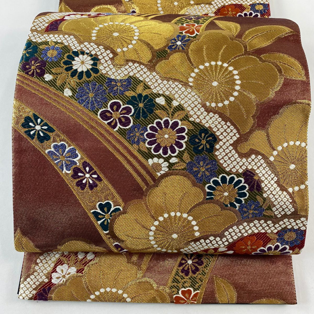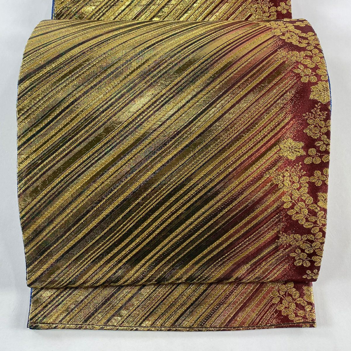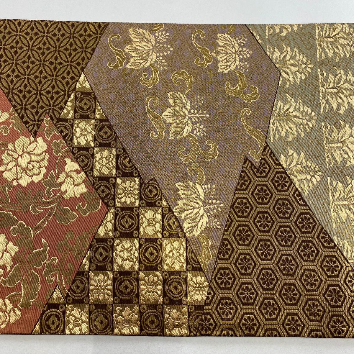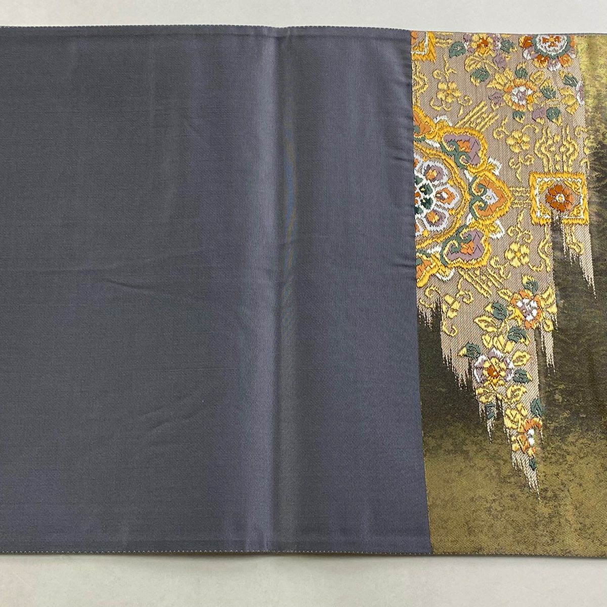 【在庫一掃】 袋帯 秀品 斜取異更紗段文 華文 草花 箔 金糸 金茶 六通 正絹